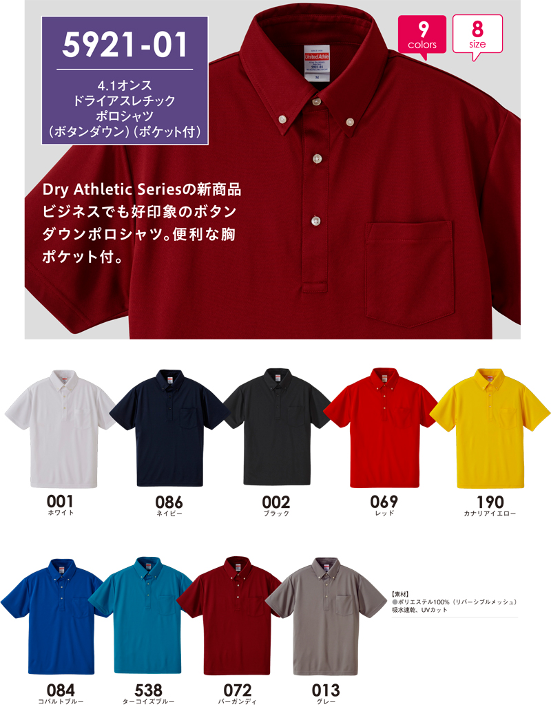 | 商品名 | United Athle ユナイテッドアスレ 4.1オンス ドライ アスレチック ポロシャツ (ボタンダウン)(ポケット付) |