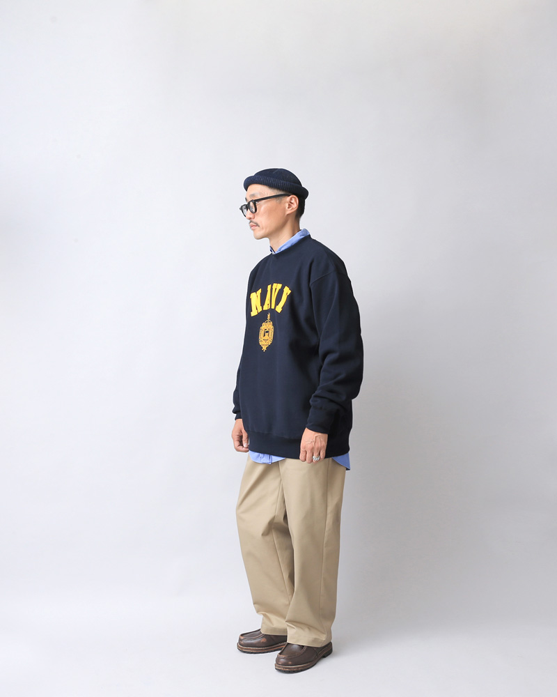 アメリカ合衆国メリーランド州アナポリスにある「アメリカ海軍兵学校(United States Naval Academy)」のオフィシャルライセンスプリントを施したカレッジスウェットです。 生地は80年代のスポーツブランドに多く見られるコットン×ポリのヘビーオンススウェット生地がベースで、生地を横目に使用しサイドに切り返しを配したリバースボディを採用。2本針縫製で、スポーティーなルックスそのままにタフな作りになっています。 フロントにはアメリカ海軍を象徴するグラフィックとバックにはNの文字を大きく配置するなど、インパクトのあるデザインに仕上げています。 ゆったりとしたサイズ感は男女ともにトレンド感ある着こなしが可能。丈夫で洗濯を繰り返しても型崩れしにくいので、ユーズド感が出るまでガンガン洗って着倒すことができます。 シンプルなデザインとシルエットで、スポーツやアウトドアシーンはもちろんのこと、キレイめのアイビースタイルにもマッチします。 |
