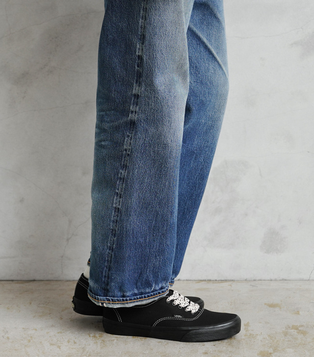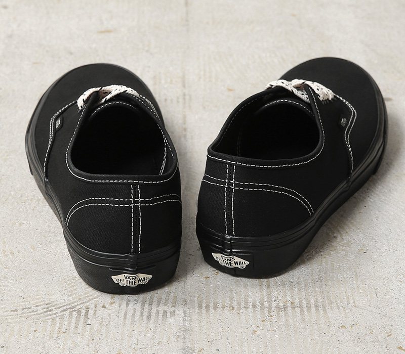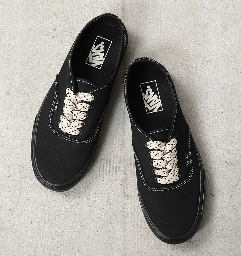 1966年にリリースされたブランドの原点である「AUTHENTIC」。 その名の通り極めてシンプルで、ミニマルなデザイン。シンプルだからこそ甲やヒールにあしらわれたダブルステッチがアクセントになり、さりげなくサイドに配置されたVANSのロゴ入りタグもポイントになっています。また、フラットなソールにはVANSの特徴の一つであるワッフルソールが備えられ、他にはない高いグリップ力を発揮します。アッパー部分はローテクスニーカーの王道であるキャンバスを採用。無駄な装飾がなく、ソールまでオールブラックのソリッドなボディにアイボリーのステッチ、黒のドット柄が入ったかのようなシューレースが遊び心を感じさせ、定番を好みつつも、自分らしいアレンジを楽しむことができます。VANS創業当時から継続する息の長いモデル。オーソドックスだからこそ、アメカジ、ワーク、ミリタリー、SK8、モードなど幅広いスタイリングにおいて相性抜群。