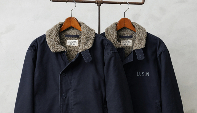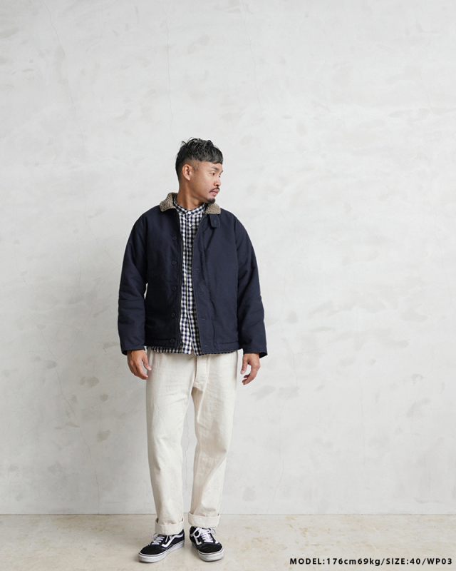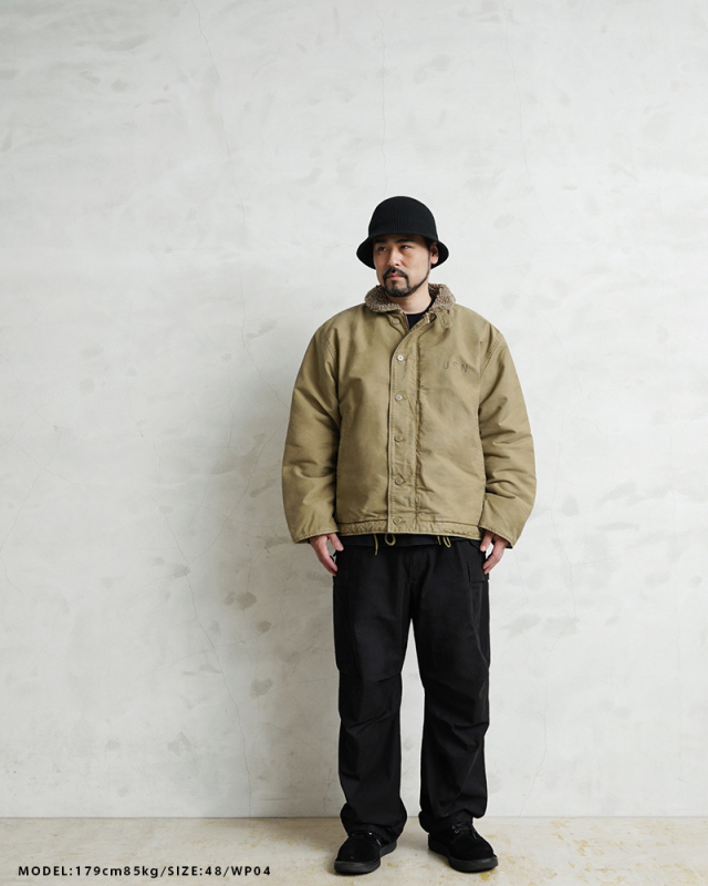 | 商品説明 | 米海軍 U.S.NAVY N-1 デッキジャケット USED加工 SOLID&U.S.Nステンシル WAIPER.inc のご紹介です。 制式名称:N-1 DECK JACKET 品番:WP03,WP04 米海軍(U.S.NAVY)が生んだ傑作として名高く、多くのファンを魅了するミリタリージャケット「N-1デッキジャケット」をWAIPER.incが復刻再現! 当店でもブランドスタート当初から続くロングセラーアイテムとなります。 デッキジャケットという名が示すとおり、N-1はアメリカ海軍の甲板作業用として採用されたミリタリーウェア。 冬の海上における猛烈な寒さに耐えられるようにデザインされたジャケットがベースとなっており、言うまでもなく最高クラスの防寒性を発揮します。 袖口は段リブによってフィット感を高めたインナーカフス、裾には体型に合わせて絞り具合を調節出来るドローコード、ジッパーエレメント(歯)の腐食防止と隙間風を防ぐフロントのウインドフラップ、スタンドカラーでも着用できるチンストラップ付きの襟など、寒さを防ぐ工夫が各所になされています。ライニングは体温を逃さないよう袖先までボアで仕立てられており、抜群の保温性を発揮します。 表地にはジャングルクロスと呼ばれる高密度に織られたコットンファブリックを採用。着こむほどに体に馴染む風合いが魅力です。 防寒性に優れたライニングはアルパカを数年着込んだような、ボアフリースを使用。肌触りもよく、ウール特有のチクチク感が無く直接肌に触れても気持ちの良い着心地となっています。 こちらは手元に届いたときから長年着こんだような風合いが魅力のUSED加工に、ステンシルの有無が選択可能。カラーは定番のTAN、さらに古い年代で採用されていたNAVYの二色展開。 ヴィンテージを再現したU.S.Nのステンシル有りはもちろん、シンプルなデザインがお好きな方にはステンシル無しもおすすめです。 デニムやチノパンなど定番のボトムスとも相性抜群なので、普段の着こなしに羽織るだけでサマになるジャケットとなっています。 N-1デッキジャケットとは 1943年に制式採用された、アメリカ海軍を代表する甲板作業用のジャケット。初期型のシェルには太畝のコットンピケ、後期型からはジャングルクロスと呼ばれる細畝のコットンピケを採用。ライニングは防寒性・耐久性に優れたアルパカ(後にアルパカ×ウールの混紡に変更)となり、艦上や港での隠蔽性を考慮して後期型からはネイビーからタン(カーキ)へとカラーを変更。高い防寒性と完成度の高さが水兵達に高く評価され、一部では1960年代の初め頃まで使用され続けたミリタリージャケットの名作。 |