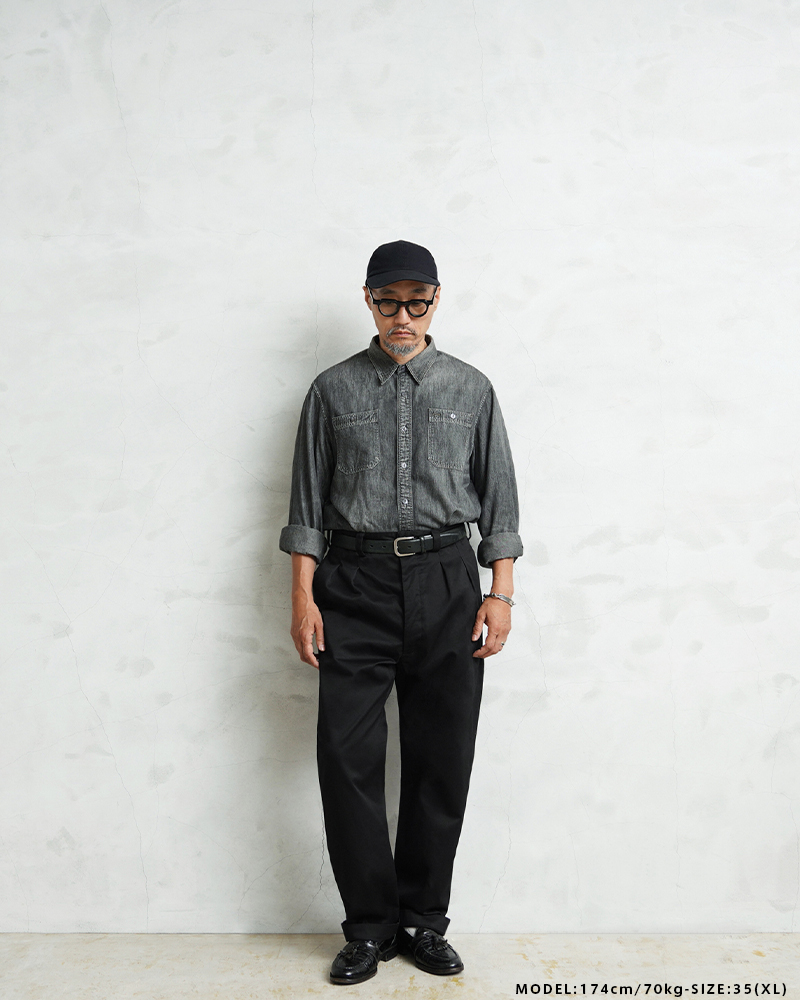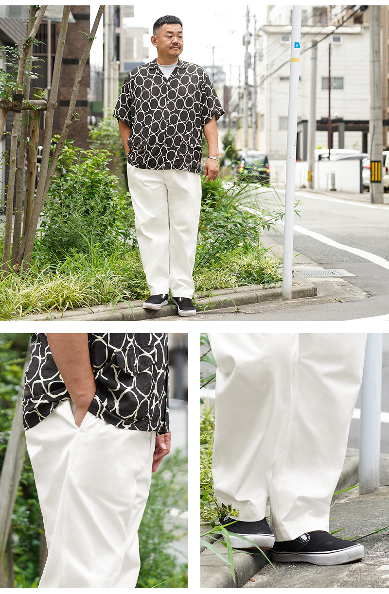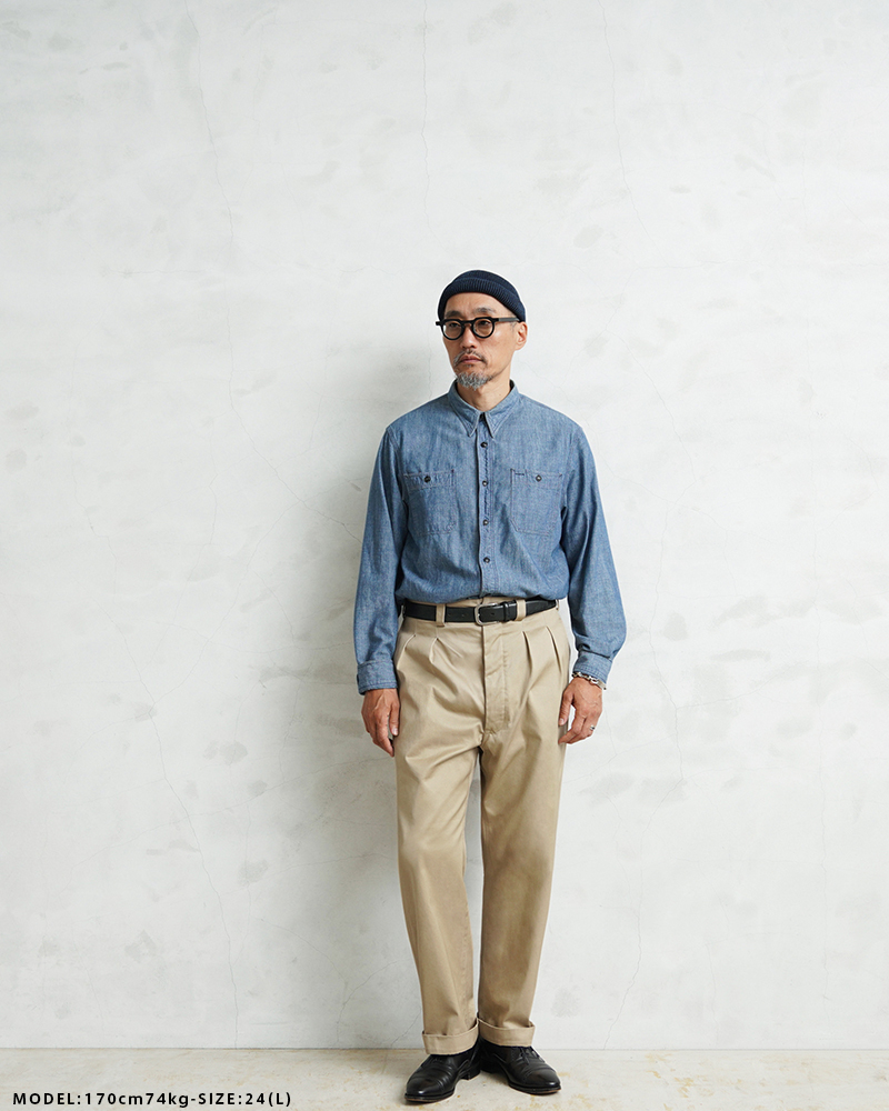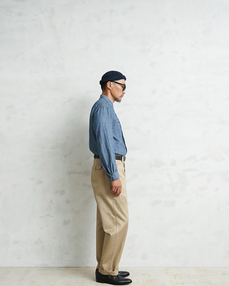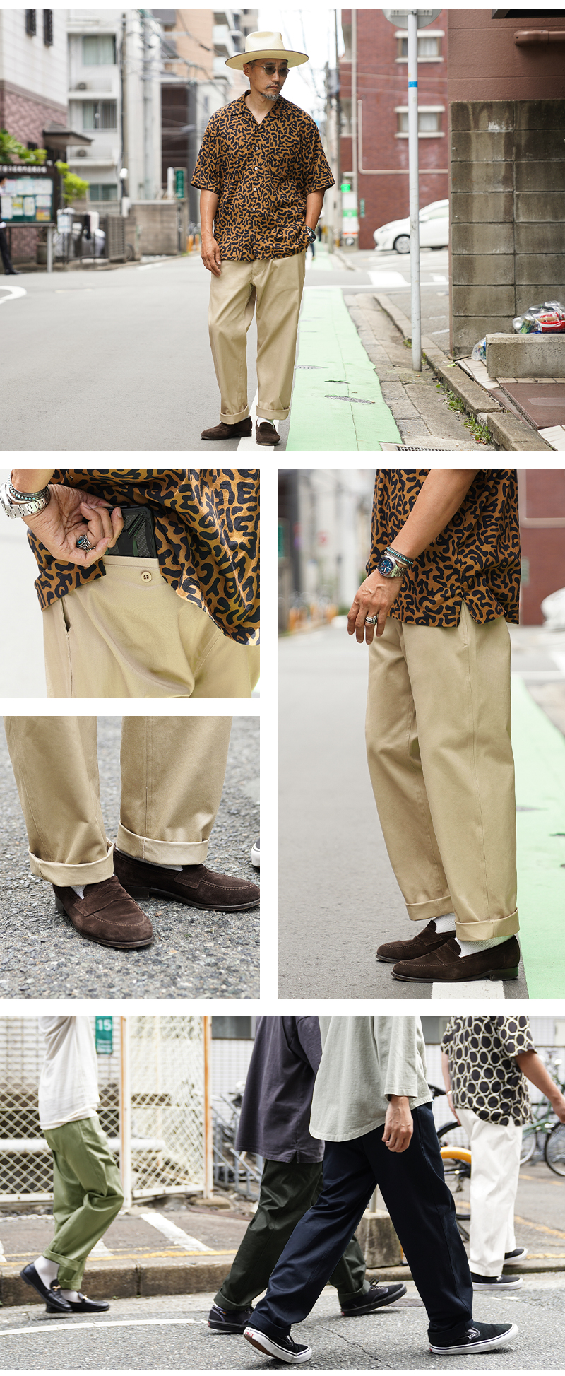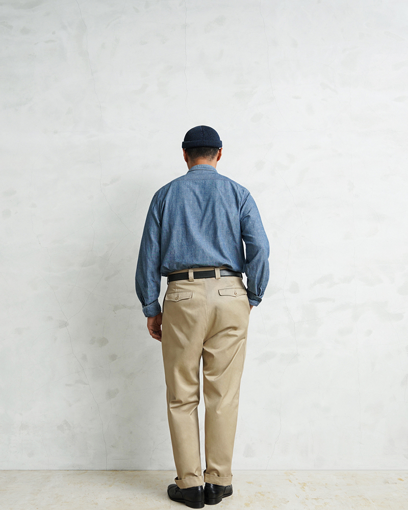フランス軍の名作パンツのひとつであるM-52チノトラウザーをWAIPER.incが素材にこだわり忠実再現! M-52は1950~1960年代にかけてフランス軍に採用されていたボトムスで、タックの入ったゆったりとしたヒップ周りと、太めのルーズストレートシルエットが特徴です。 ルーズ目なシルエットはロールアップした時のバランスが大変よく、ジャストで履くのはもちろん、オーバーサイズをウエストを絞って履くことにより、よりワイドなシルエットをお楽しみ頂けます。股下も70cmと75cmと選べる2サイズとなっています。