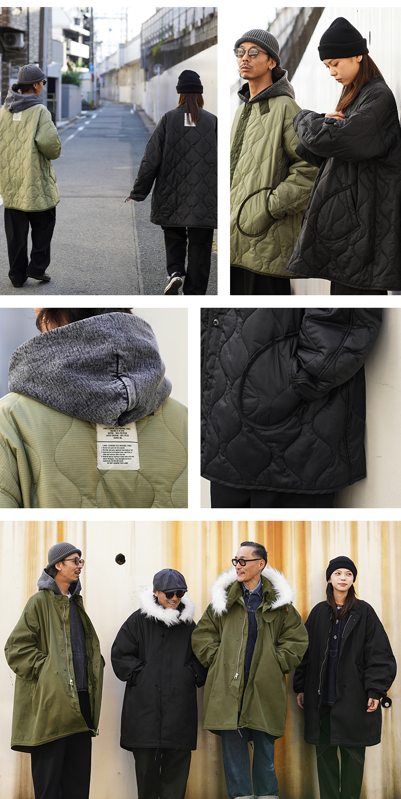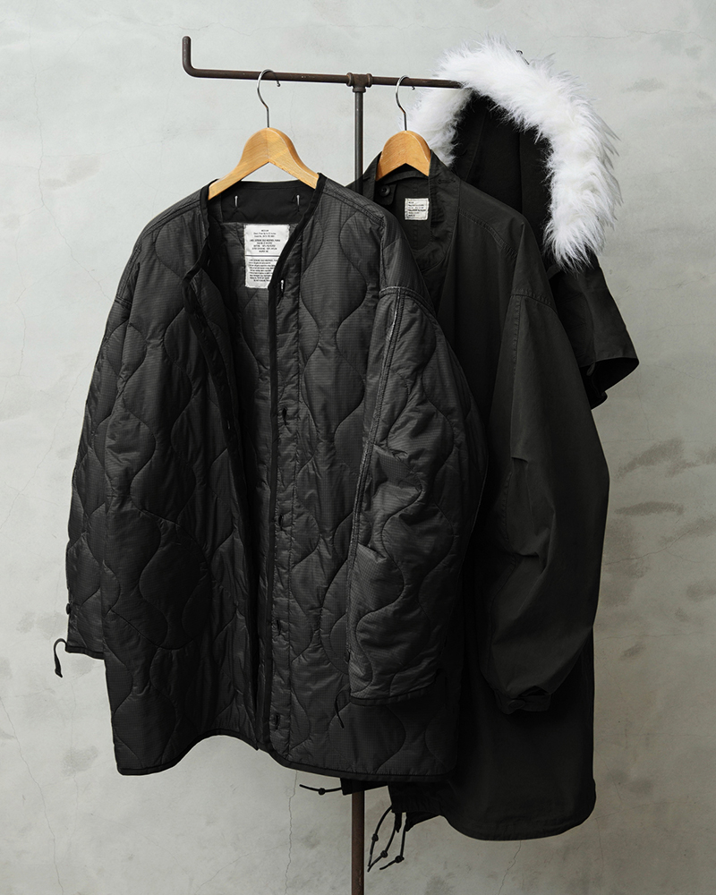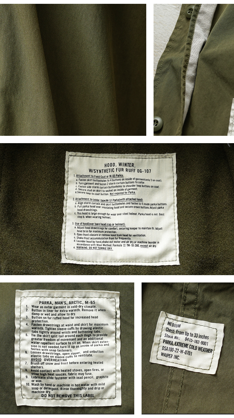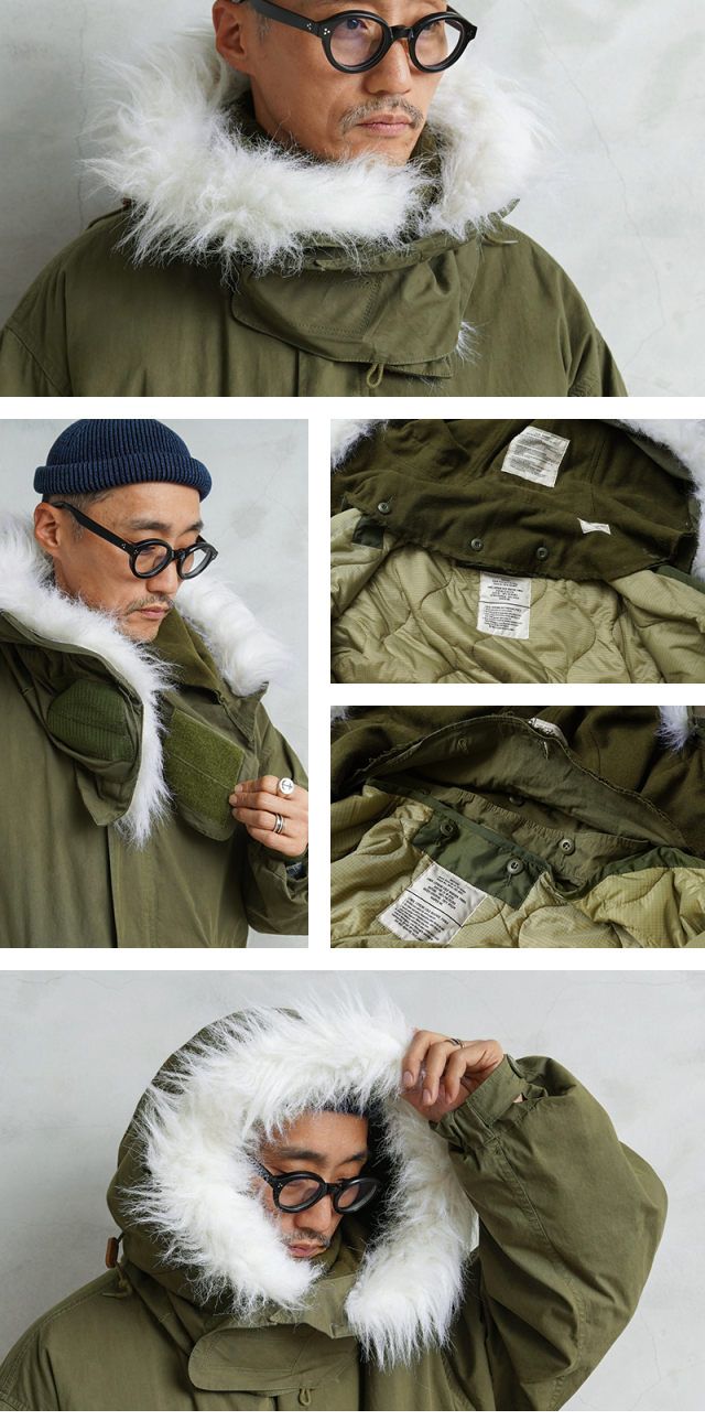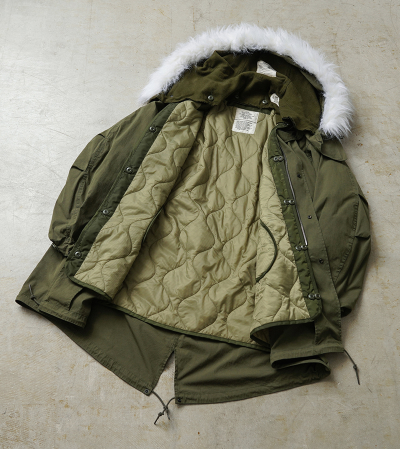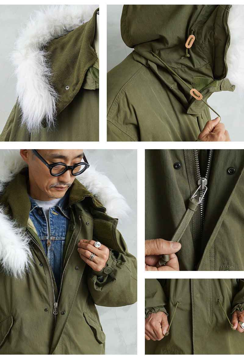通称モッズコートと呼ばれる米軍のフィールドパーカーM-51の後継モデルとして、1965年に採用されたフード部分とライナーが脱着式のフィールドパーカーでシェル、ライナー、フードのフルセットをWAIPER.incで忠実に復刻させていただきました。 シェル、ライナー、フードが独立しており、フルセットで着用すれば真冬の完璧な防寒アウターに。気温や用途によっては、フードやライナーを外してスタンドカラーのライトアウターとして、また近年ではライナー単体での着用も目立ちます。 今回、WAIPER.incでは初期に製造されていたアルミジップをサンプリングし、”ARCTIC”の名前が記されたインストラクションラベルや見返し裏の芯、共布のライナー取り付けタブなど細部にまで当時のディテールを再現しました。