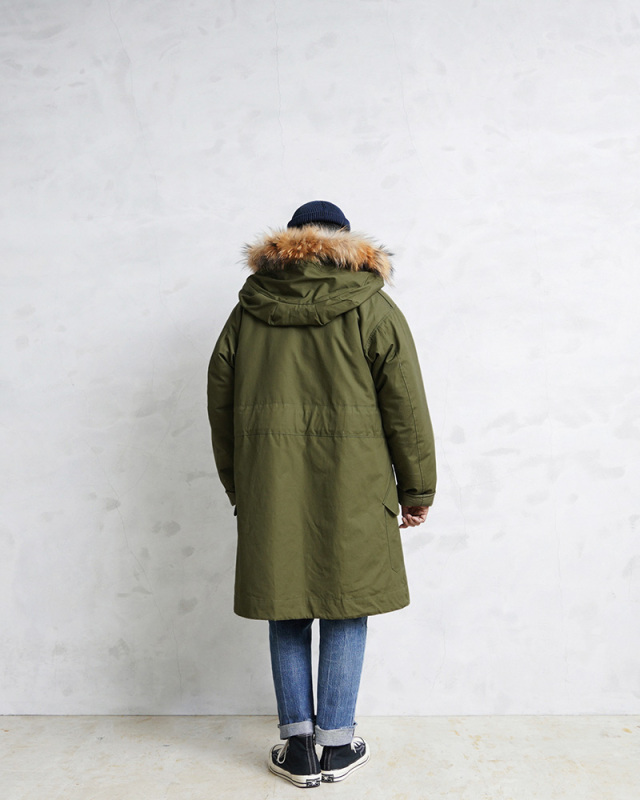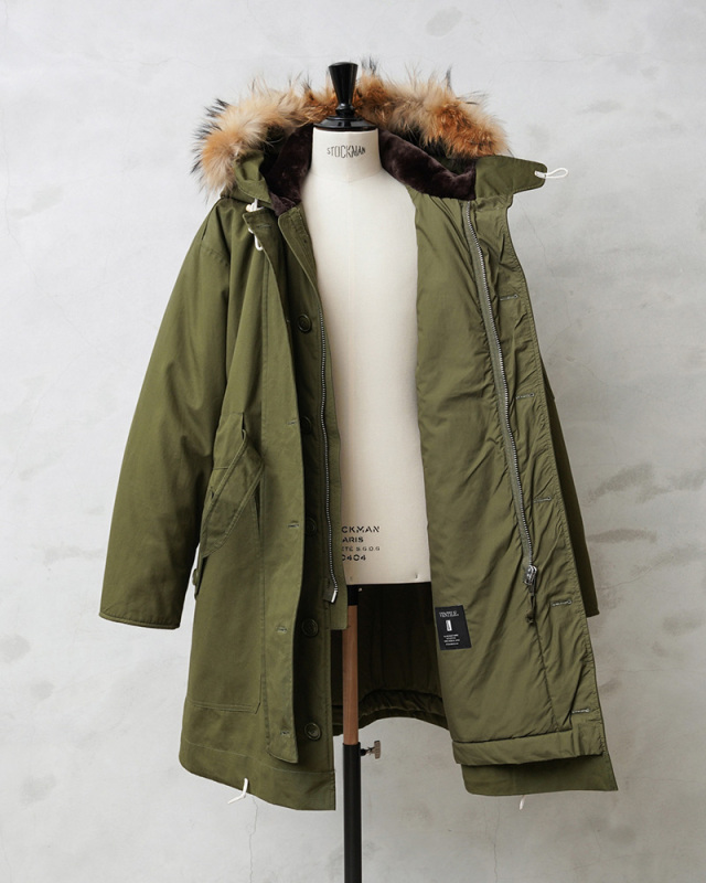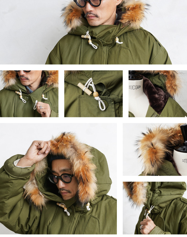 | 素材 | 表地:綿100% 裏地:綿100% ファー裏地:ポリエステル80%、羊毛20% 衿裏:羊毛ファー 襟ファー:ラクーン |