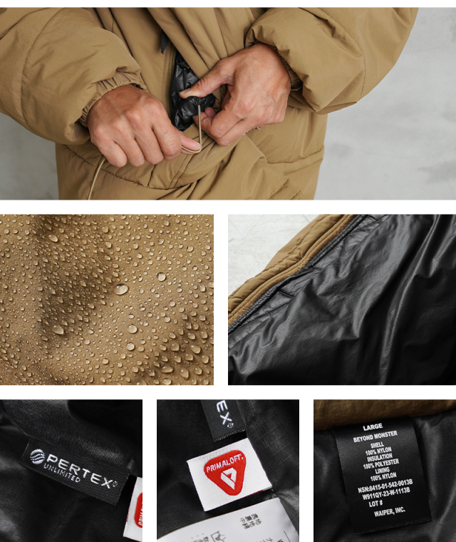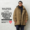 | 商品説明 | 米軍 SPECIAL FORCE PCU LEVEL7 PRIMALOFT モンスターパーカー PERTEX UNLIMITED WAIPER.incのご紹介です。 品名:BEYOND MONSTER 品番:WP1024 WAIPER.incより高機能素材PERTEX UNLIMITEDを使用した特殊部隊(SPECIAL FORCE)仕様のモンスターパーカーのご紹介です。 PCU(PROTECTIVE COMBAT UNIFORM)という名称で製作されたアイテムは、ECWCS(EXTENDED COLD WEATHER CLOTHING SYSTEM)と同様に気候に合わせてレイヤリングを調整する特殊部隊向けに考案されたレイヤリングシステムとなります。 その中でもLEVEL7は最も外側に着用する保温性に優れたアウターの部類となり、珍しいコヨーテカラーは米軍コントラクターとして有名なBEYOND CLOTHING社が製造をしているモデルとなります。 当店でも人気のTYPE2 モンスターパーカーですが、こちらのアイテムはディテールにも違いがあります。 インパクトのあるシルエットは健在ですが、肩のベルクロパネルや肘のコーティングなどが廃止されており、袖や後ろ身頃には中綿の偏りを防ぐキルティングが施されています。特に球数の少ないBEYOND社製のモンスターパーカーはコレクターアイテムとしても人気を博しています。 市場でも出回ることが少ない希少なアイテムを、WAIPER.incでは素材やディテールまでこだわって製作させていただきました。 表地にはイギリスのPERTEX社が既存のアウトドアメーカー以外に向けて展開する"PERTEX UNLIMITED(パーテックス・アンリミテッド)"を使用。アウトドア、ミリタリーで培った防水透湿素材などさまざまなブランドもこぞって採用する注目ファブリックとなります。さらに中綿には1987年に米国で誕生した中綿繊維”PRIMALOFT”を使用。雨に弱い羽毛の欠点をカバーする高い撥水性を有し、且つ天然羽毛並みの保温性、風合いをインシュレーション(断熱材)として広く使用されています。 実物と同様のサイズ感を再現し、ファスナー引手やディテールについても実物と遜色ない再現度となります。 実物と並べても見劣りしないクオリティーに仕上げた、WAIPERが自信を持っておすすめするアイテムです。 |