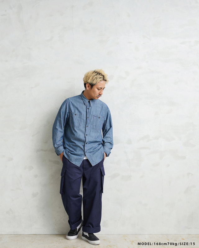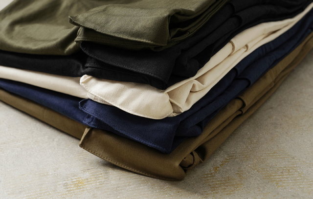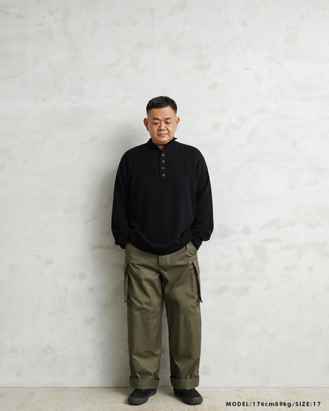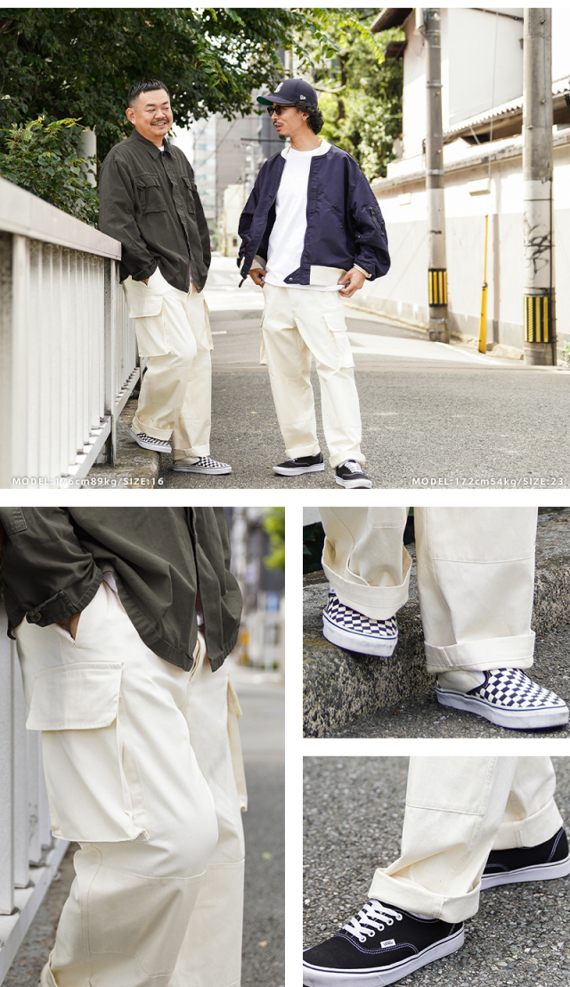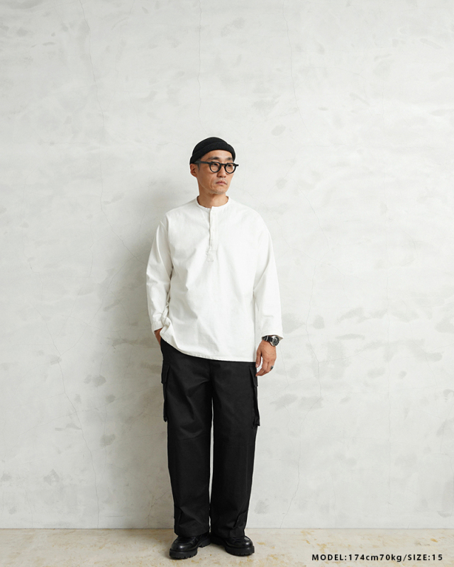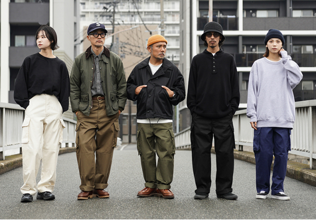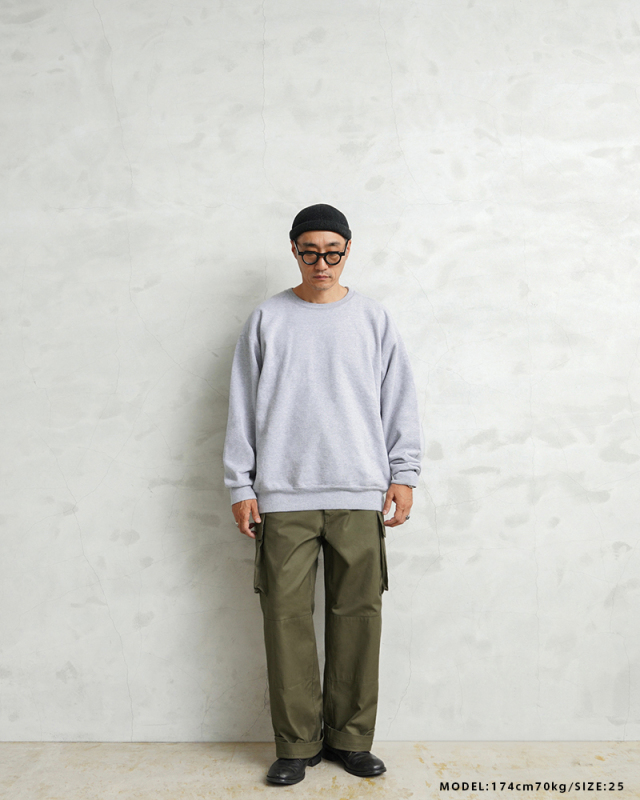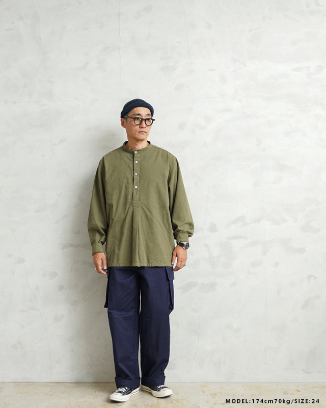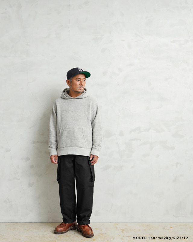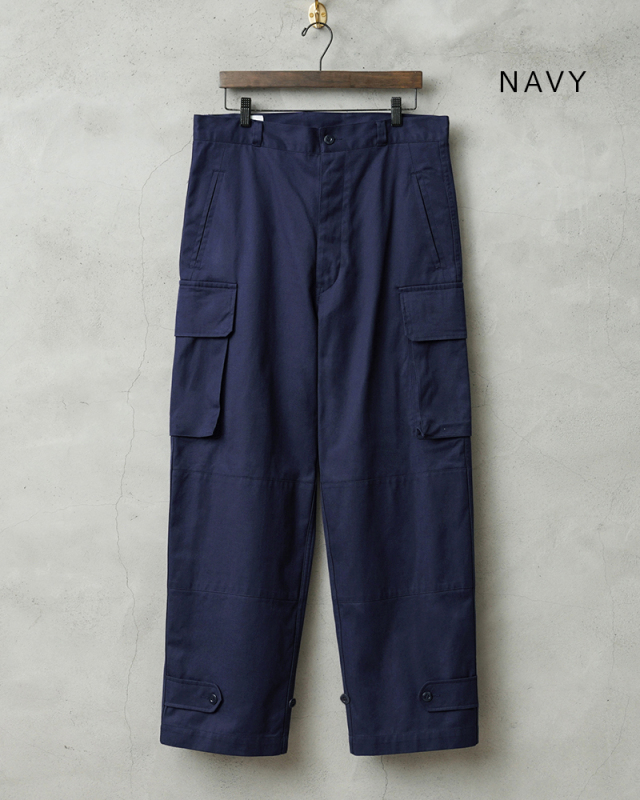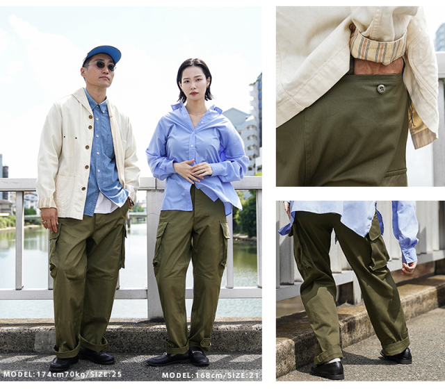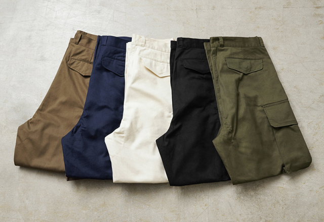 フランス軍の名作中の名作、ヴィンテージアイテムとしても非常に希少価値の高い「M-47カーゴパンツ」。 通称後期型と呼ばれるM-47は、生地にHBT(ヘリンボーンツイル)を採用。綾織の向きが交互に変わるヘリンボーン生地は耐久性にも優れ、経年変化した際の風合いも楽しめるワークウェアに適した素材となっています。 ヘリンボーンツイルの生地を製作するにあたり、実物の生地を分析、二種類の糸をミックスし織り上げることで、当時のヴィンテージさながらなムラのある織りを再現することに成功。織機の調整など何度もテストし納得の行く風合いの生地が完成しました。 前期モデルが1947年~1950年代ごろに採用されていたのに対し、今回製作した後期型は60年代に採用されていたと言われています。 特徴としてはマチがついた大きめなサイドのカーゴポケット。フラップの内側にはさらにボタン留めのフラップが配置された実用性重視のつくりになっています。ダメージを受けやすい両ヒザ部分は生地を二重に張り合わせダブルニー仕様。