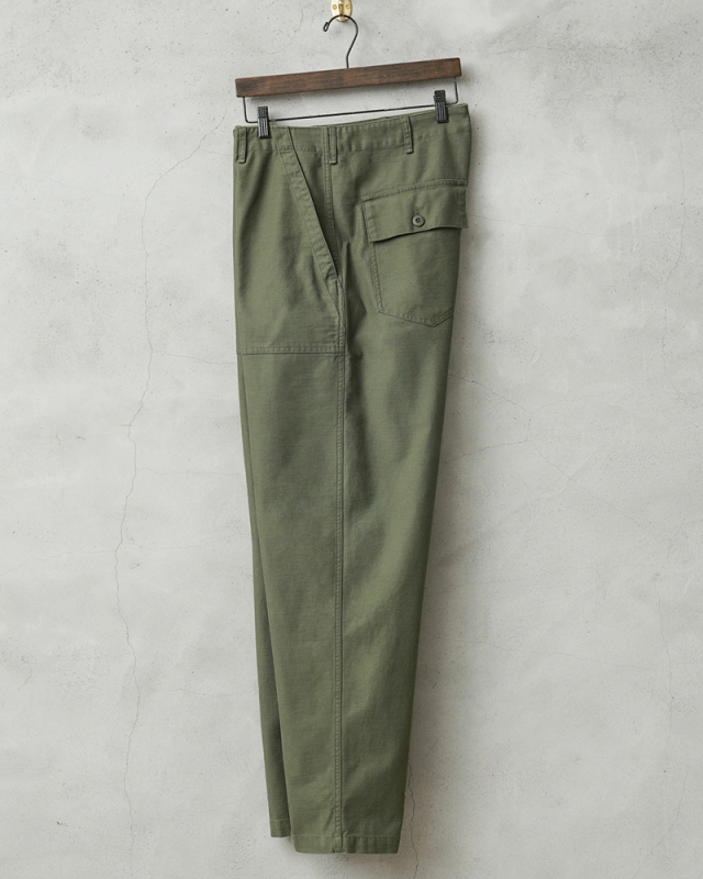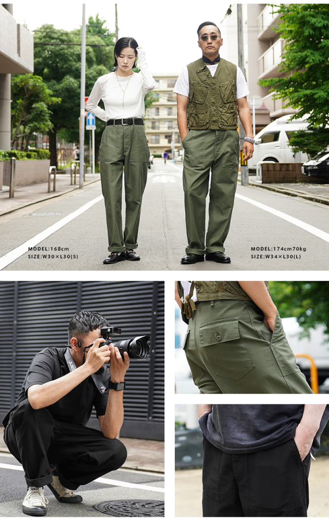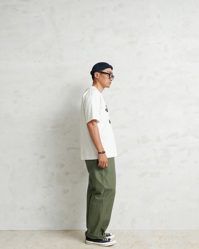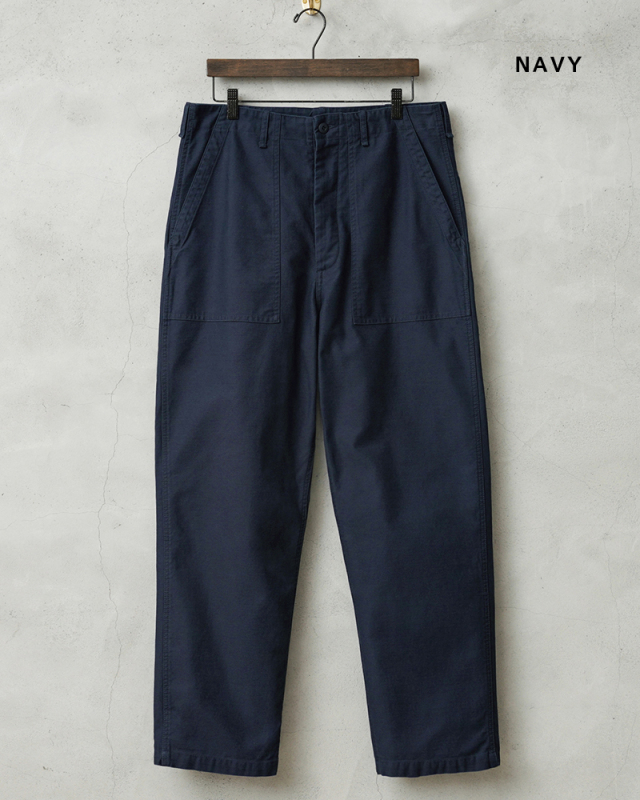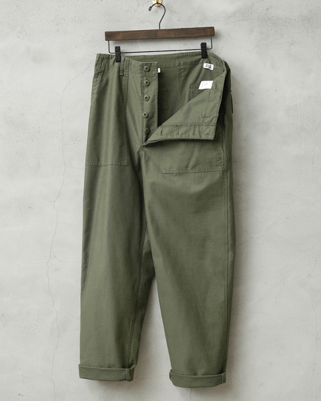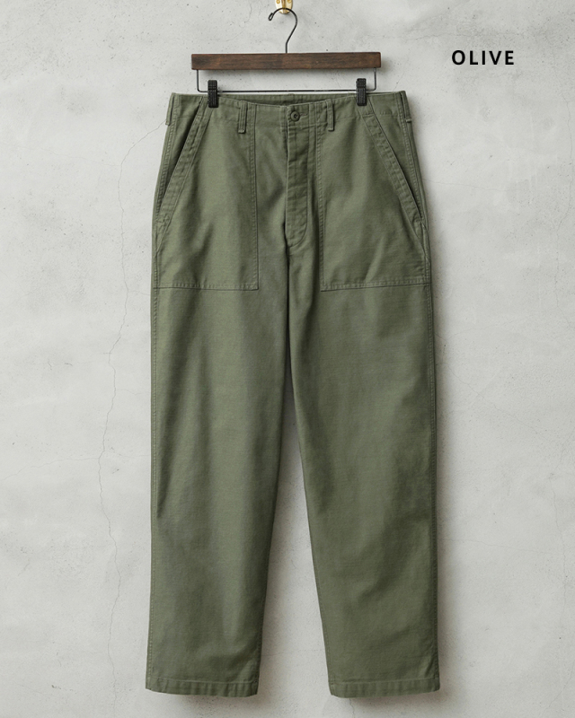 | 商品説明 | 米軍 OG-107 ユーティリティパンツ WAIPER.incのご紹介です。 品名:TROUSERS,MAN’S COTTON SATEEN OG-107,TYPE 1 品番:WP1028 米軍の名作パンツであるOG-107ユーティリティパンツ。ベイカーパンツやファティーグパンツという通称でもおなじみです。 コットンサテンを使用したシンプルなボトムスは、ユーティリティという名前の通り万能パンツとしてカジュアルなパンツの代表格として広く親しまれています。 今回、WAIPER.incで製作したものは最も広く認知されている60年代後期の物。 UFOボタンやポケットのWステッチなど特徴も再現しつつ、パッカリングも期待できる脇のダブルステッチやムラ糸のコットンサテンは履きこむほど風合いが増す素材となっています。 若干、テーパードしたシルエットはジャストサイズからオーバーサイズまで好みでお選びいただけます。カラーは定番のOLIVEに、NAVY、BLACK、NATURALを加えた4色展開となっていますので、必ずお気に入りの色サイズが見つかるはず。 なにかと使える万能ボトムスとしてワードローブに加えていただきたいおすすめの一品です。 |