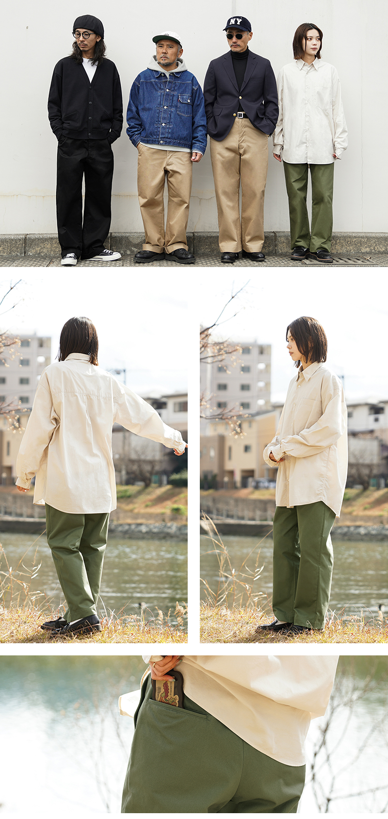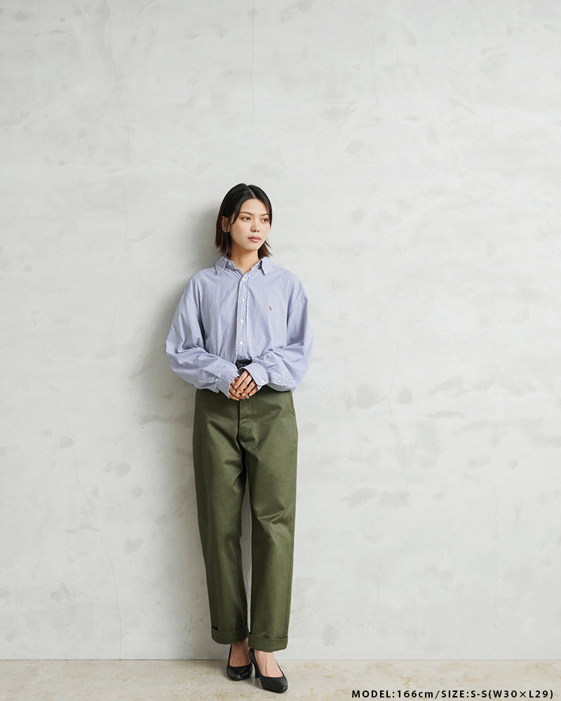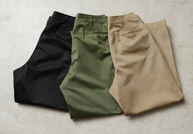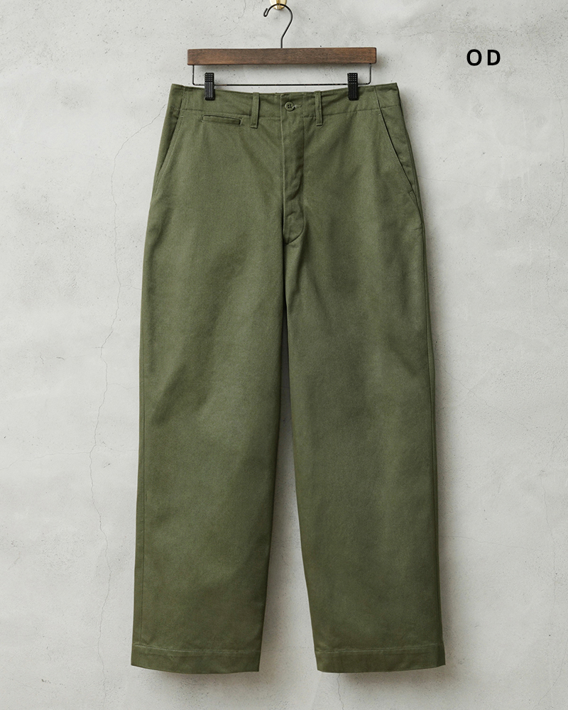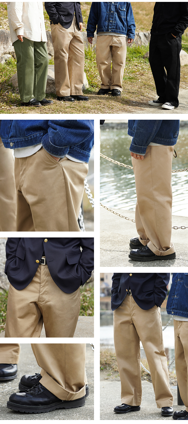 米軍チノらしいしっかりとハリのあるウエポン生地。アーカイブの実物のデッドストックを分析し、光沢感のある高密度の打ち込みを再現、オリジナルで製作しました。 また、この年代のボタンに多く見られる尿素ボタン(ユリアボタン)も完全再現。現代ではほとんど使われることのなくなった尿素ボタンですが、一般的な樹脂ボタンに比べて強度が高く、ミリタリーウェアにぴったりとはまるボタンとなっています。ポケットのスレーキもぬかりなく綿100%カス入りの生成りの素材を採用。ヴィンテージらしい風合いが特徴です。 ウエストは幅広い体型の方に着ていただけるように40インチまでの6サイズ展開。さらにレングスを2種類。カラーに関してもブラックとオリーブを加えた3色展開となっていますので、必ずお気に入りの色サイズが見つかるはず。 ステッチ無しのシンプルな脇部分に、適度にテーパードしたシルエットはオンオフ問わず履ける懐の深さが魅力。ディテールにもこだわった完成度の高い一本です。