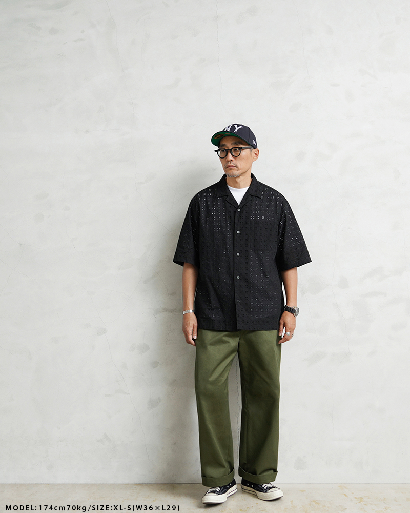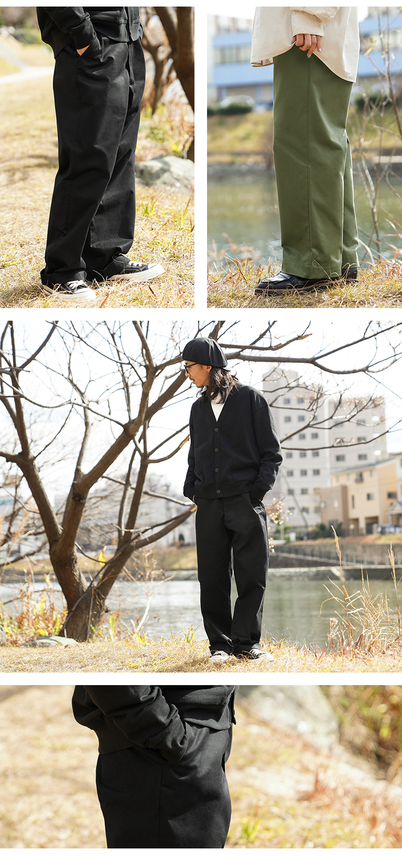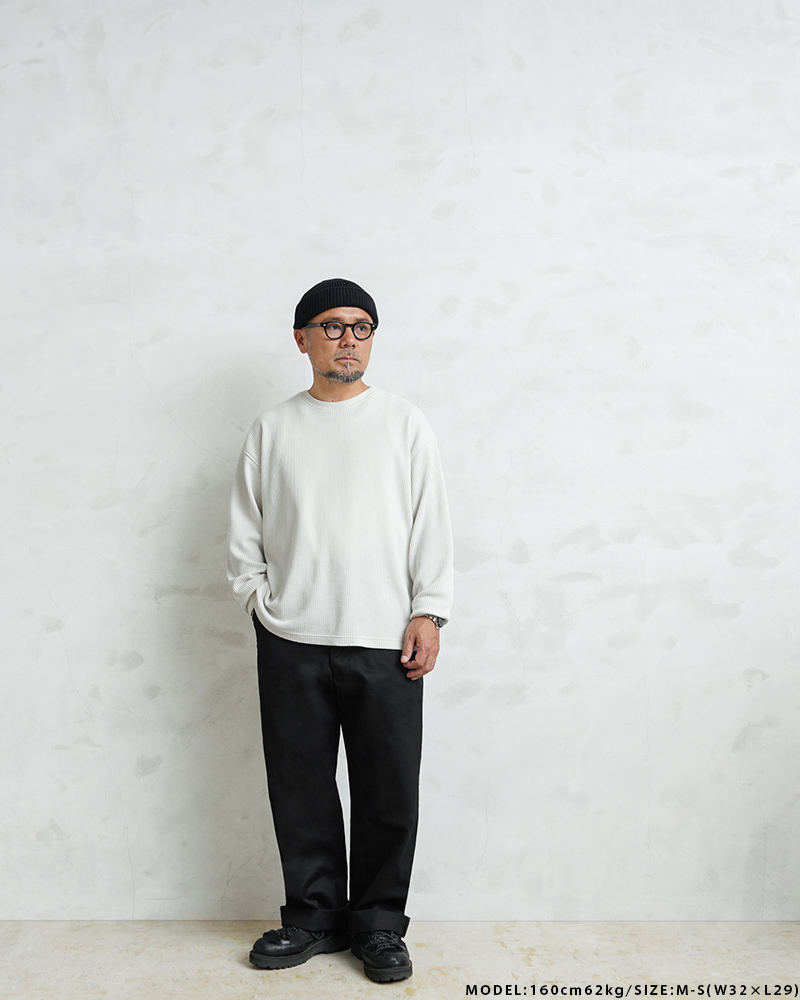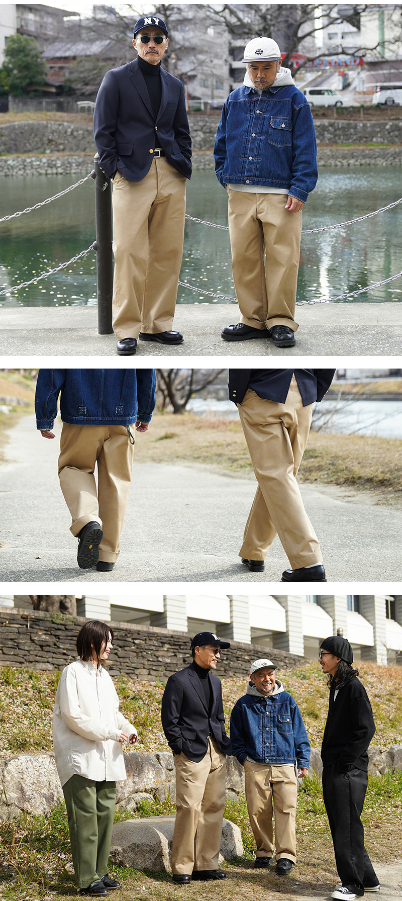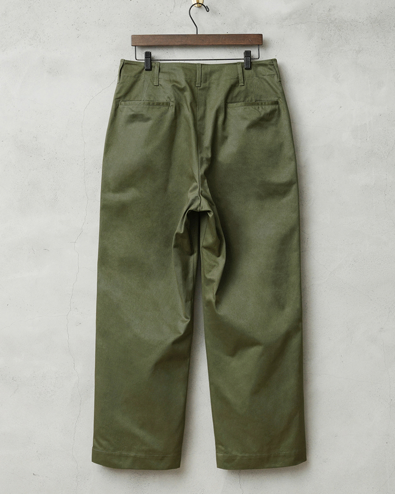 米軍チノらしいしっかりとハリのあるウエポン生地。アーカイブの実物のデッドストックを分析し、光沢感のある高密度の打ち込みを再現、オリジナルで製作しました。 また、この年代のボタンに多く見られる尿素ボタン(ユリアボタン)も完全再現。現代ではほとんど使われることのなくなった尿素ボタンですが、一般的な樹脂ボタンに比べて強度が高く、ミリタリーウェアにぴったりとはまるボタンとなっています。ポケットのスレーキもぬかりなく綿100%カス入りの生成りの素材を採用。ヴィンテージらしい風合いが特徴です。 ウエストは幅広い体型の方に着ていただけるように40インチまでの6サイズ展開。さらにレングスを2種類。カラーに関してもブラックとオリーブを加えた3色展開となっていますので、必ずお気に入りの色サイズが見つかるはず。 ステッチ無しのシンプルな脇部分に、適度にテーパードしたシルエットはオンオフ問わず履ける懐の深さが魅力。ディテールにもこだわった完成度の高い一本です。