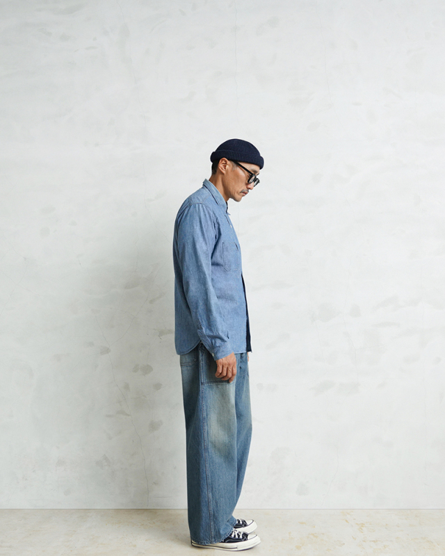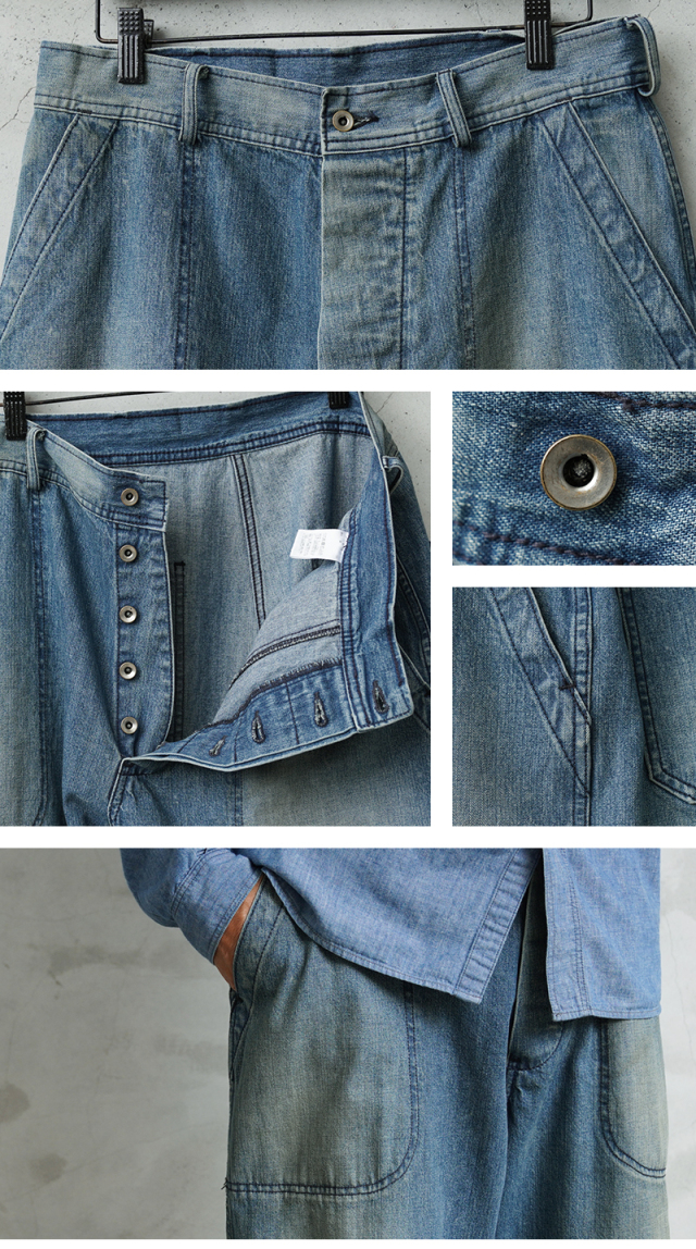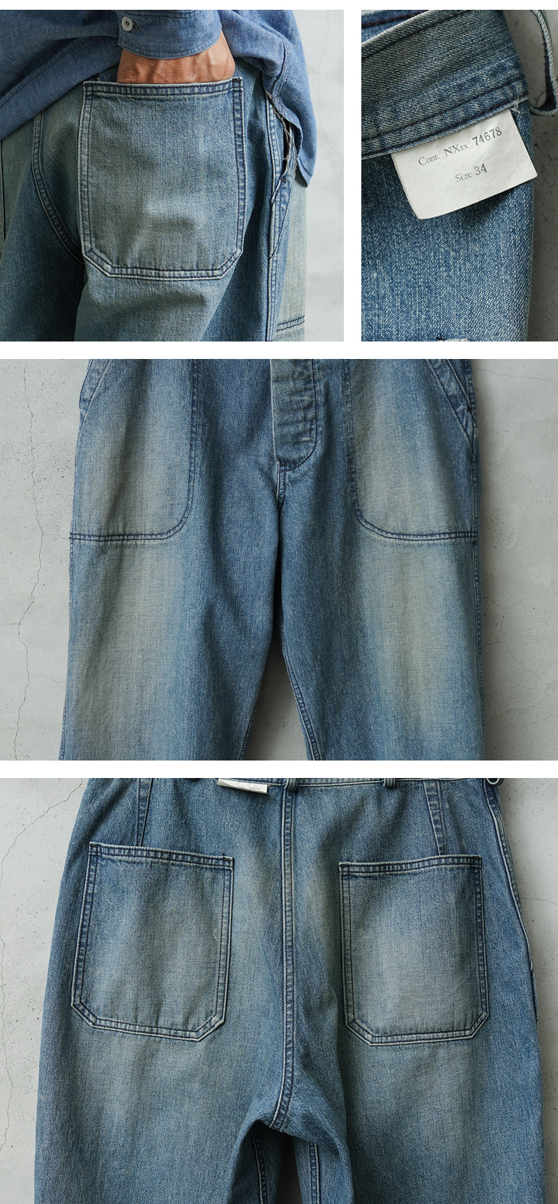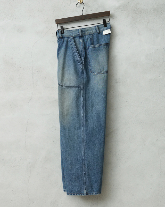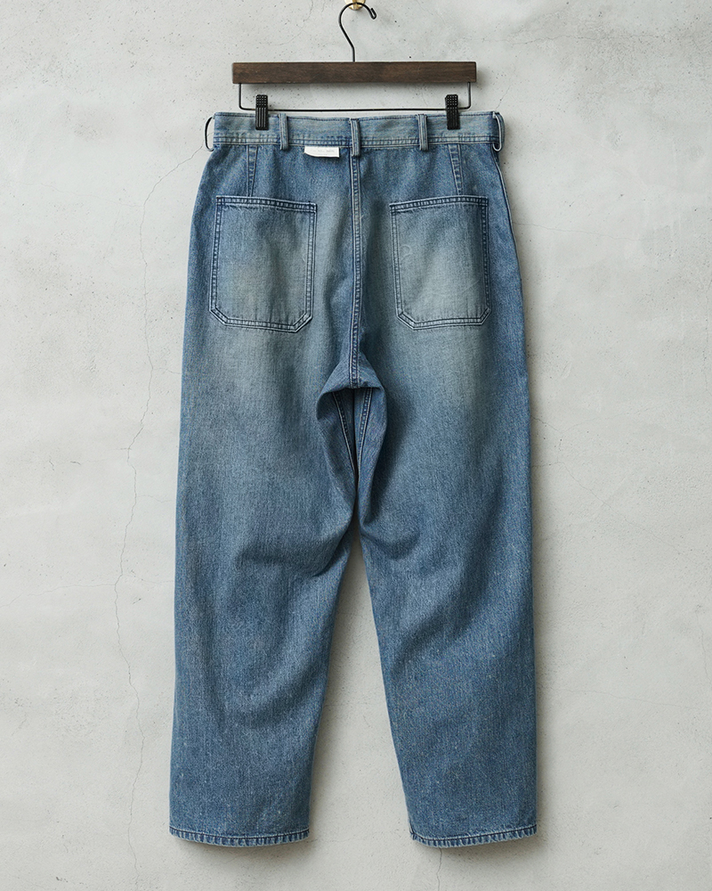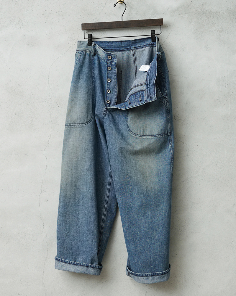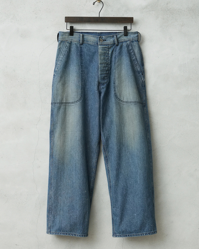 海軍のデニムパンツの中でもフレアモデルに比べて人気の高いトラウザーを、こだわりのファブリックとともに忠実に復刻しました。 フロントポケットのステッチがラウンドしており、小ぶりなブラックのネオバボタンと当時のアーカイブを基に精巧に再現しています。