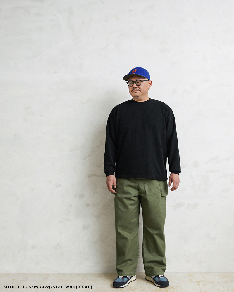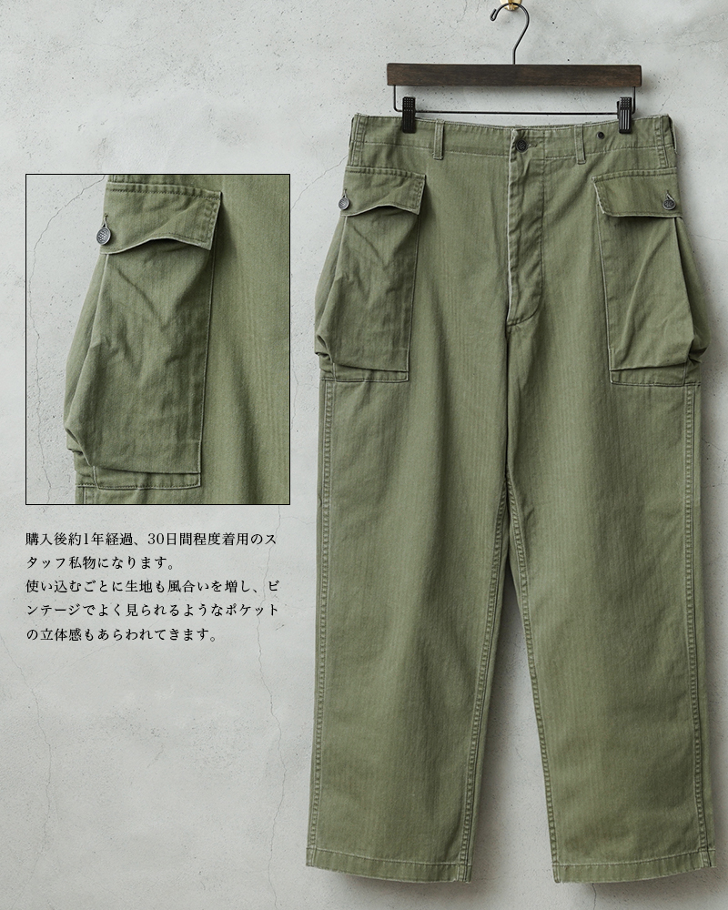 当店が所有する各モデルのアーカイブを分析し、幾度にもわたるサンプル制作を経て、納得のいく生地を作り上げました。製品洗いを施すことで、最初から着こんだような風合いが特徴です。巻き縫いで仕上げられた各部にはパッカリングが浮き上がり、すでに着込んだような風合いを感じさせつつも、まだまだエイジングを楽しめる余地を残しており、自分らしい一着に育てることができます。40年代のUS ARMYのHBTシリーズの中でも最も人気の高いM-43は、ジャケットと同様に大型のカーゴポケットを両サイドの腰部分に取り付けたユニークなデザインとなっています。