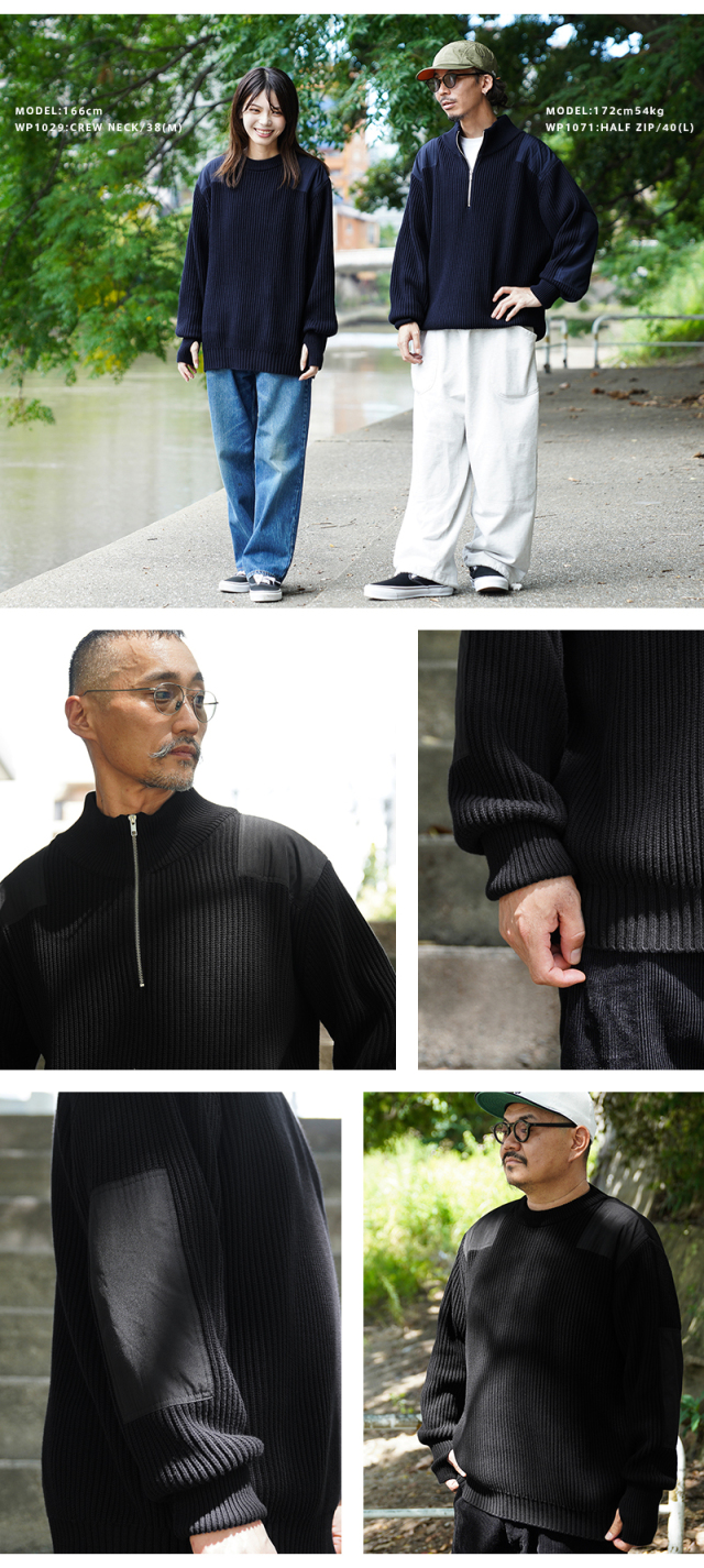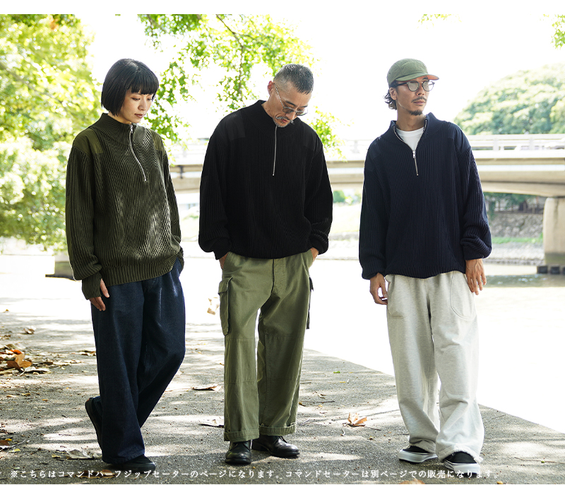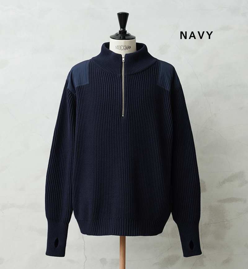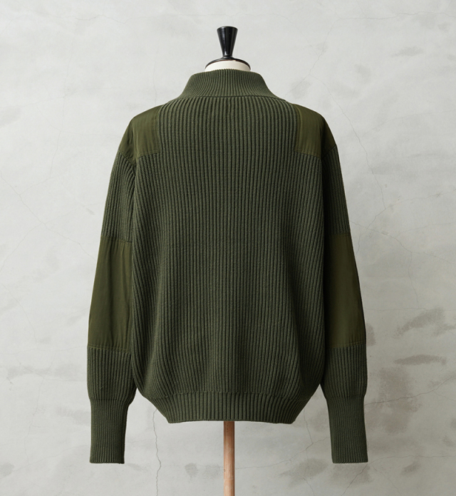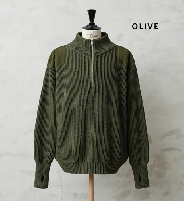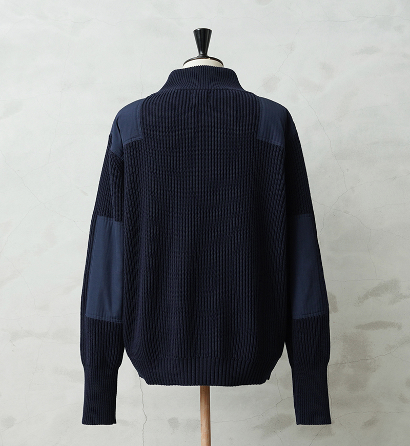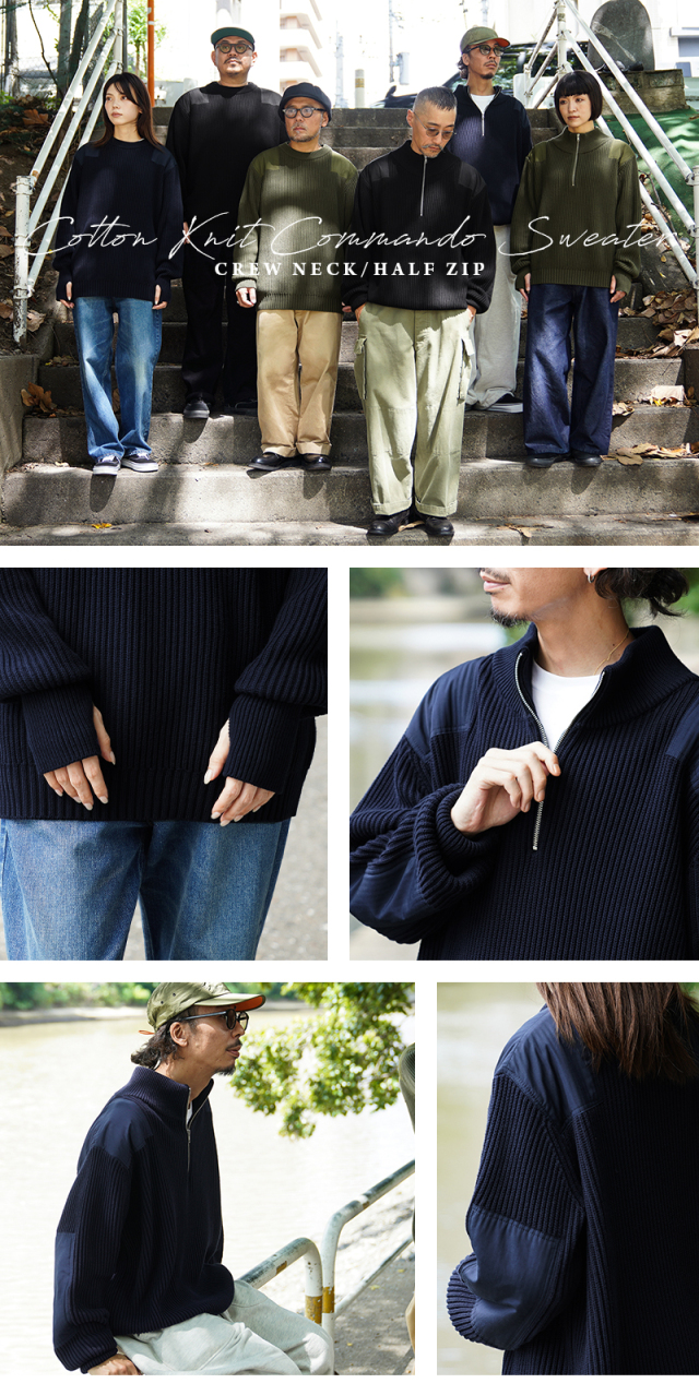 従来展開していたクルーネックに加え、ハーフジップタイプも新たに加わりました。 タイトなサイジングにウールニットを使用した本来のデザインから、ローゲージのコットン100%に素材を変更。 ゆったりとしたサイジングにリサイズを行うことで、リラックスしたムードで無骨さを緩和したデザインとなっています。 コマンドセーターを象徴する肩や肘部分のあて布は健在。袖口にサムホールを作ることで袖先で遊べるディテールを加えています。