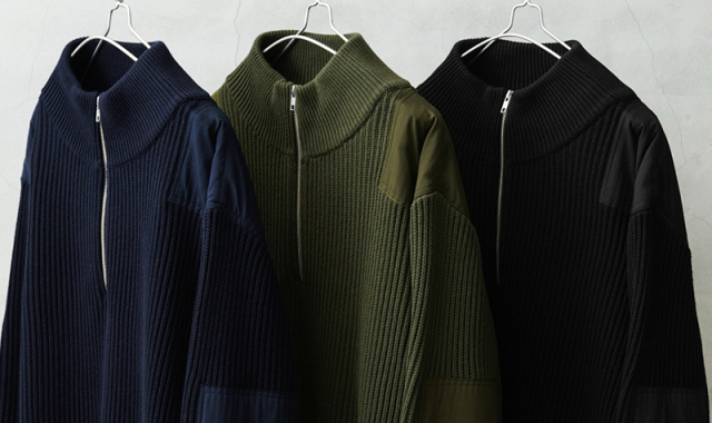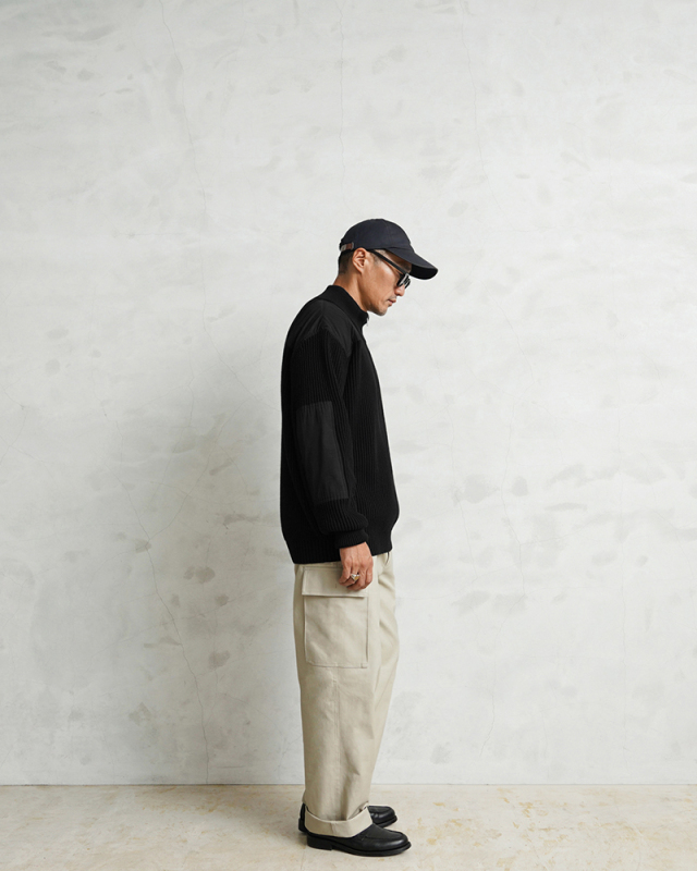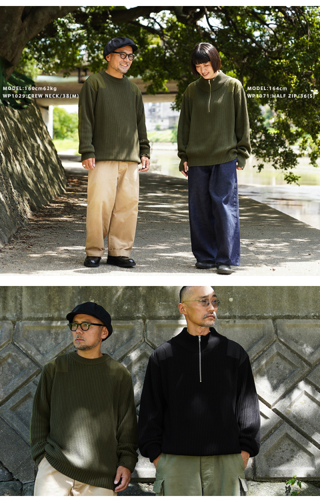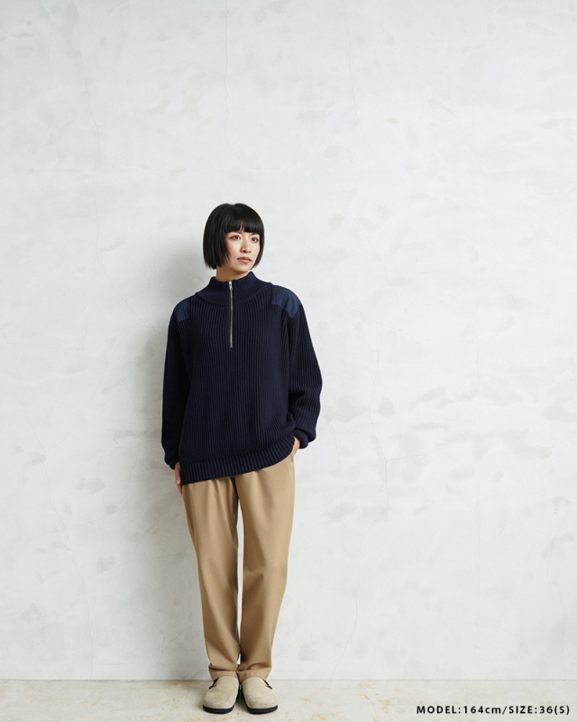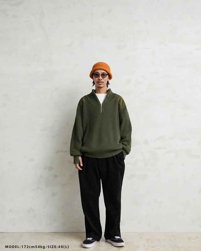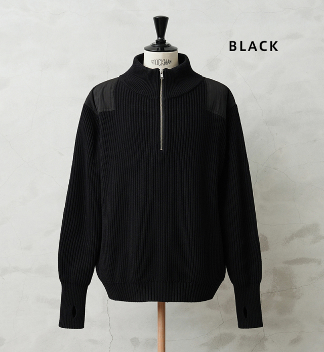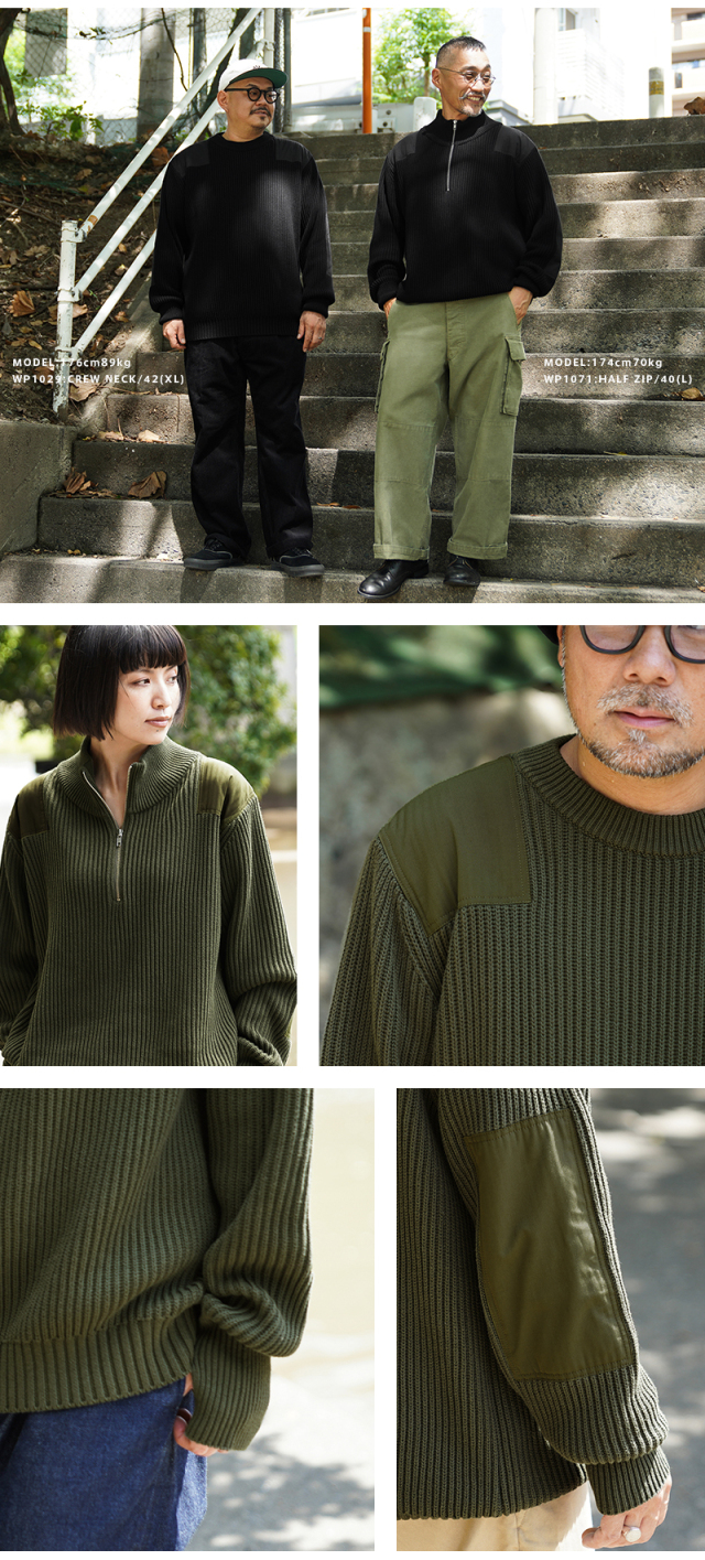 従来展開していたクルーネックに加え、ハーフジップタイプも新たに加わりました。 タイトなサイジングにウールニットを使用した本来のデザインから、ローゲージのコットン100%に素材を変更。 ゆったりとしたサイジングにリサイズを行うことで、リラックスしたムードで無骨さを緩和したデザインとなっています。 コマンドセーターを象徴する肩や肘部分のあて布は健在。袖口にサムホールを作ることで袖先で遊べるディテールを加えています。