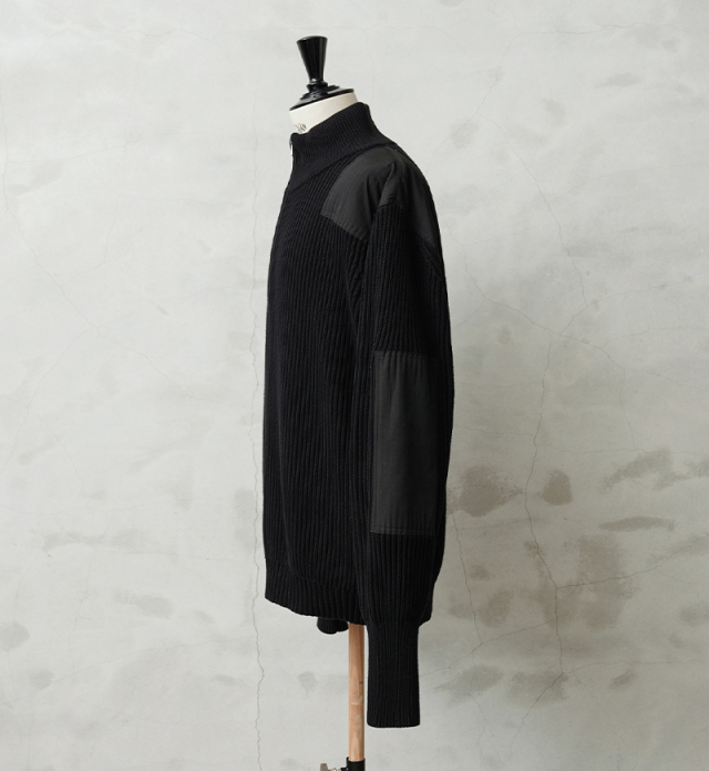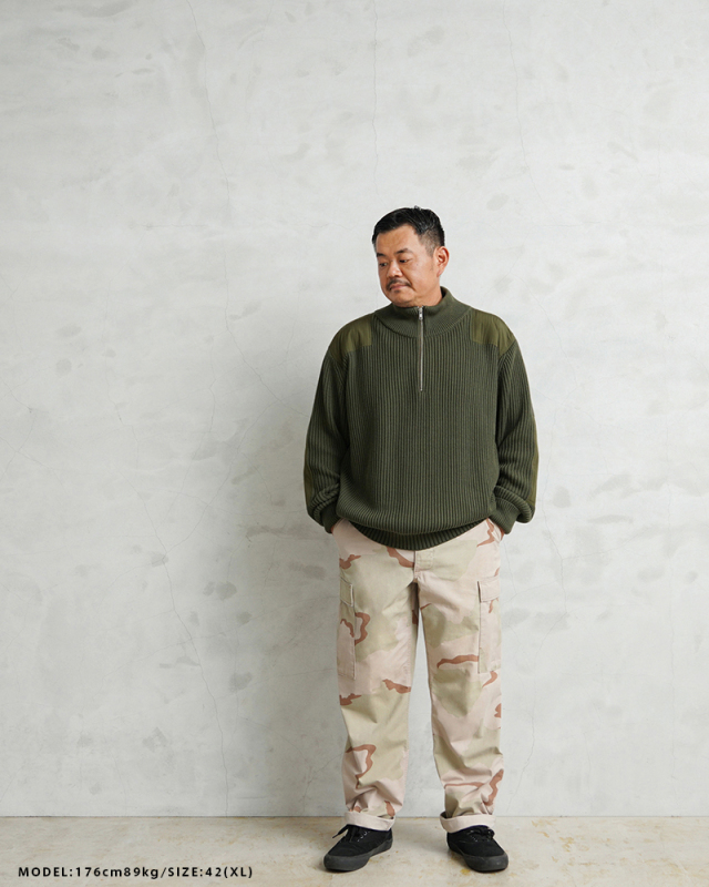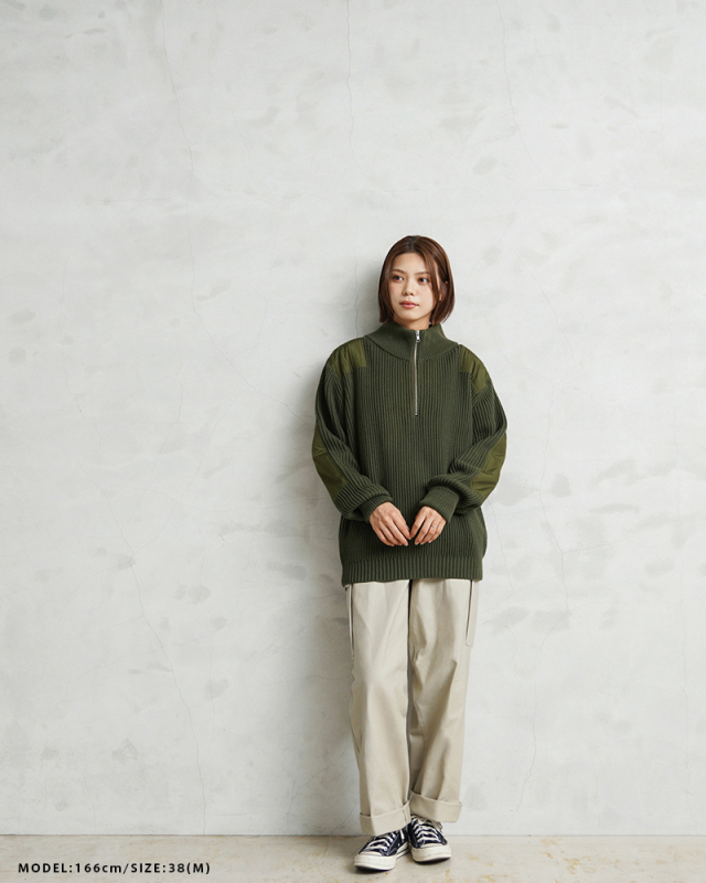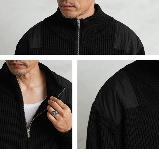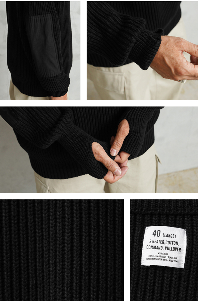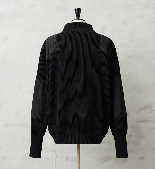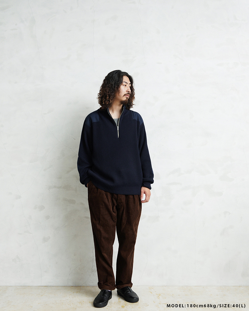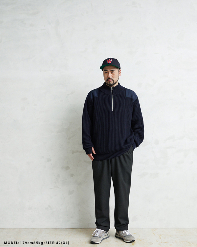 従来展開していたクルーネックに加え、ハーフジップタイプも新たに加わりました。 タイトなサイジングにウールニットを使用した本来のデザインから、ローゲージのコットン100%に素材を変更。 ゆったりとしたサイジングにリサイズを行うことで、リラックスしたムードで無骨さを緩和したデザインとなっています。 コマンドセーターを象徴する肩や肘部分のあて布は健在。袖口にサムホールを作ることで袖先で遊べるディテールを加えています。