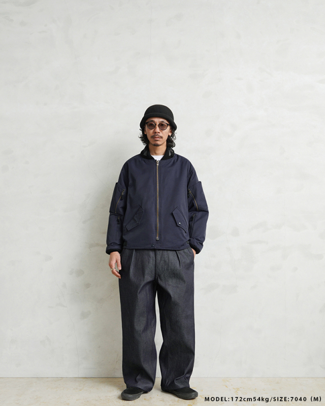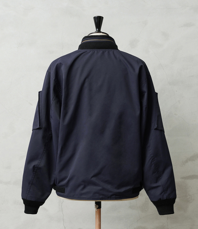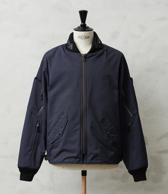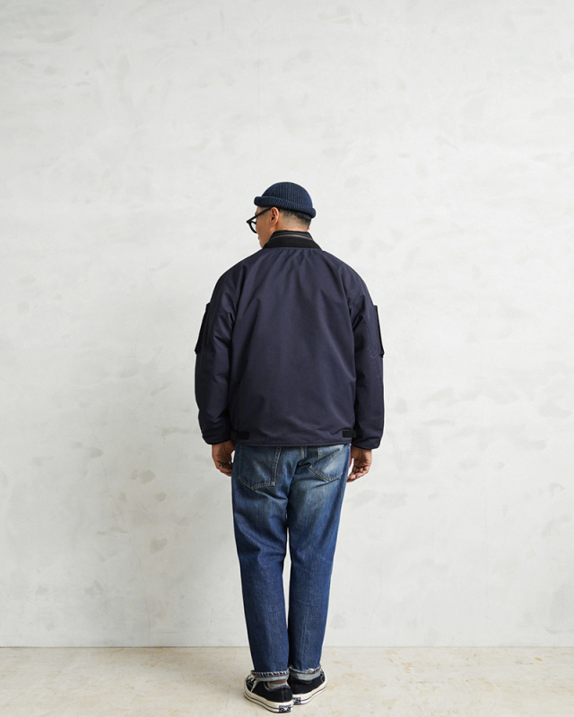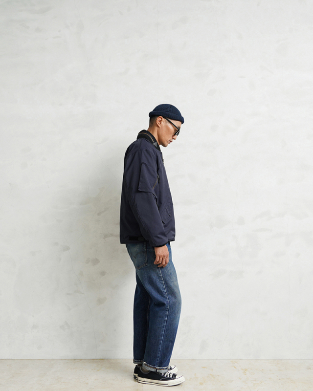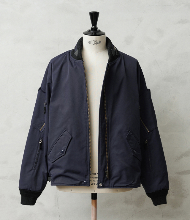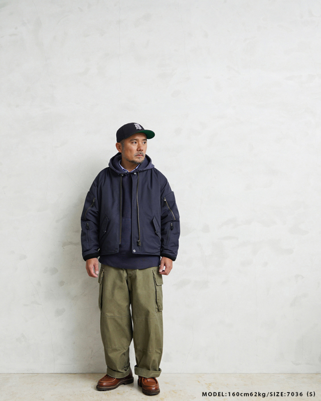 | 商品説明 | WAIPER.inc カナダ軍 ROYAL CANADIAN AIR FORCE フライトジャケット TYPEIII NAVYのご紹介です。 品番:WP1073 カナダ空軍「ロイヤル カナディアン エアフォース(RCAF)」で1990年代に採用されていたフライトジャケット。 本来の「CANADIAN AIR FORCE BLUE」カラーを、WAIPER流にアレンジしました。 90年代以前に採用されていた初期型のNAVYモデルをサンプリングし、当店オリジナル仕様にアップデート。デザインは米軍のL-2、L-2A、L-2Bなどをベースにしつつ、カナダ軍独自のアレンジが加えられています。 特徴は上腕部分に立体的なデザインのポケットが2箇所、前腕部分にはファスナー付きポケットが2箇所ずつ備わる独創的なディテールです。また、初期型の個体を参考にエポレットを排除。シンプルなデザインにすることで日常でも着回しやすくなっています。 さらに、フロントにはフラップポケットとインナーポケットを合わせて計8箇所のポケットを配置。収納力に優れ、デザイン性も高めています。後ろ襟元には収納式のフードも装備。裾にはリブが付いておらず、一般的なフライトジャケットよりもファッションに取り入れやすい、ストンと落ちるボックスシルエットに仕上げています。裾のサイドにはベルクロアジャスターを装備し、フィット感の調節が可能。このディテールがさらにデザイン性を際立たせます。 生地にはコットンとナイロンの混紡素材を使用したマットな質感が特徴。中綿のないタイプですが表地と裏地の間には芯地と呼ばれるコットン系の布地が挟まれているため、防風性も確保。日本の気候では、夏以外の3シーズンで快適に着用できます。 裏地は滑りの良いナイロン生地の総裏地仕立てで、袖先までしっかりと施されています。これにより、レイヤード時のゴワつきがなくスムーズな着脱が可能。 比較的ショート丈のデザインのため、インナーを少し見せるスタイリングでバランス良く、スマートに着こなせるジャケットです。 |