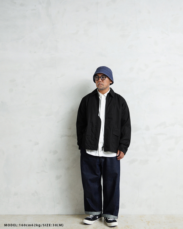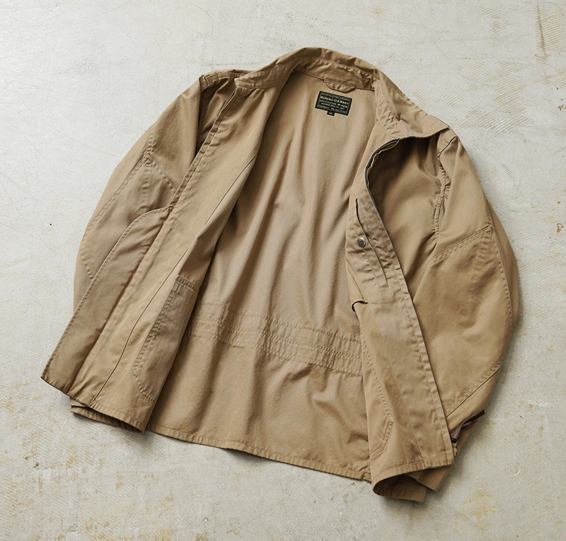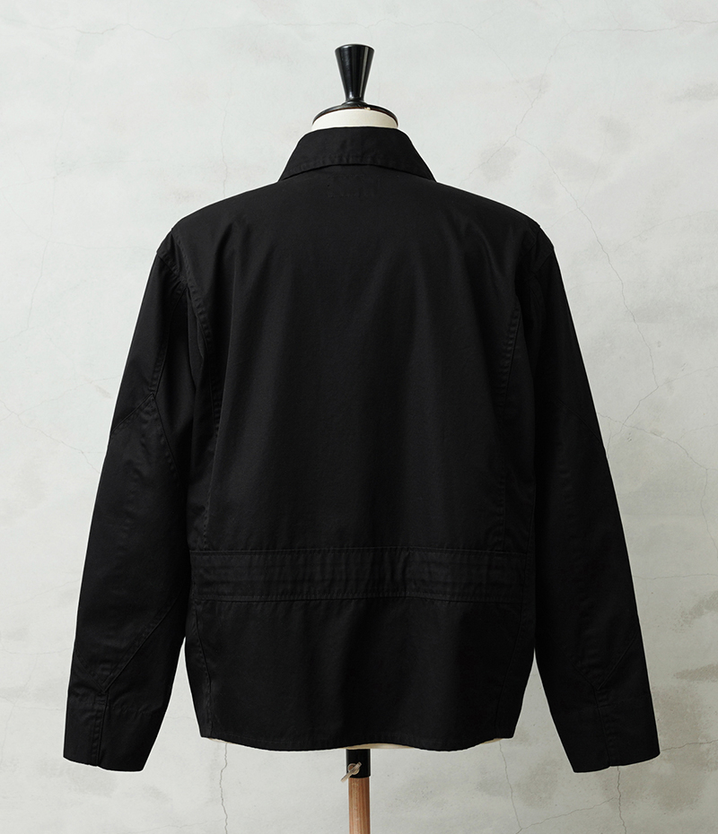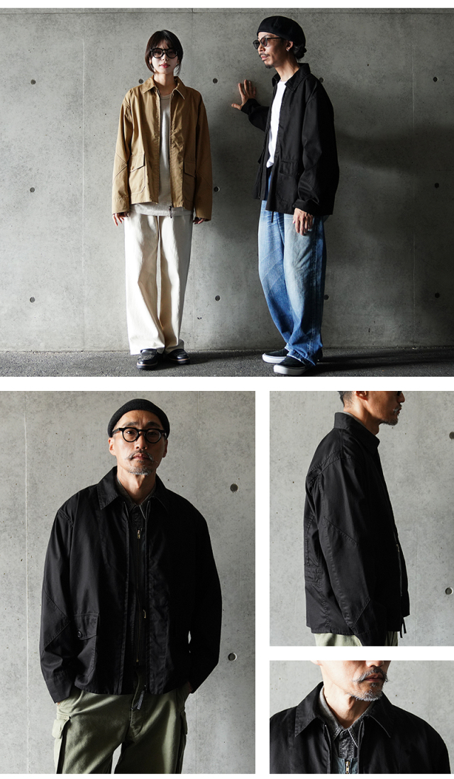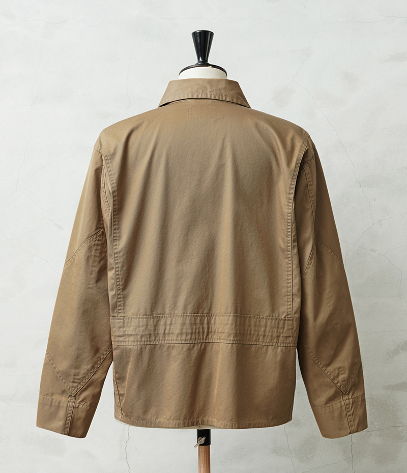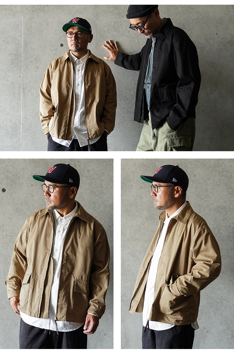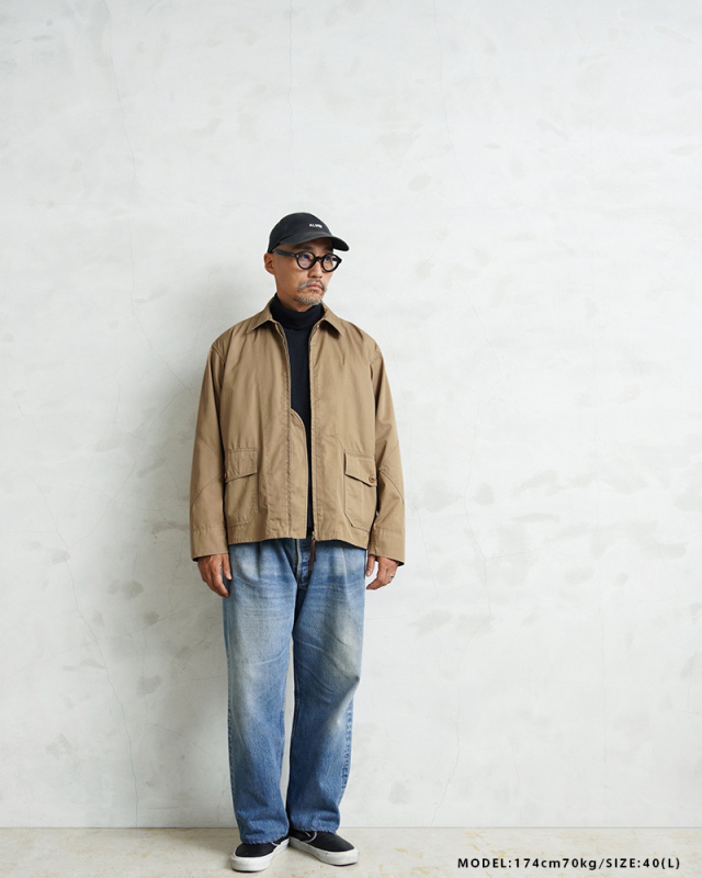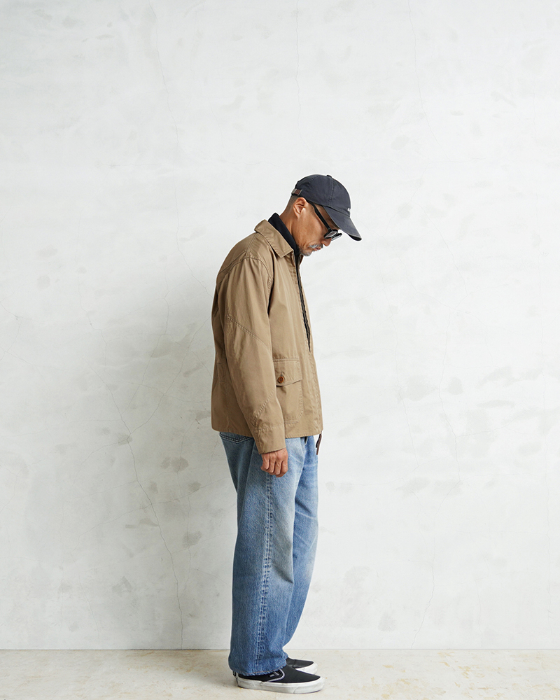 1940年代、アメリカ海軍航空部隊で夏季や熱帯気候での着用を目的に採用されたサマーフライトジャケット「M-421A」。 その名作を現代的にモダナイズし製作しました。 軽やかな着心地の薄手ジャケットは、近年の暖冬気候にも最適。 実物のコンパクトで短丈なシルエットを見直しつつ、菱形の袖パッチやアームホールのマチ布といった特徴的なディテールはそのままに、ハリントンジャケットのように気軽に羽織れる一着へと再構築しました。 コックピットでの運動量を確保するために備えられていた背面のアクションプリーツは、現代のタウンユースを意識し、あえて廃止。着用時のシルエットをすっきりと美しく見せることに重点を置きました。