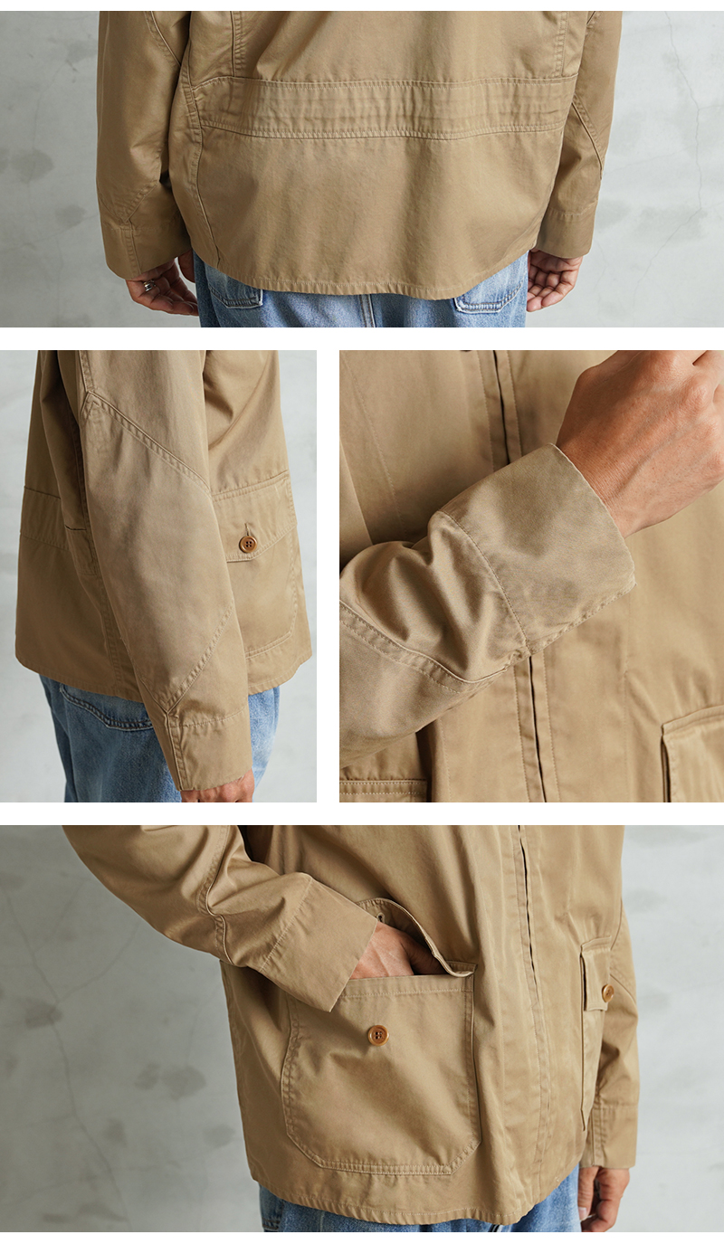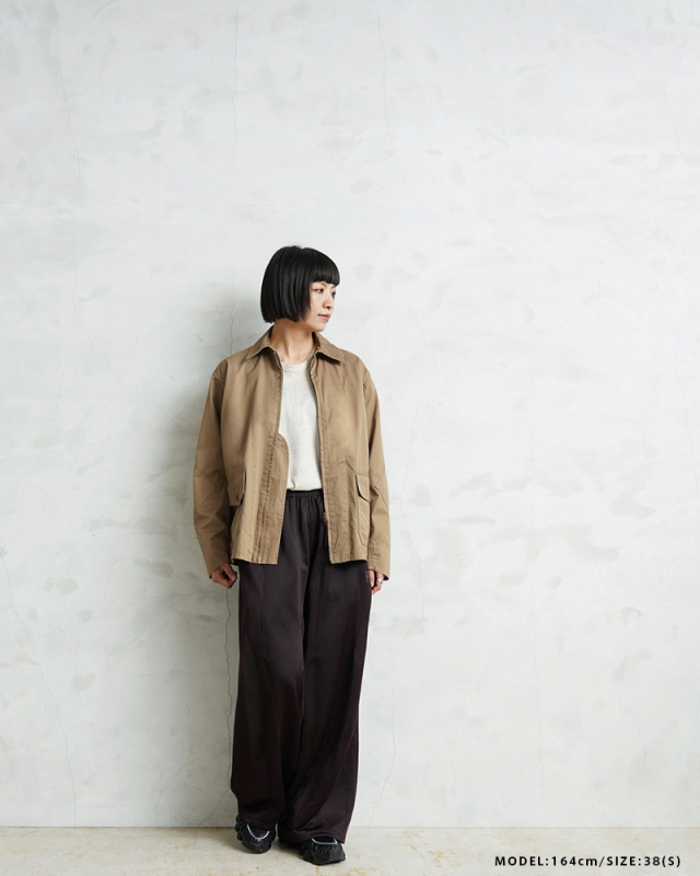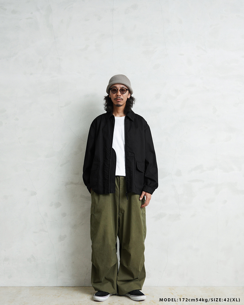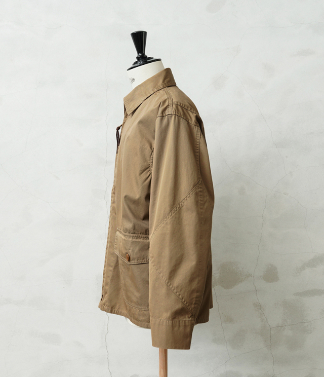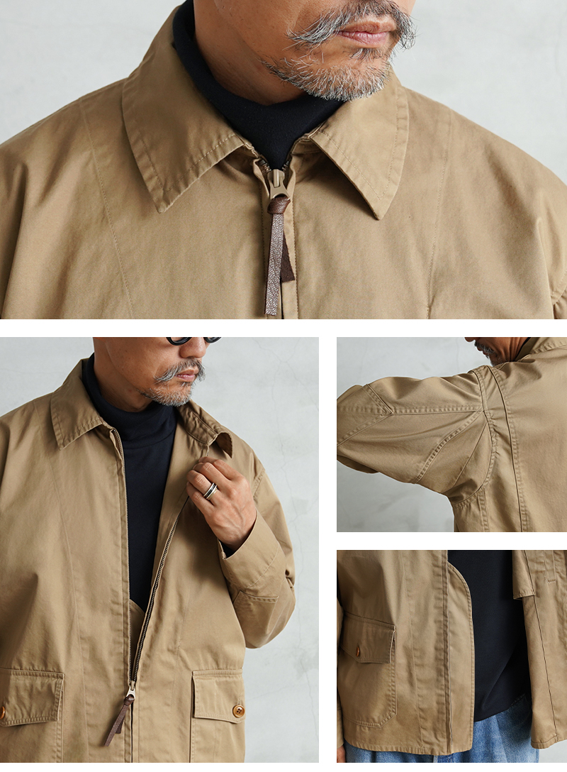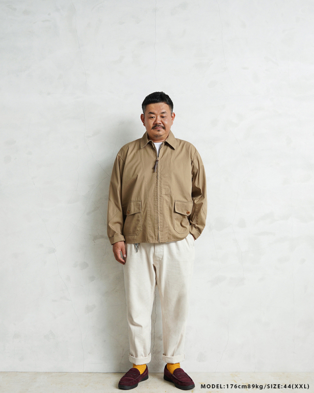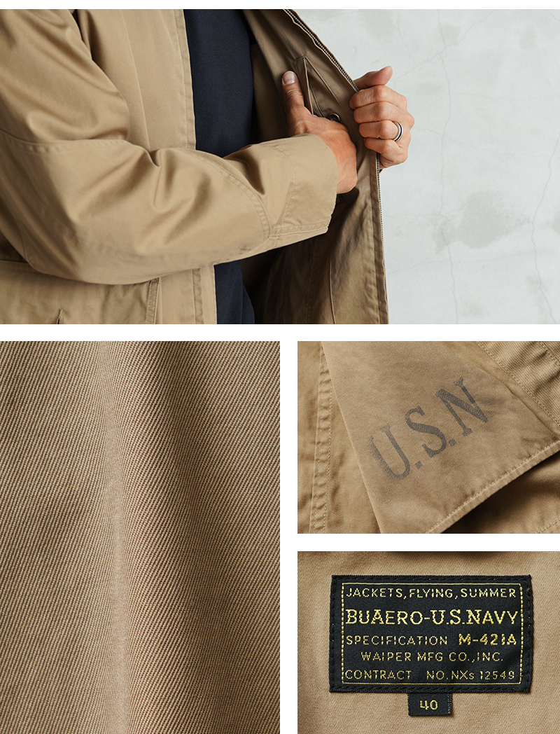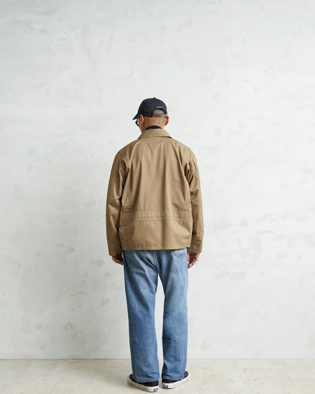 1940年代、アメリカ海軍航空部隊で夏季や熱帯気候での着用を目的に採用されたサマーフライトジャケット「M-421A」。 その名作を現代的にモダナイズし製作しました。 軽やかな着心地の薄手ジャケットは、近年の暖冬気候にも最適。 実物のコンパクトで短丈なシルエットを見直しつつ、菱形の袖パッチやアームホールのマチ布といった特徴的なディテールはそのままに、ハリントンジャケットのように気軽に羽織れる一着へと再構築しました。 コックピットでの運動量を確保するために備えられていた背面のアクションプリーツは、現代のタウンユースを意識し、あえて廃止。着用時のシルエットをすっきりと美しく見せることに重点を置きました。