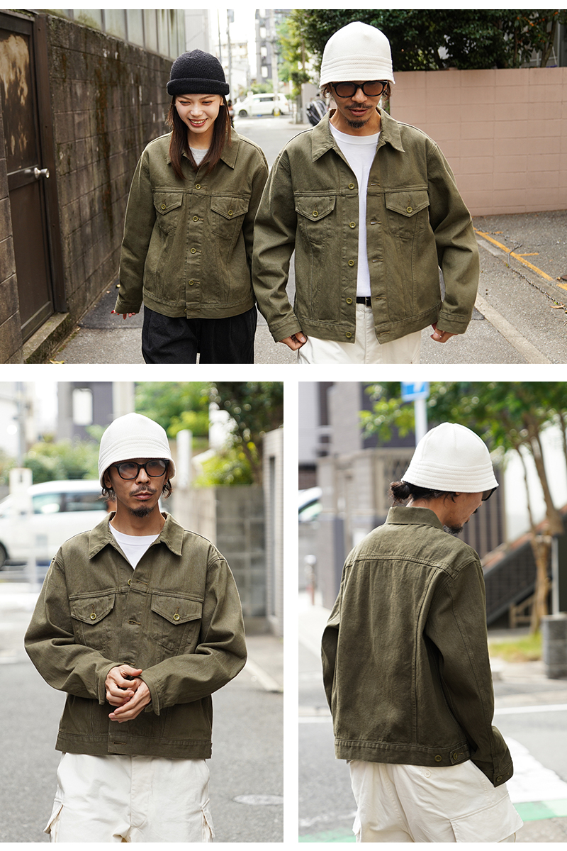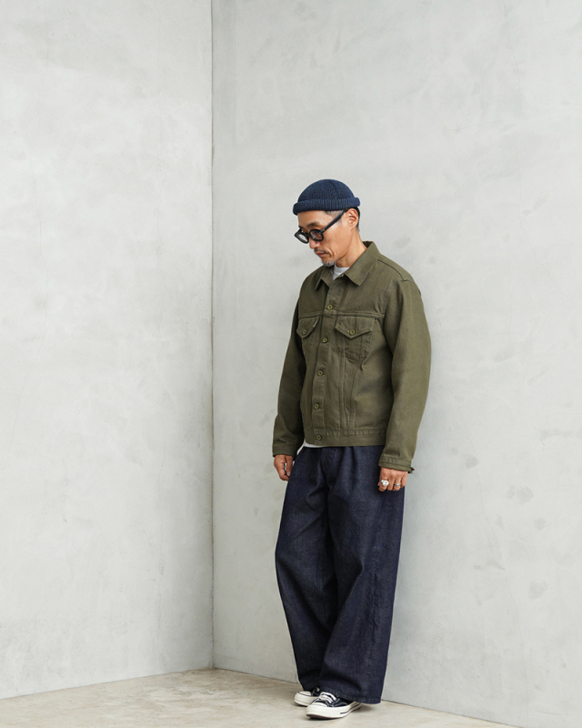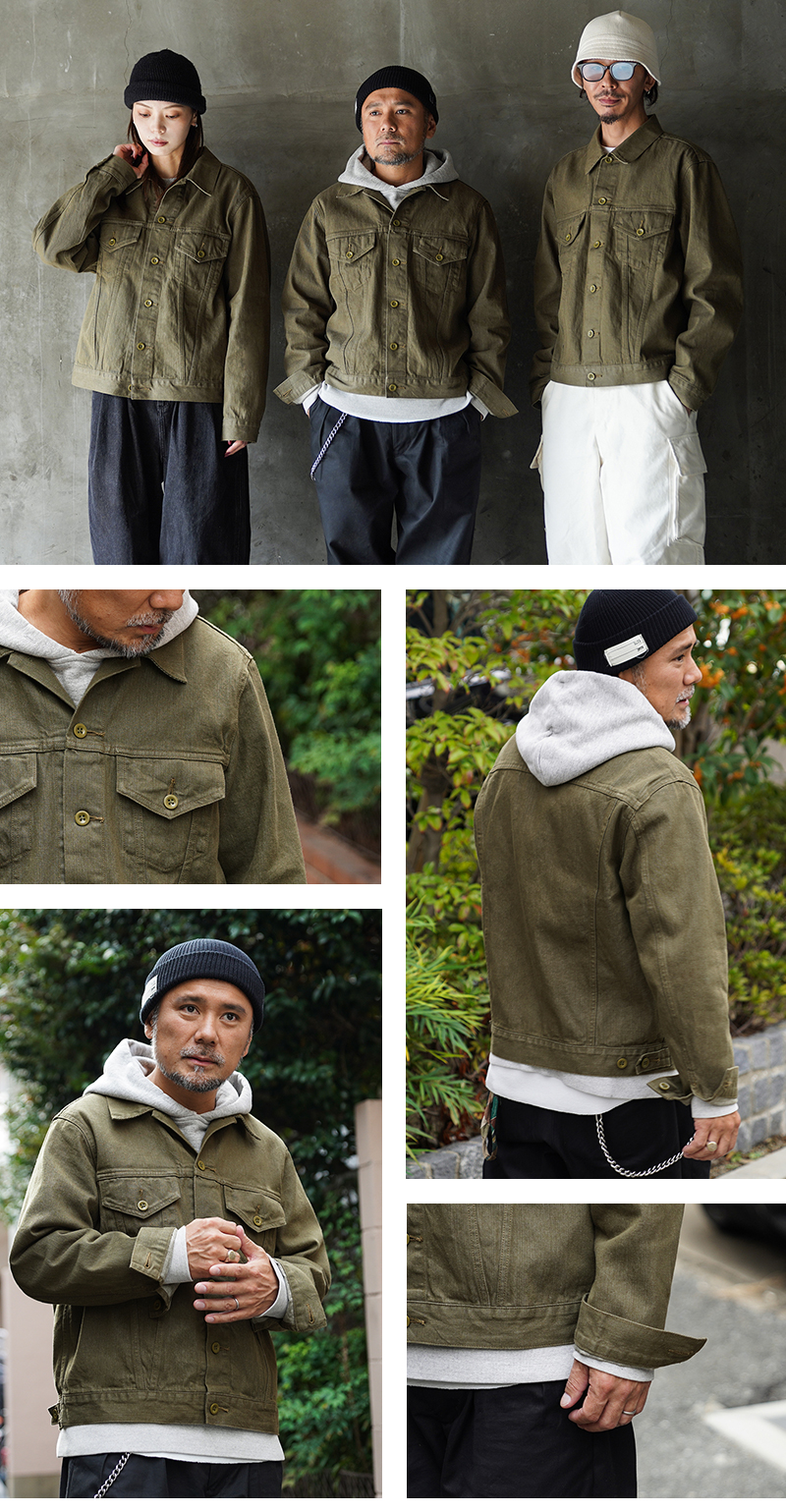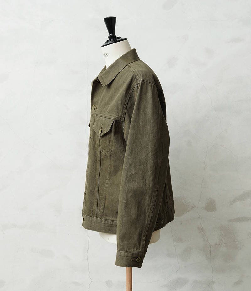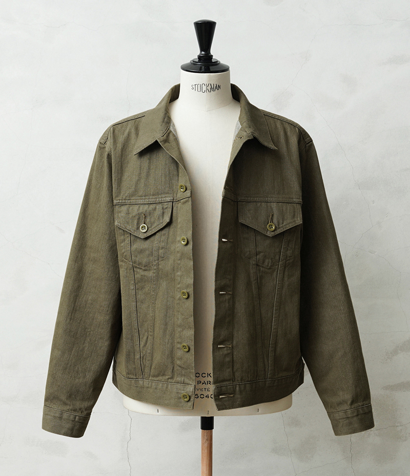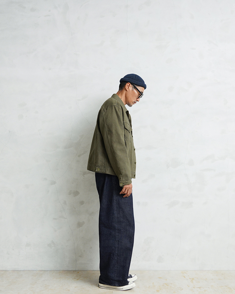 イギリス軍で1950年代に採用されていたグリーンデニム。 当時のヴィンテージデニムを分析・再現した生地を使用し、トラッカージャケットを製作しました。 使用するデニム生地は、実物のアーカイブをもとに国内大手デニムメーカー「カイハラ」と共同開発。 当時の生地を徹底的に分析し、日本国内の工場で織り上げたオリジナルのデニムは、左綾組織と旧式織機によるセルビッジ仕様が最大の特徴です。オリジナルの色合いを再現するため、何度も試作と色出しを繰り返し、洗濯を重ねるごとにヴィンテージさながらの風合いが増していきます。