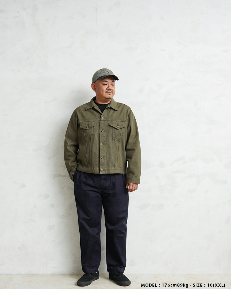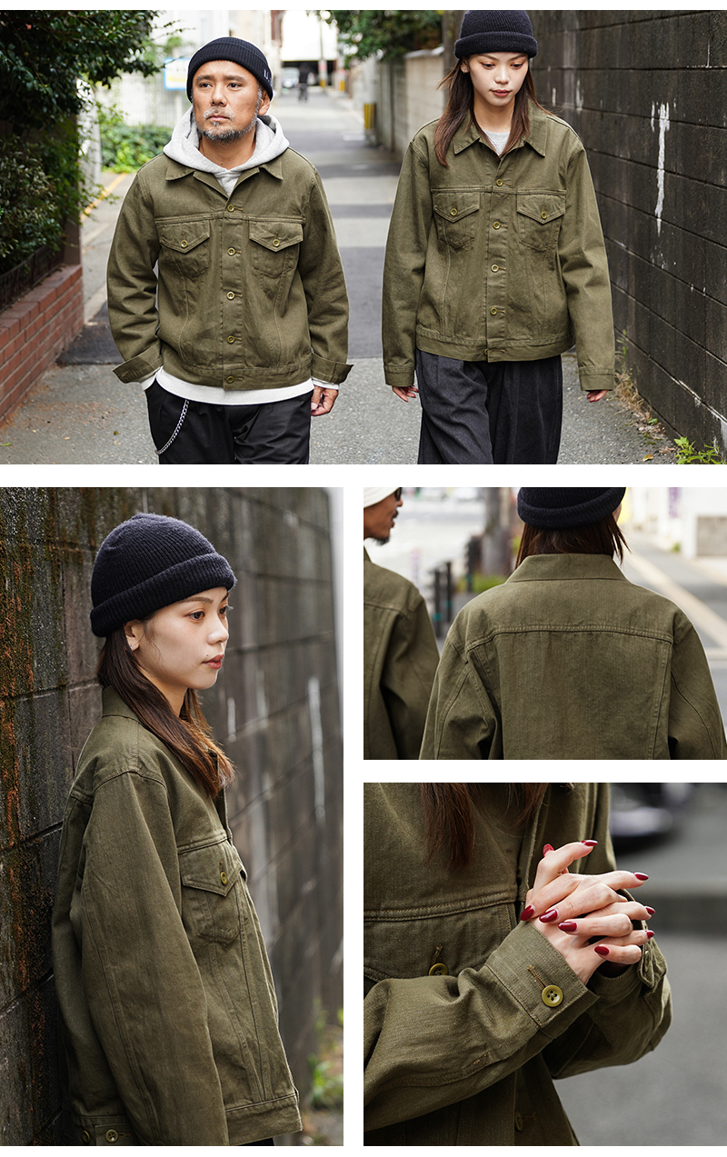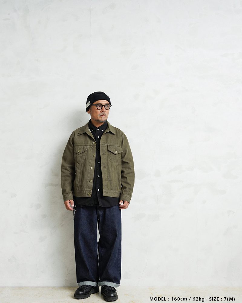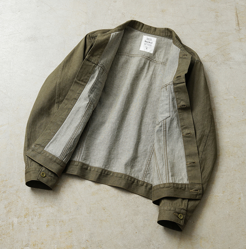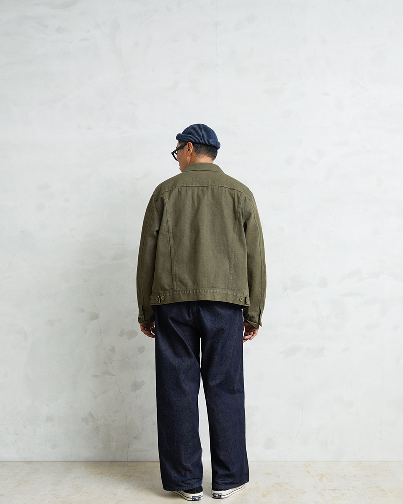 イギリス軍で1950年代に採用されていたグリーンデニム。 当時のヴィンテージデニムを分析・再現した生地を使用し、トラッカージャケットを製作しました。 使用するデニム生地は、実物のアーカイブをもとに国内大手デニムメーカー「カイハラ」と共同開発。 当時の生地を徹底的に分析し、日本国内の工場で織り上げたオリジナルのデニムは、左綾組織と旧式織機によるセルビッジ仕様が最大の特徴です。オリジナルの色合いを再現するため、何度も試作と色出しを繰り返し、洗濯を重ねるごとにヴィンテージさながらの風合いが増していきます。