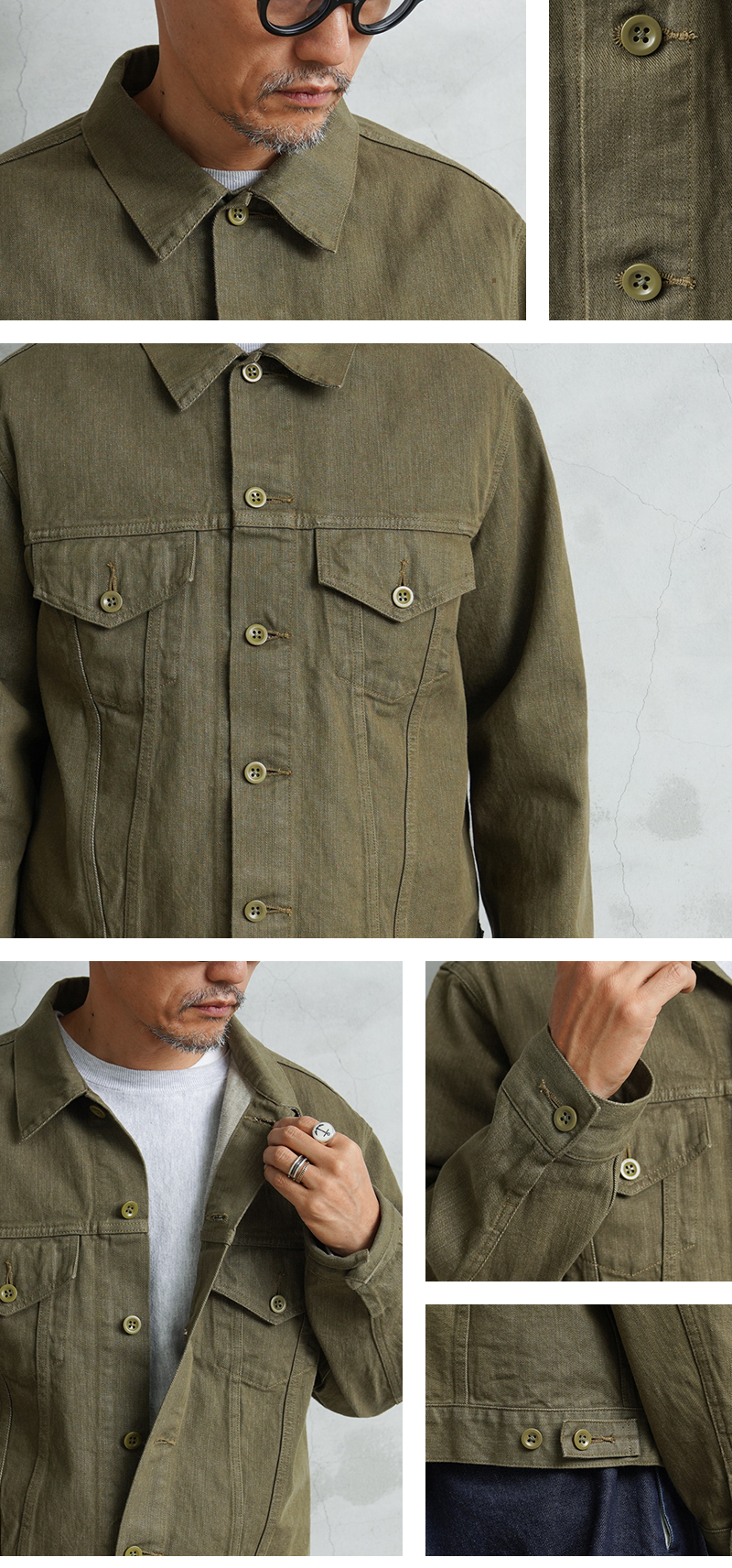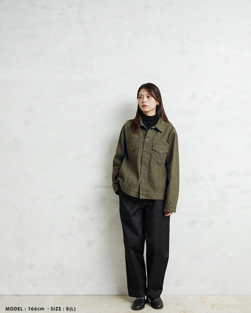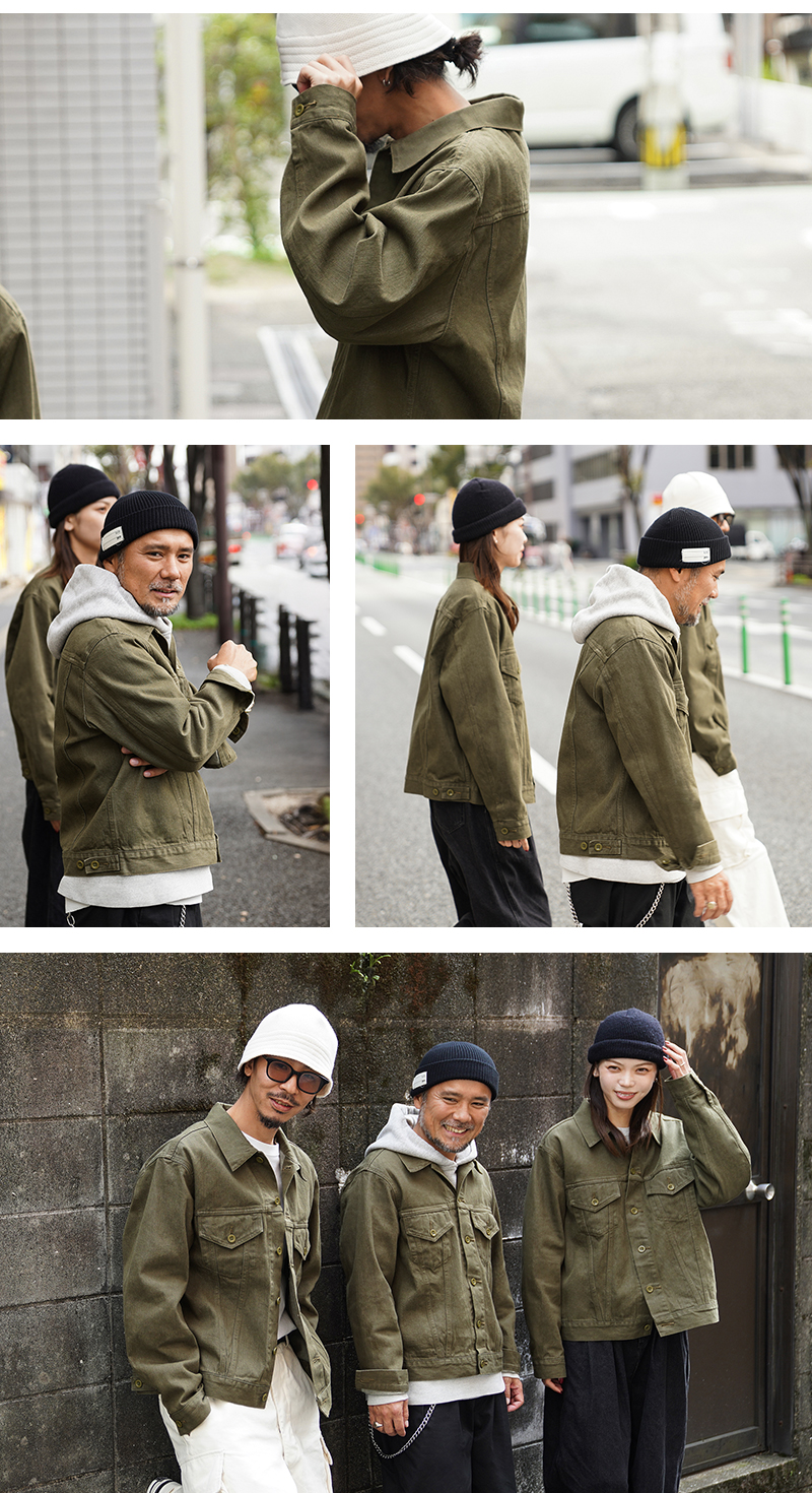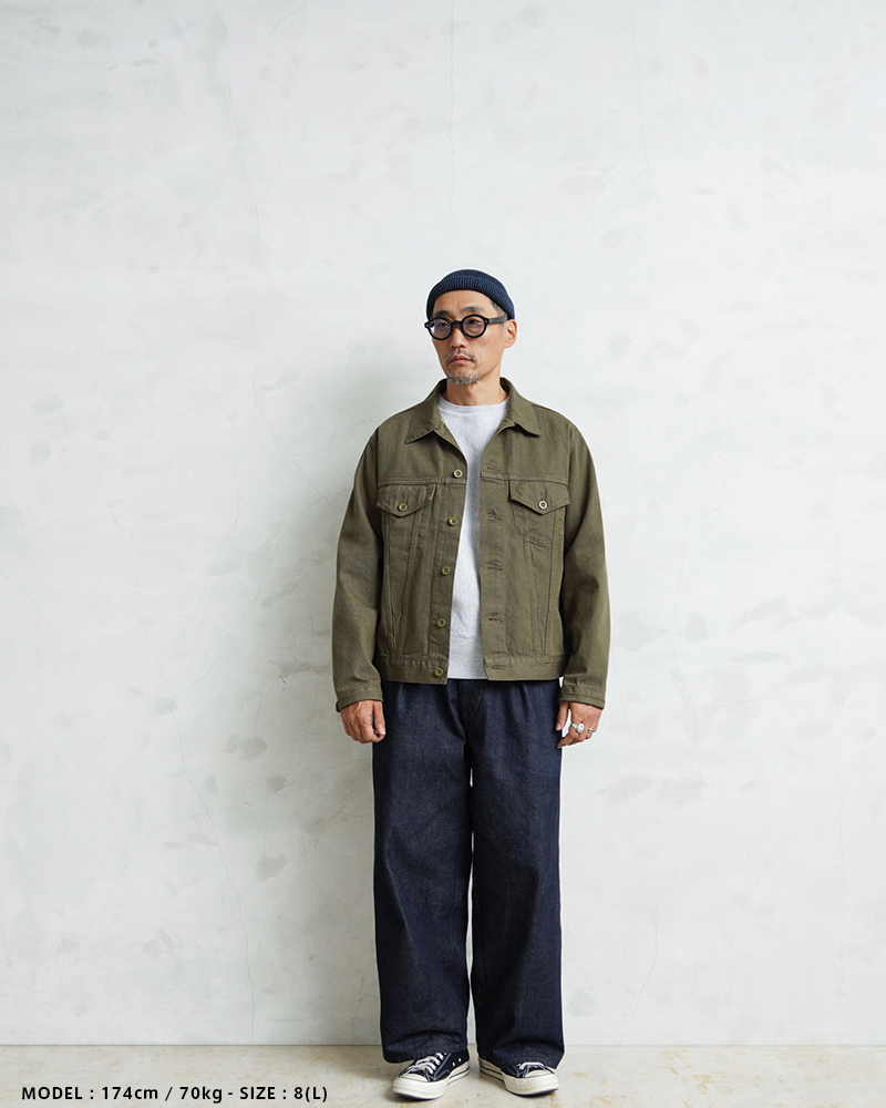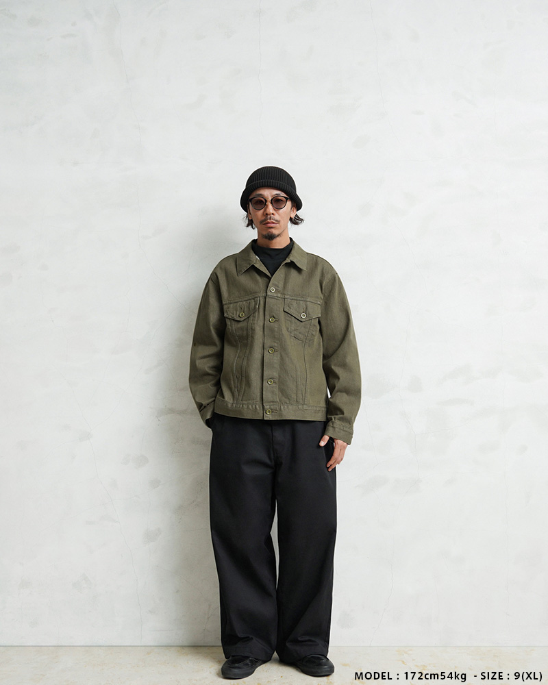 イギリス軍で1950年代に採用されていたグリーンデニム。 当時のヴィンテージデニムを分析・再現した生地を使用し、トラッカージャケットを製作しました。 使用するデニム生地は、実物のアーカイブをもとに国内大手デニムメーカー「カイハラ」と共同開発。 当時の生地を徹底的に分析し、日本国内の工場で織り上げたオリジナルのデニムは、左綾組織と旧式織機によるセルビッジ仕様が最大の特徴です。オリジナルの色合いを再現するため、何度も試作と色出しを繰り返し、洗濯を重ねるごとにヴィンテージさながらの風合いが増していきます。