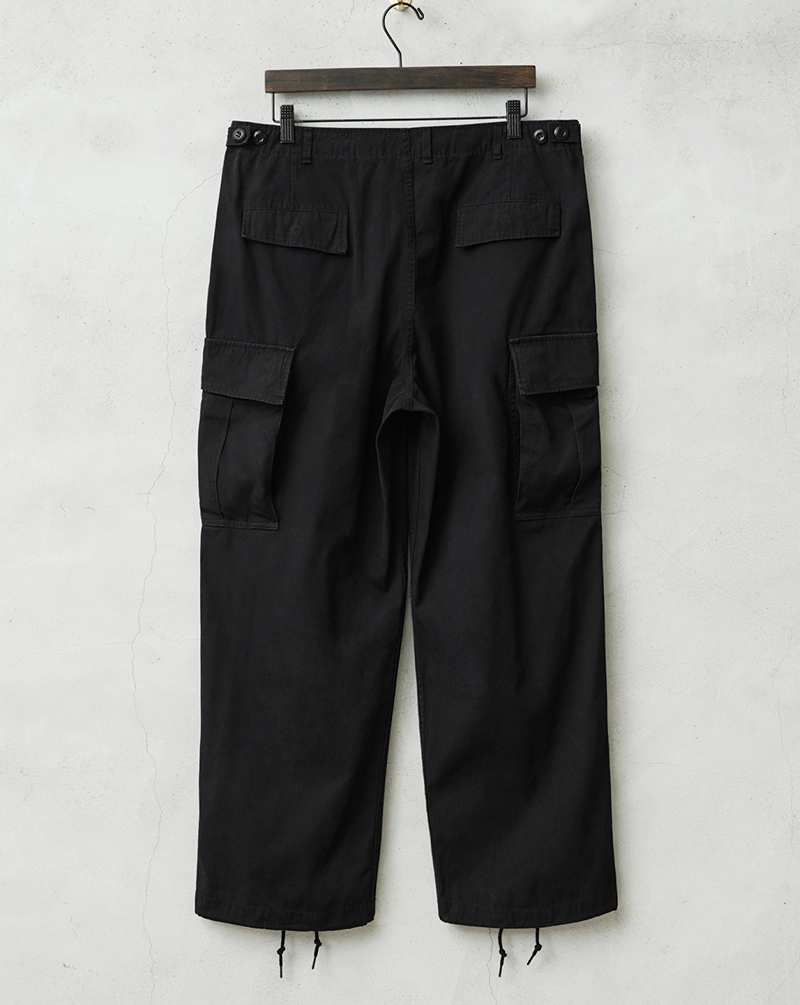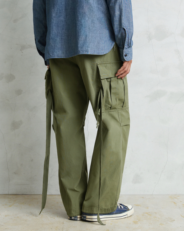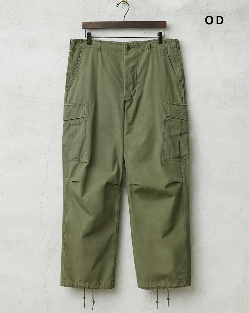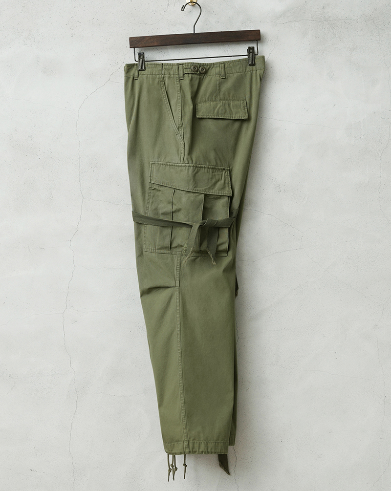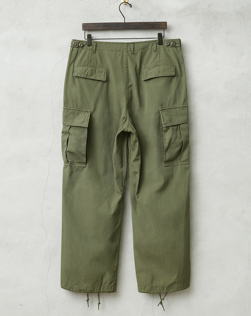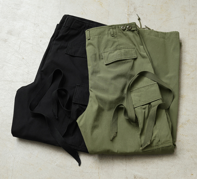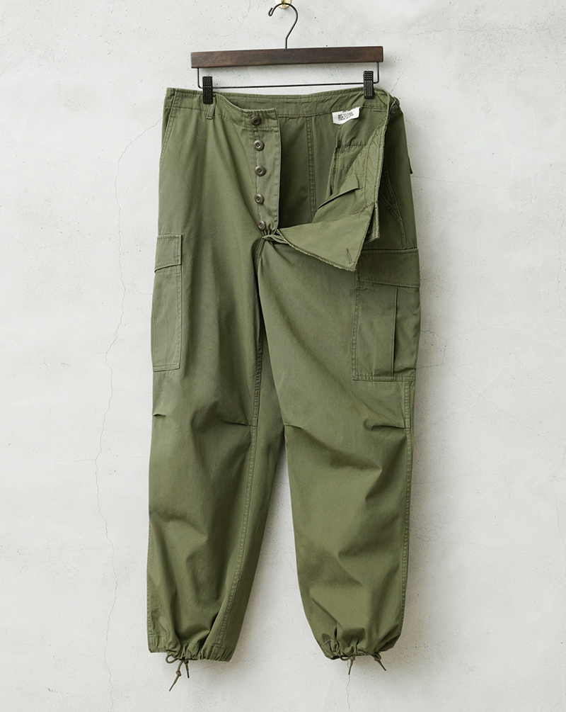 米軍の中でも高い人気を誇るヴィンテージアイテムのJUNGLE FATIGUE。60年代ベトナム戦争時代に採用された熱帯向けの戦闘服です。 年代ごとにさまざまなバリエーションが存在するなか、WAIPER.incでは1stモデルと2ndモデルのボトムスを製作。こちらの2ndモデルは1stをベースにしながらも比翼仕立てにアップデートされたボタン使いや、膝のタック、斜めにカットされたサイドポケットなど随所に使い勝手が考慮されたアップデートが施されています。 ヴィンテージピースでも希少価値の高いアイテムを忠実に再現しつつ、お買い求めいただきやすいプライスを実現しました。