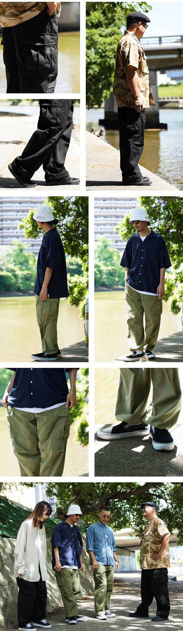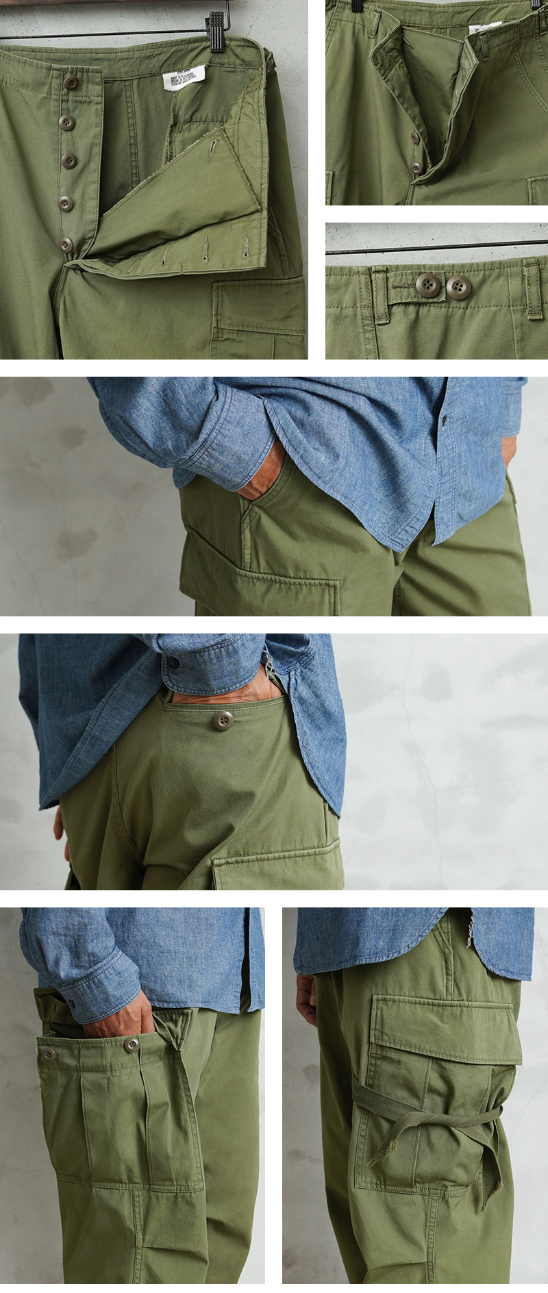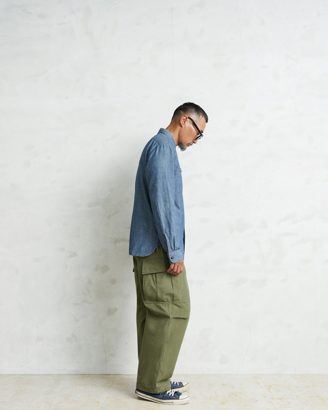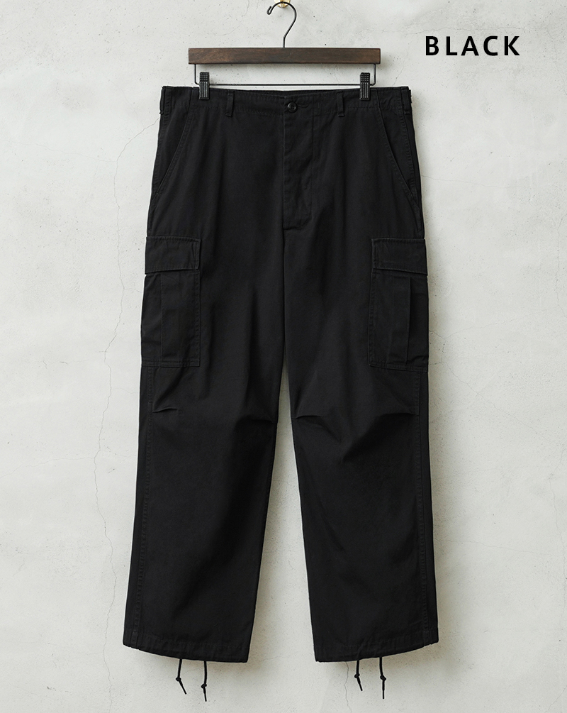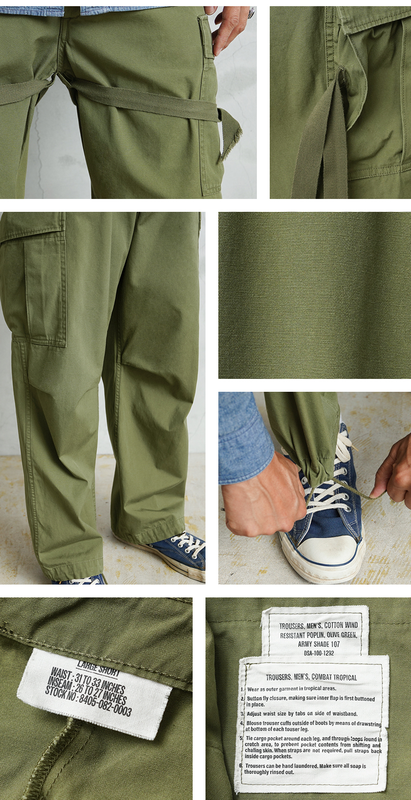 米軍の中でも高い人気を誇るヴィンテージアイテムのJUNGLE FATIGUE。60年代ベトナム戦争時代に採用された熱帯向けの戦闘服です。 年代ごとにさまざまなバリエーションが存在するなか、WAIPER.incでは1stモデルと2ndモデルのボトムスを製作。こちらの2ndモデルは1stをベースにしながらも比翼仕立てにアップデートされたボタン使いや、膝のタック、斜めにカットされたサイドポケットなど随所に使い勝手が考慮されたアップデートが施されています。 ヴィンテージピースでも希少価値の高いアイテムを忠実に再現しつつ、お買い求めいただきやすいプライスを実現しました。