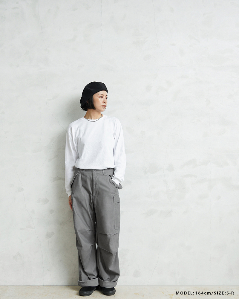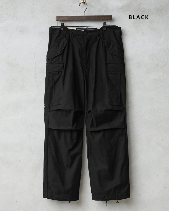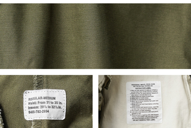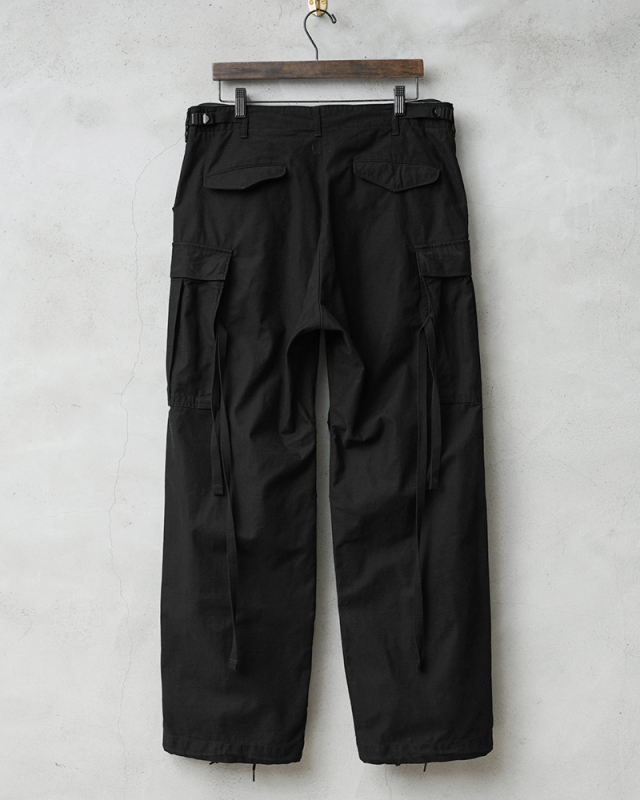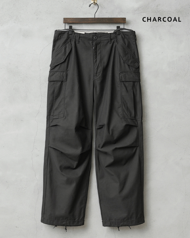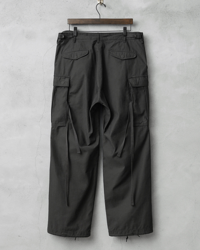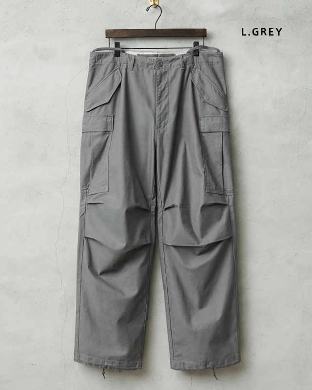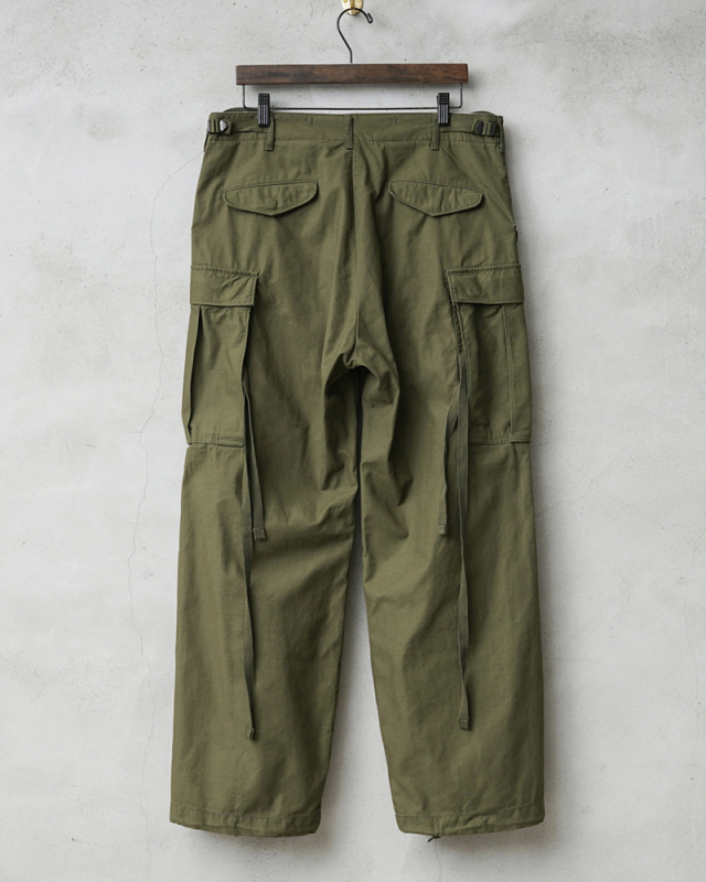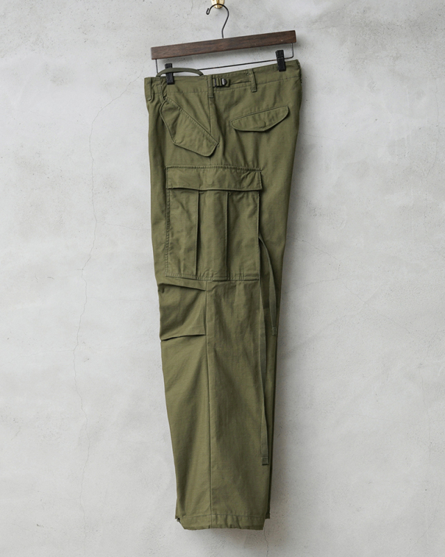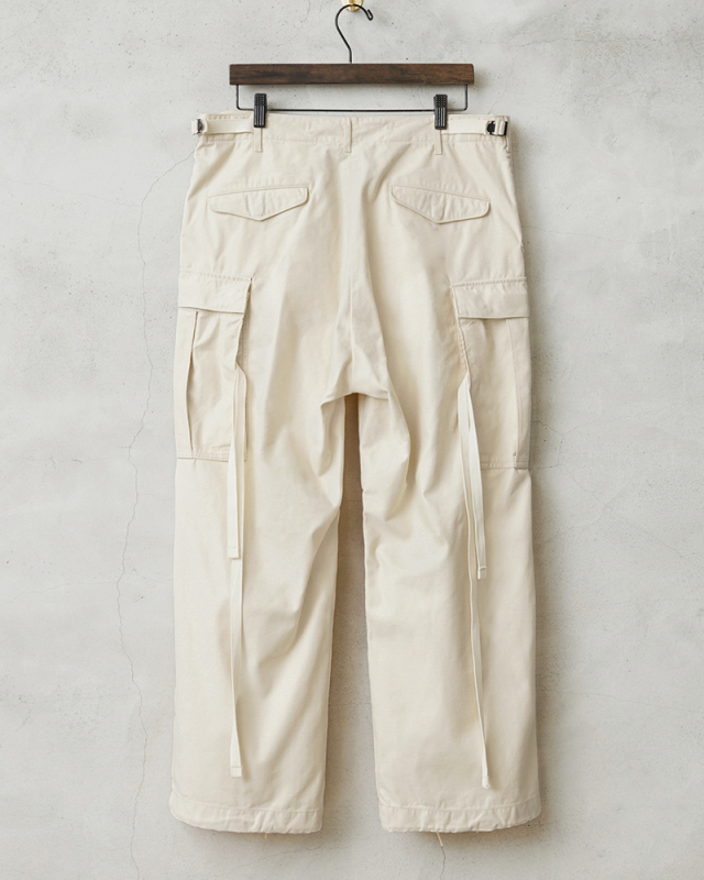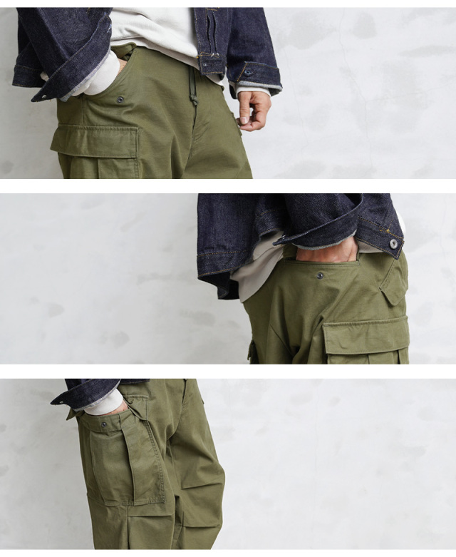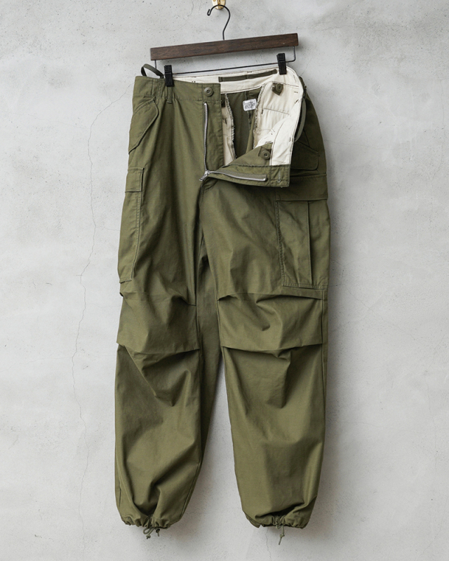 カーゴパンツの代名詞ともいえるデザインは60年代に採用されたアイテムながら、今見てもまったく古臭さを感じさせない名作となります。実物品は現在出回ることもほとんどない昨今、随所にこだわりを持って再現させていただきました。 元々は寒冷地帯での防寒用に作られており、下にもう一枚履けるよう太めのシルエットが特徴的。コットンとナイロンを混紡したサテン生地は実物を見本にオリジナルで製作させていただきました。部材やディテール、ヴィンテージ感のあるアルミのファスナーと、細部まで作り込んだ自信作となっています。