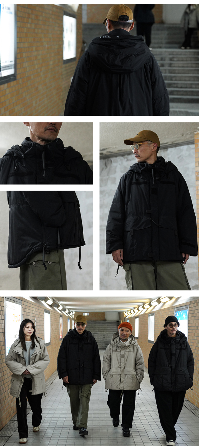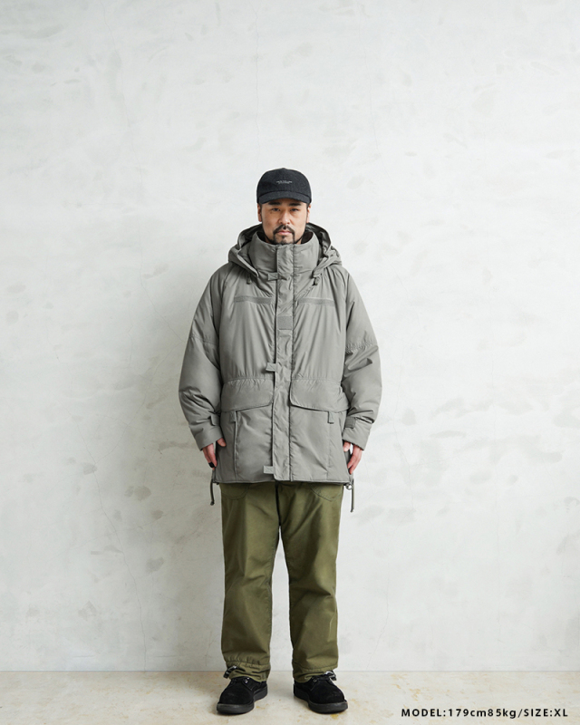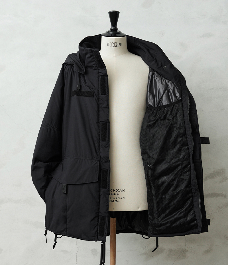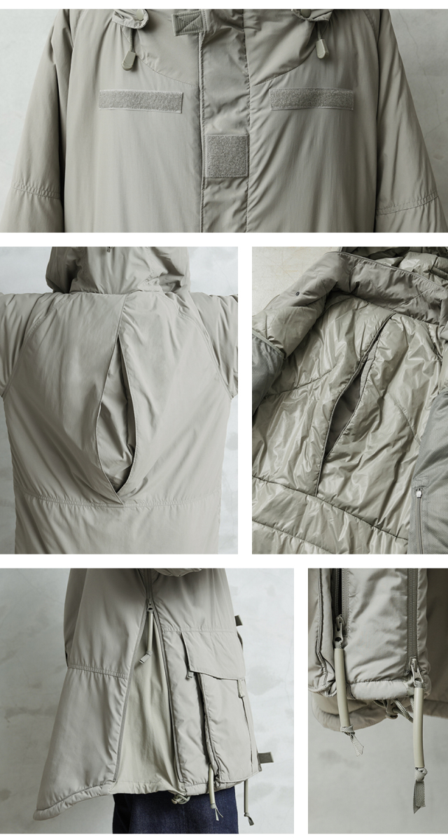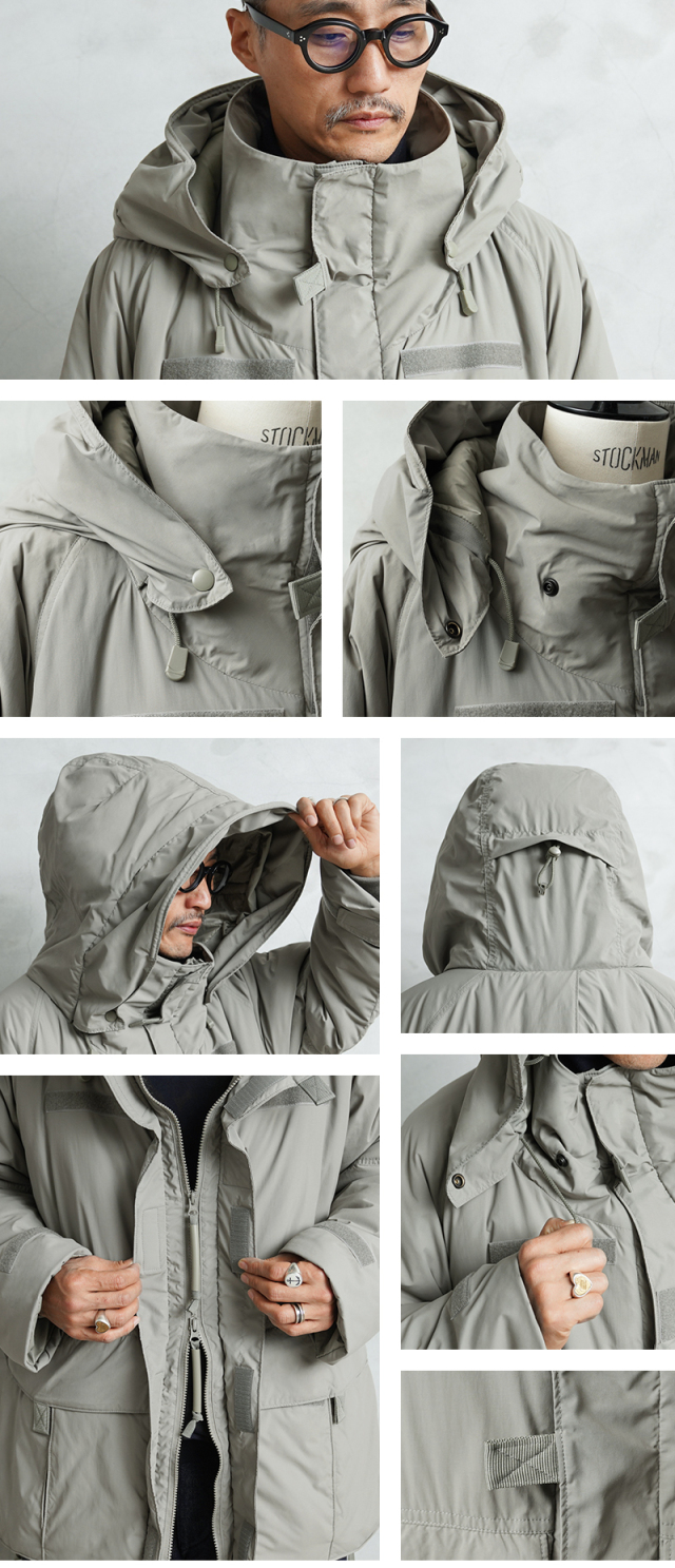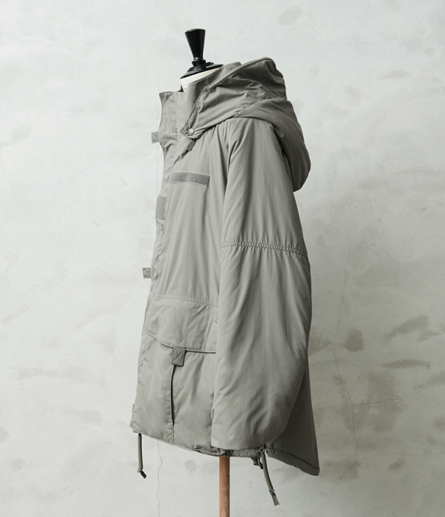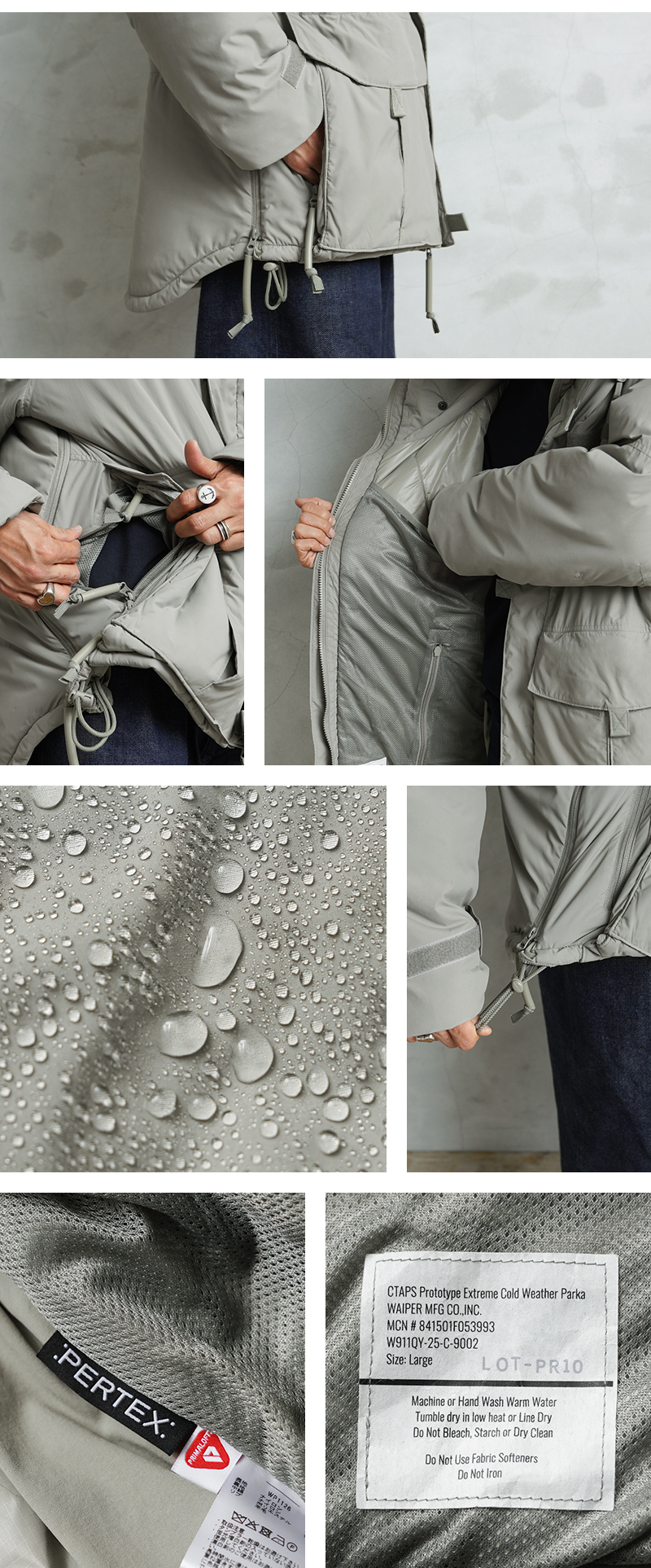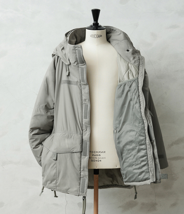 2020年代から現在にかけて、米軍が北極圏での行動を視野に開発を進めている次世代レイヤリングシステム CTAPS(Cold Temperature and Arctic Protection System)。 ECWCSが7段階のレイヤー構造であるのに対し、CTAPSは5段階へとシンプルに再設計されています。 ディテールは実物を徹底的に踏襲しつつ、機能性と唯一無二のインパクトあるデザインを両立。LEVEL7とモンスターパーカーを掛け合わせたようなシルエットは、長めに設定された着丈によって腰回りまでしっかり覆い、防風性・防寒性と都会的な佇まいを両立させています。