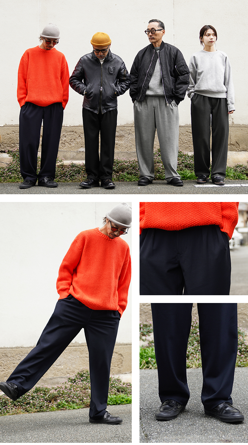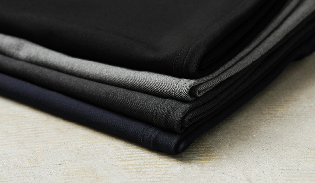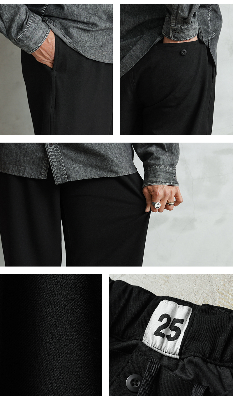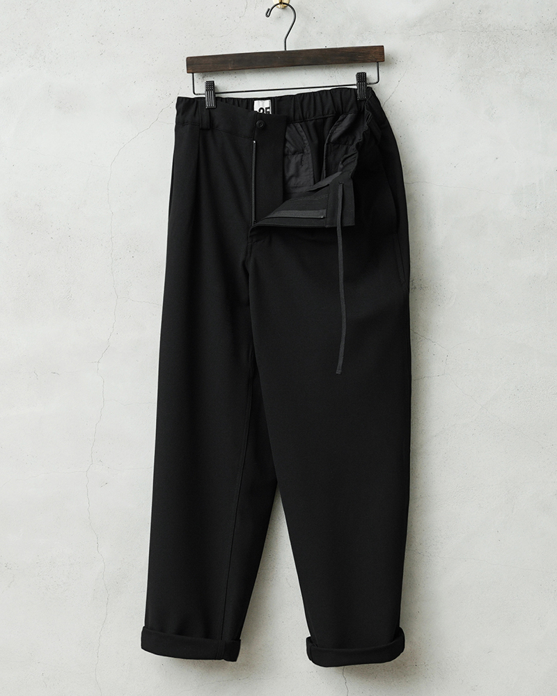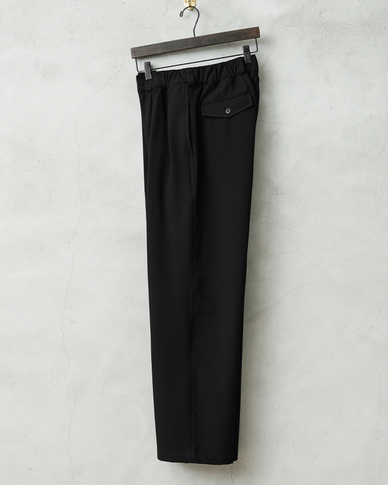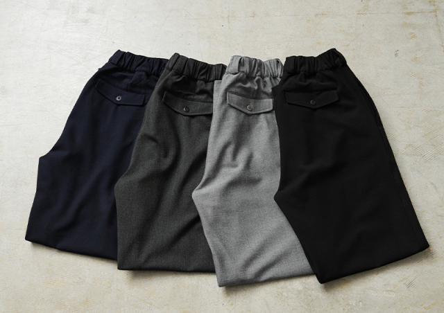 なめらかな肌触りと優れた伸縮性を備えた高機能素材を使用したスラックスを製作しました。 国産テキスタイルメーカーのストレッチファブリックを使用。しわになりにくくお手入れも楽な4WAYストレッチの生地は、縦横に優れた伸縮性を有します。繊維に浸透させたアルガンオイルにより肌当たりもなめらかでシルキーな質感が特徴です。