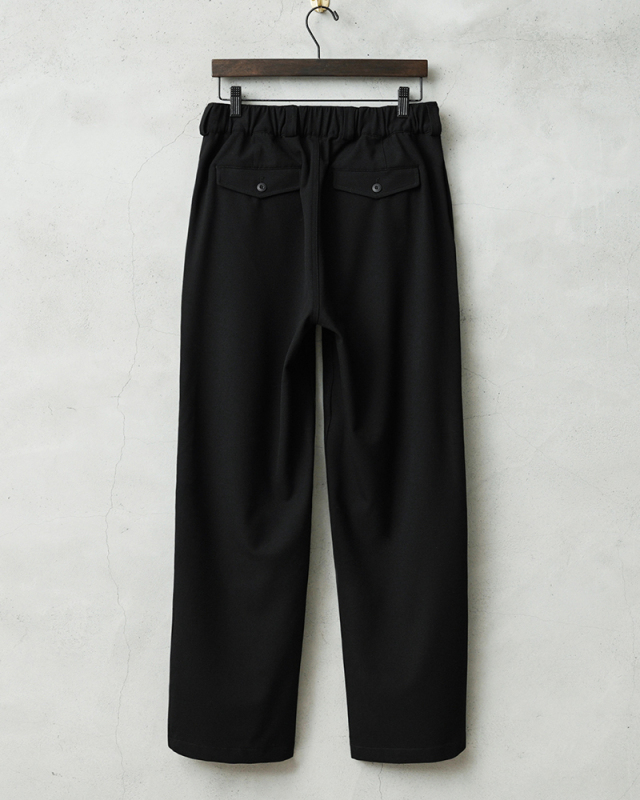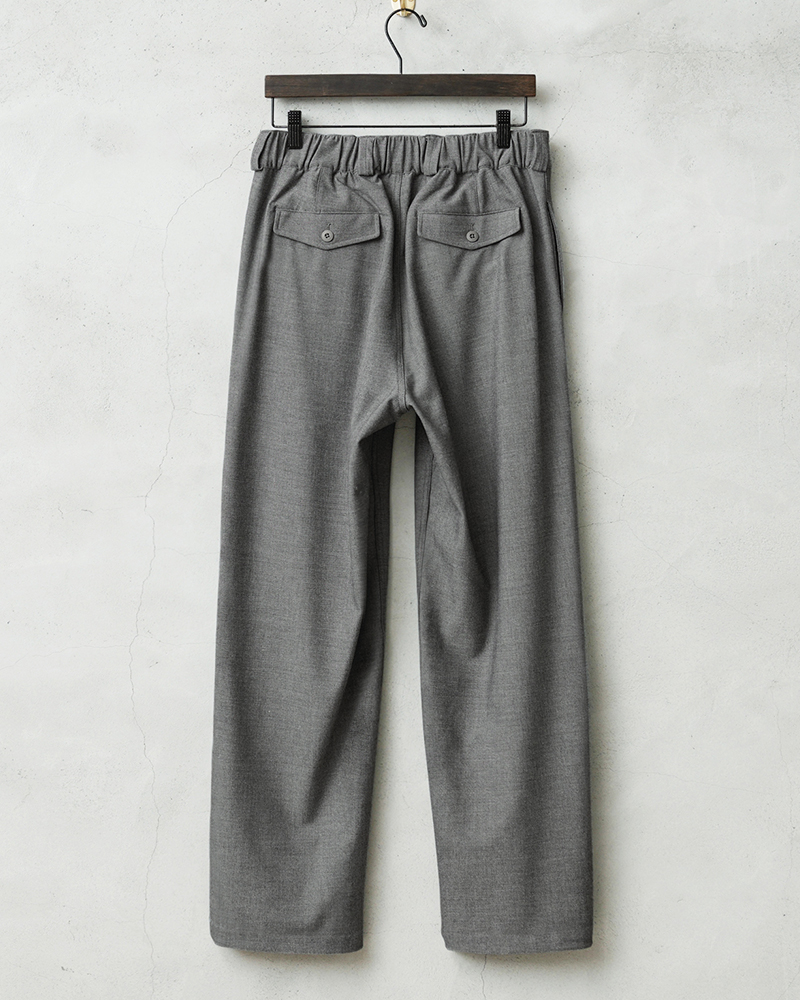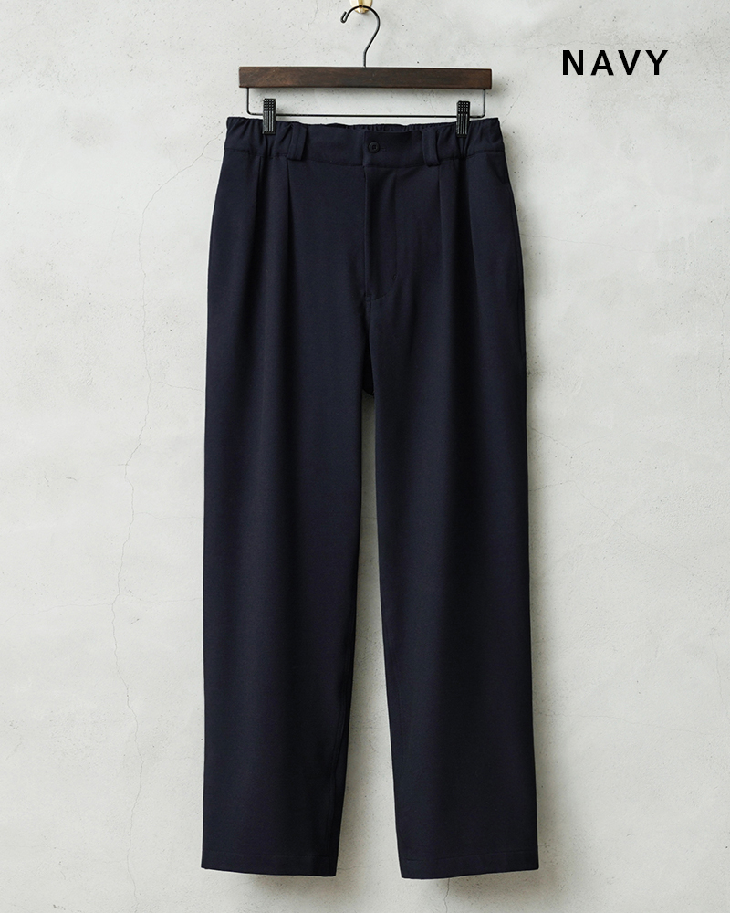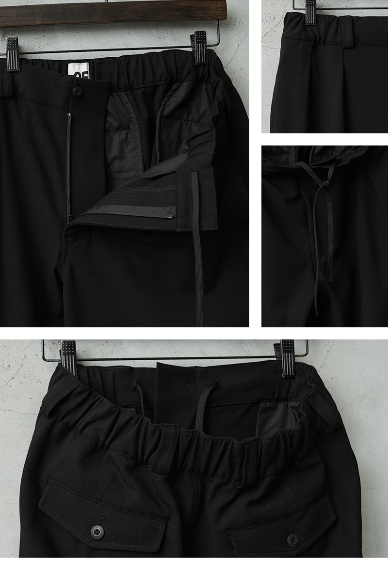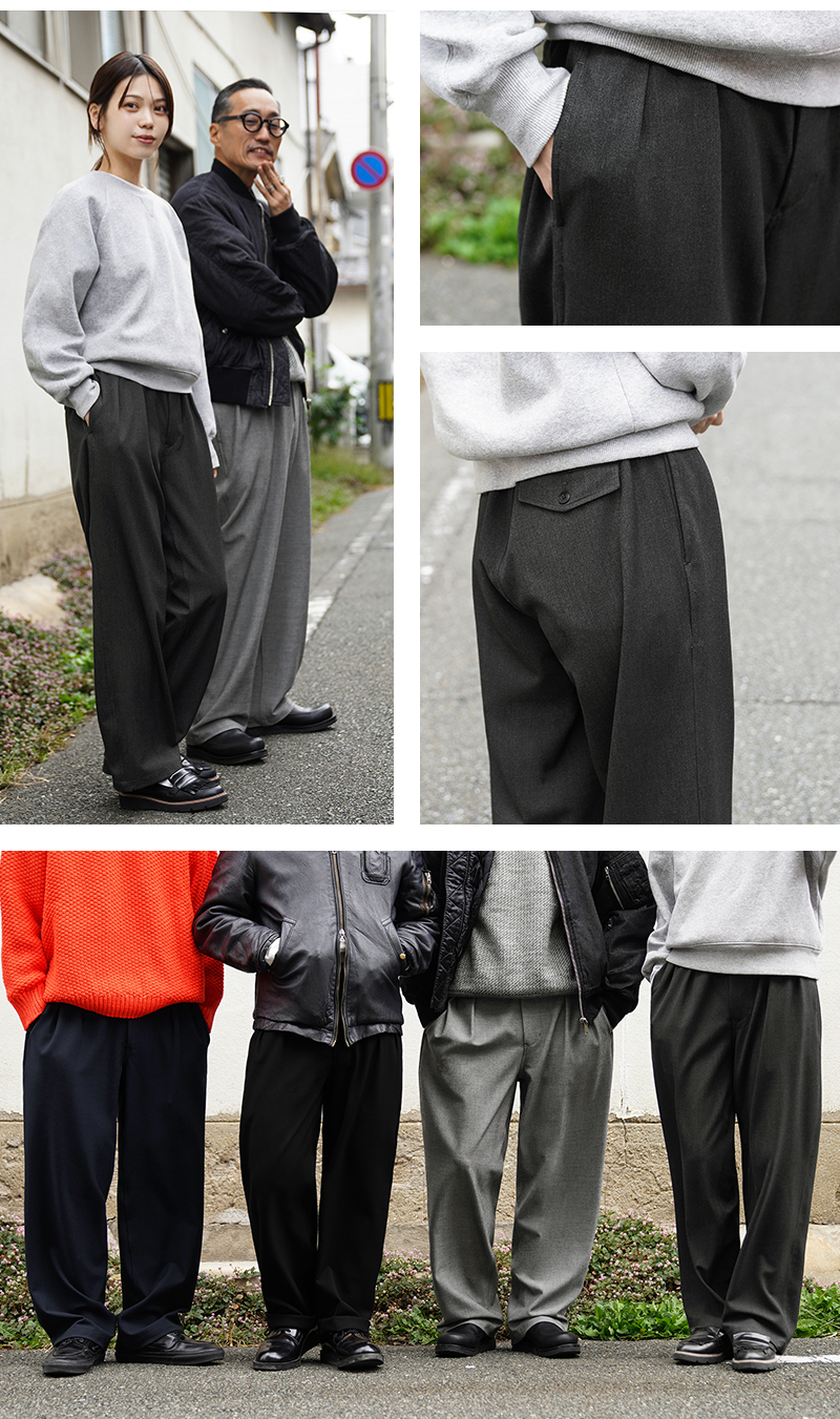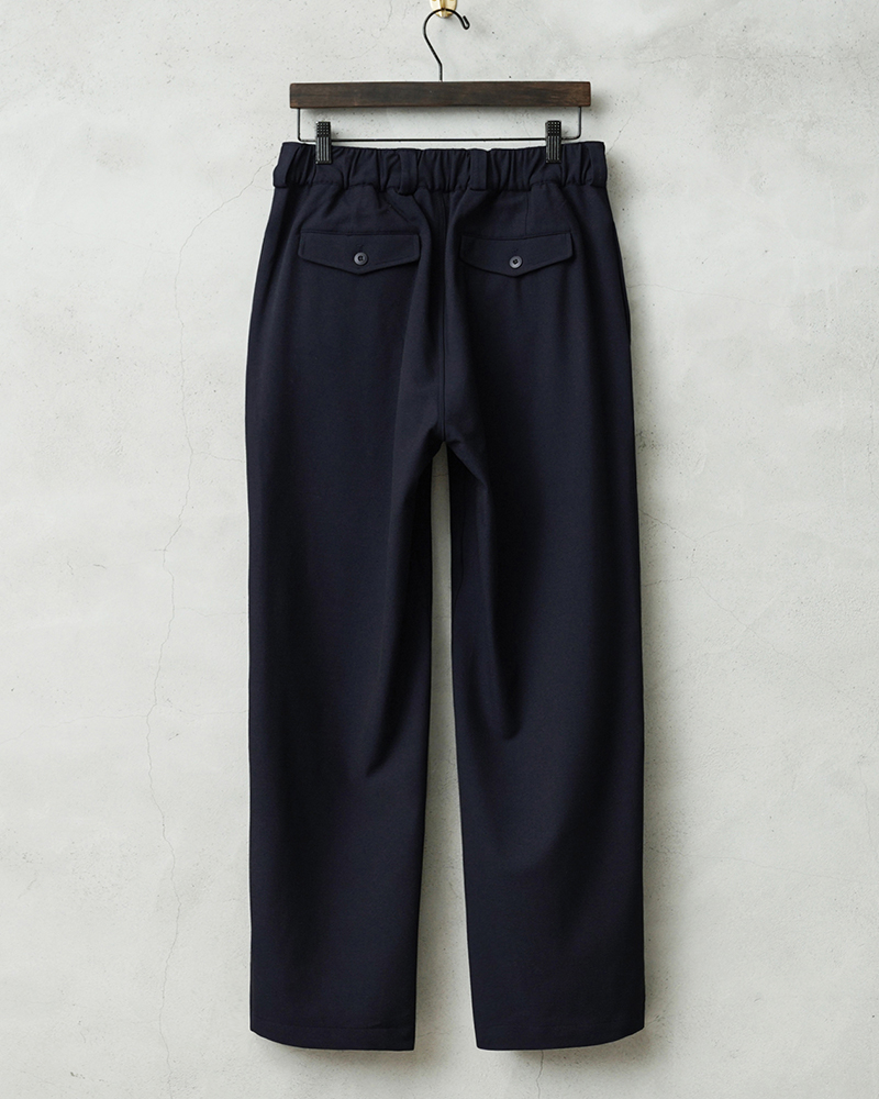なめらかな肌触りと優れた伸縮性を備えた高機能素材を使用したスラックスを製作しました。 国産テキスタイルメーカーのストレッチファブリックを使用。しわになりにくくお手入れも楽な4WAYストレッチの生地は、縦横に優れた伸縮性を有します。繊維に浸透させたアルガンオイルにより肌当たりもなめらかでシルキーな質感が特徴です。