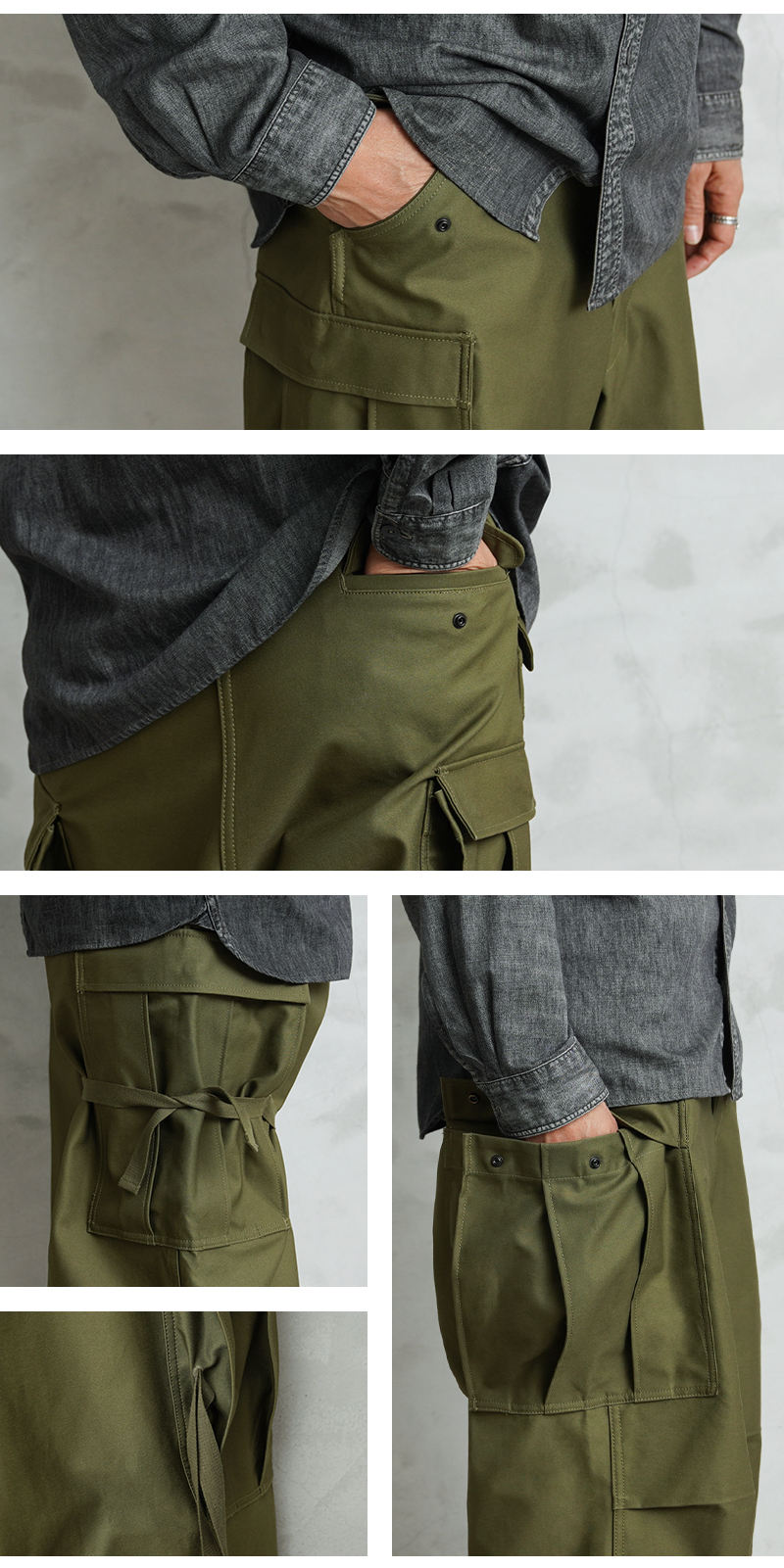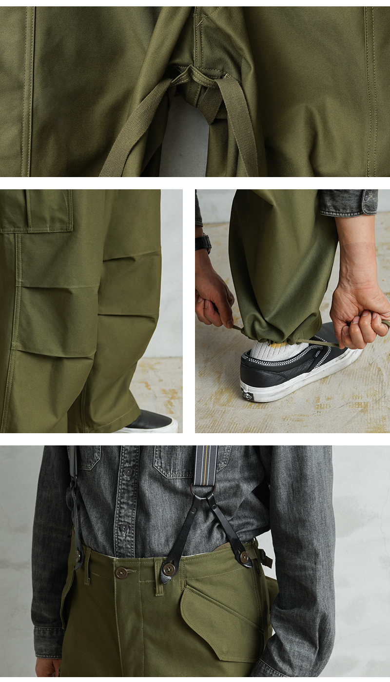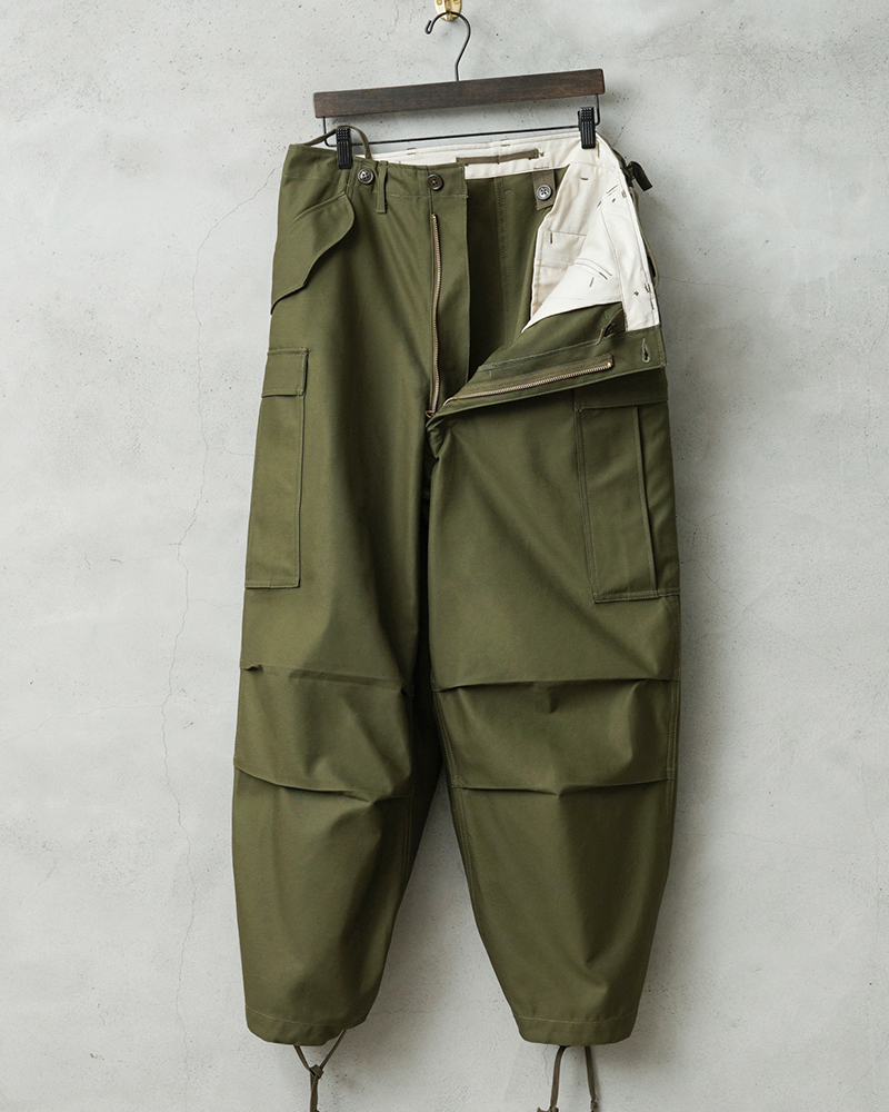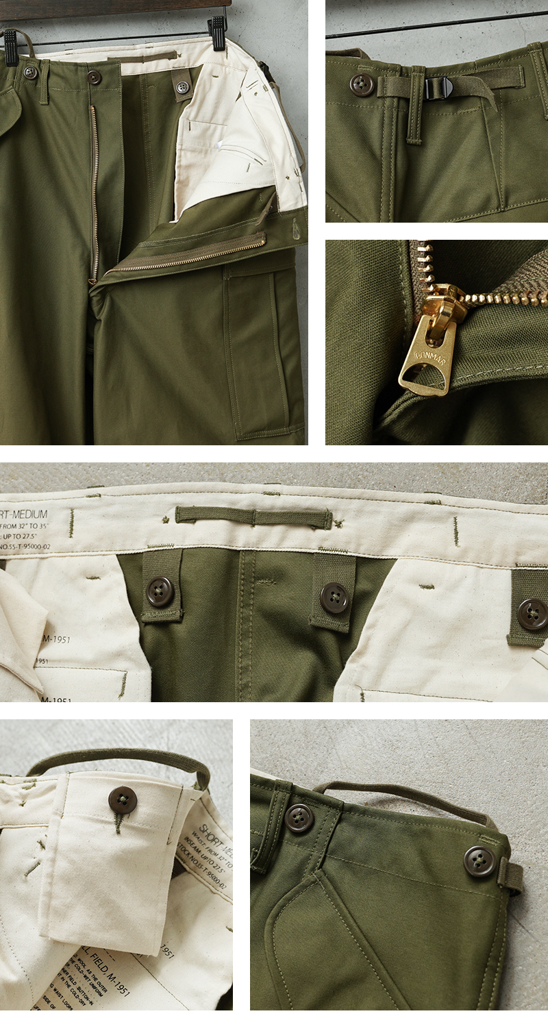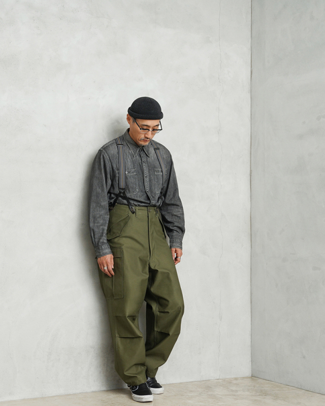 M-51パンツは、現代におけるカーゴパンツの原型として知られ、後継のM-65と並び米軍ミリタリーパンツを代表する存在。1950年代の朝鮮戦争期に採用された「M-51シリーズ」は、モッズコートとして知られるパーカーやフィールドジャケットと同型番で統一されたユニフォームラインであり、極寒地での運用も想定し、着脱式ライナーを装着できる設計が特徴です。 本作は、流通するM-51の中でもレギュラーの仕様を再現したスタンダードモデルとなります。実物が持つ圧倒的な存在感を表現するため、素材からシルエットまで徹底的にこだわり完成させました。 生地には、オリジナルで織り上げたコットンサテン生地を採用。洗い込むほどに風合いが増し、ヴィンテージさながらの経年変化を楽しめます。重量感のある生地が生む立体的なシルエットも魅力です。 サスペンダーボタンやウエストアジャスター、キルティングライナー用のボタンも再現。もちろんライナー装着も可能で、実用性と忠実な再現性を両立しています。