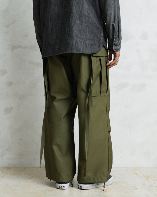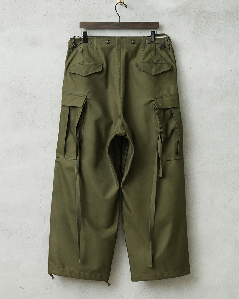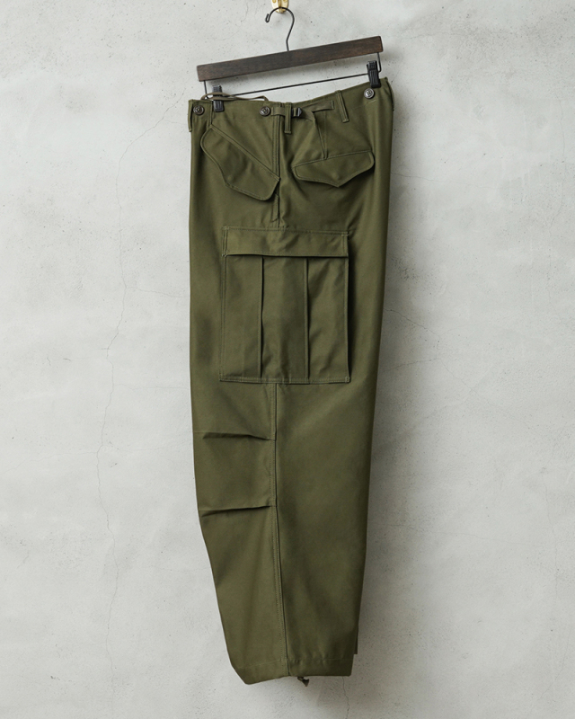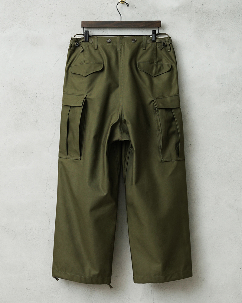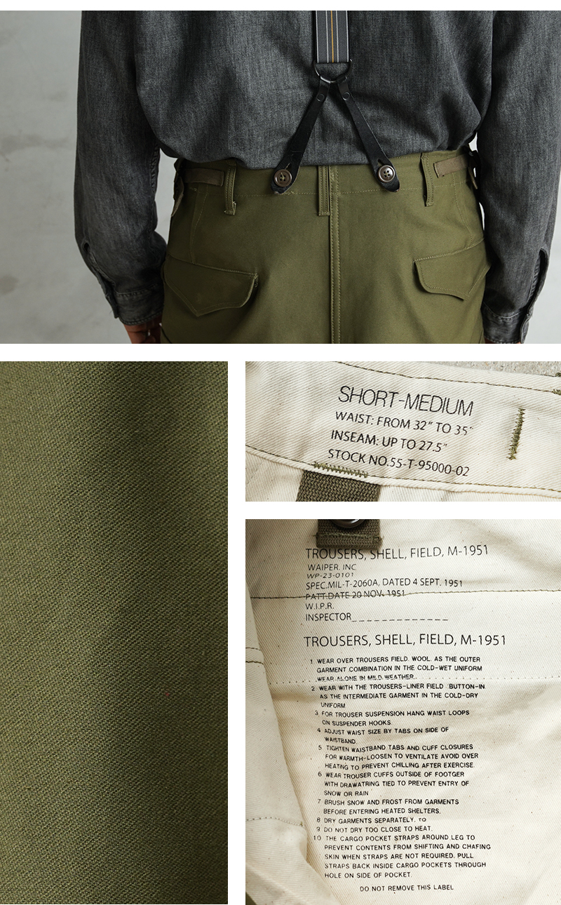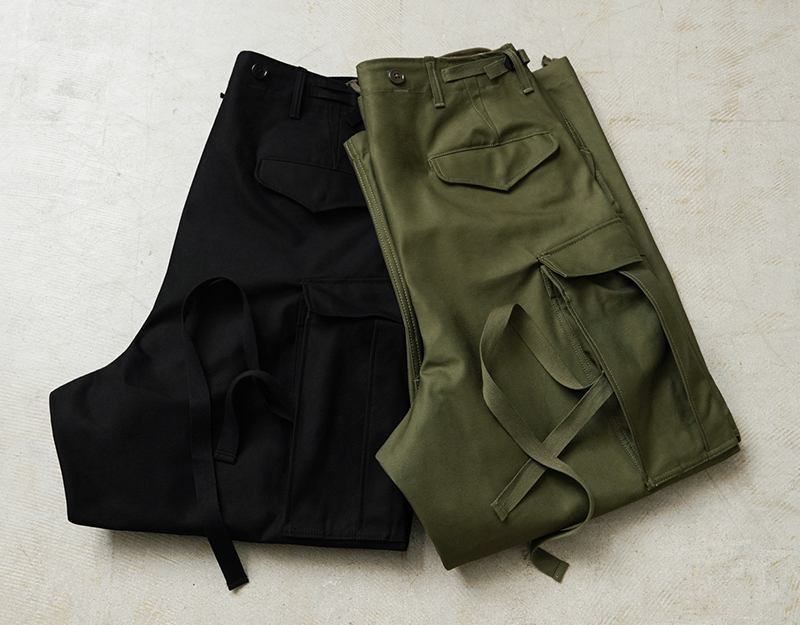 M-51パンツは、現代におけるカーゴパンツの原型として知られ、後継のM-65と並び米軍ミリタリーパンツを代表する存在。1950年代の朝鮮戦争期に採用された「M-51シリーズ」は、モッズコートとして知られるパーカーやフィールドジャケットと同型番で統一されたユニフォームラインであり、極寒地での運用も想定し、着脱式ライナーを装着できる設計が特徴です。 本作は、流通するM-51の中でもレギュラーの仕様を再現したスタンダードモデルとなります。実物が持つ圧倒的な存在感を表現するため、素材からシルエットまで徹底的にこだわり完成させました。 生地には、オリジナルで織り上げたコットンサテン生地を採用。洗い込むほどに風合いが増し、ヴィンテージさながらの経年変化を楽しめます。重量感のある生地が生む立体的なシルエットも魅力です。 サスペンダーボタンやウエストアジャスター、キルティングライナー用のボタンも再現。もちろんライナー装着も可能で、実用性と忠実な再現性を両立しています。