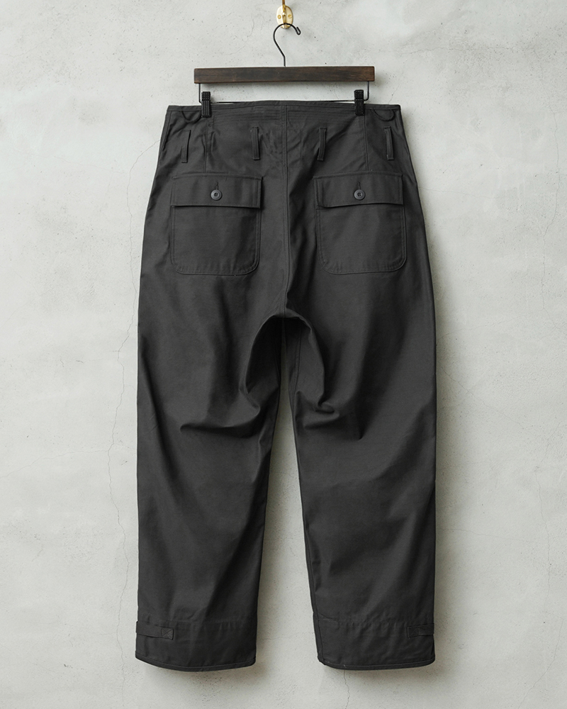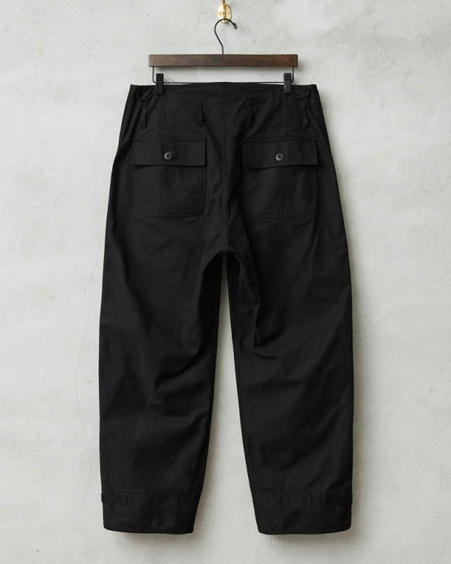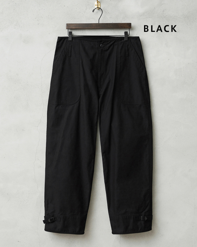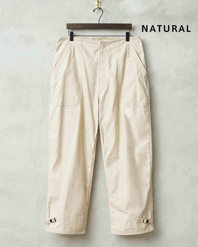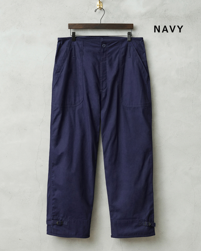 | 商品説明 | WAIPER.inc 米軍 U.S.NAVY A-2 1レイヤー デッキパンツのご紹介です。 品番:WP126 U.S. NAVY(アメリカ海軍)が艦上作業用パンツとして採用していた「A-2 デッキパンツ」を、現代のライフスタイルに合わせて大胆にアレンジ!従来の冬用仕様を見直し、最大の特徴だった裏地を省くことで、通年通して着用可能な一本へと進化させました。 裏地がない分、軽やかで快適な着心地を実現し、春夏でも気軽にコーディネートに取り入れられます。「デザインは好きだけど冬しか履けないのが残念」という声に応える、新たな選択肢です。 ストンと落ちる適度なワイドシルエットと緩やかなテーパードラインはそのまま継承。コットン50%/ナイロン50%の混率で制作したオリジナルのバックサテン生地を使用しており、季節を問わず使いやすい軽量さと丈夫さが魅力です。 フロントにはベイカーパンツのような深めのパッチポケットを採用し、ジャケットを羽織った際にもポケットデザインがアクセントになります。バックポケットは両サイドに配置され、バランスと実用性を兼ね備えた仕様にアップデートしました。 裾にはアジャスターが付属し、シルエットの調整が可能。また、ウエスト部分にはベルトループに加えてサイドループを設け、サスペンダーを使ったスタイリングも楽しめます。 軽やかな履き心地と無駄のないディテールで、季節を問わず活躍する新たなA-2デッキパンツをぜひお試しください! |