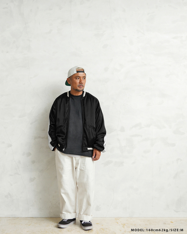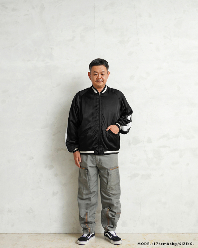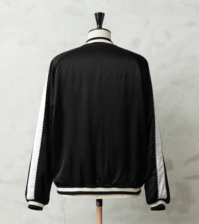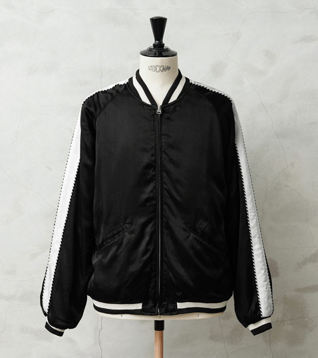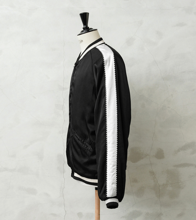 潔くあえての刺繍無しのシンプルなデザイン。 スカジャンを象徴する鷲、虎、龍などの刺繍を一切いれず、配色も黒/白のモノトーンにおさえてます。 そうする事でファッションコーデの際に生じるスカジャン特有のハードルを低くし、幅広い層に馴染める雰囲気となっております。 しかし、素材/ディテールには一切妥協はなく肌馴染みが良く、シルクのような光沢感が特徴のレーヨンサテン100%、ジッパーはアメリカの生産背景を持つ【IDEAL/アイディール】社製の物を使用しています。