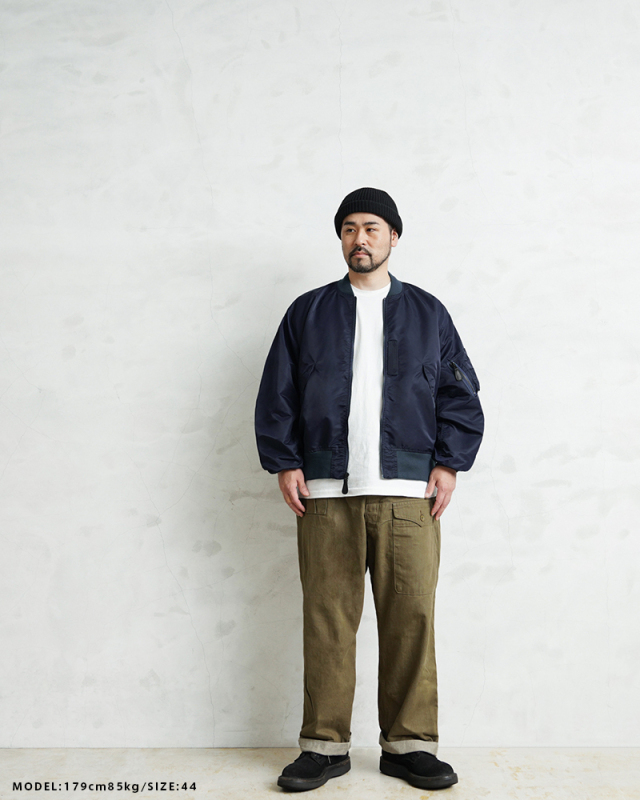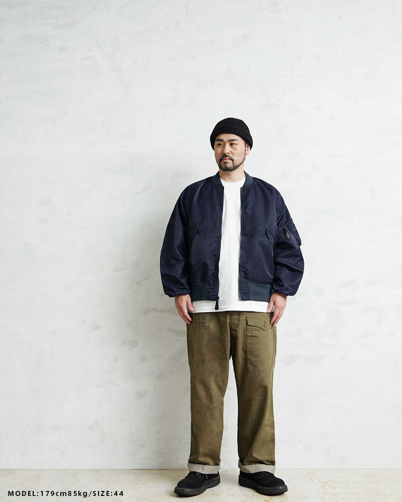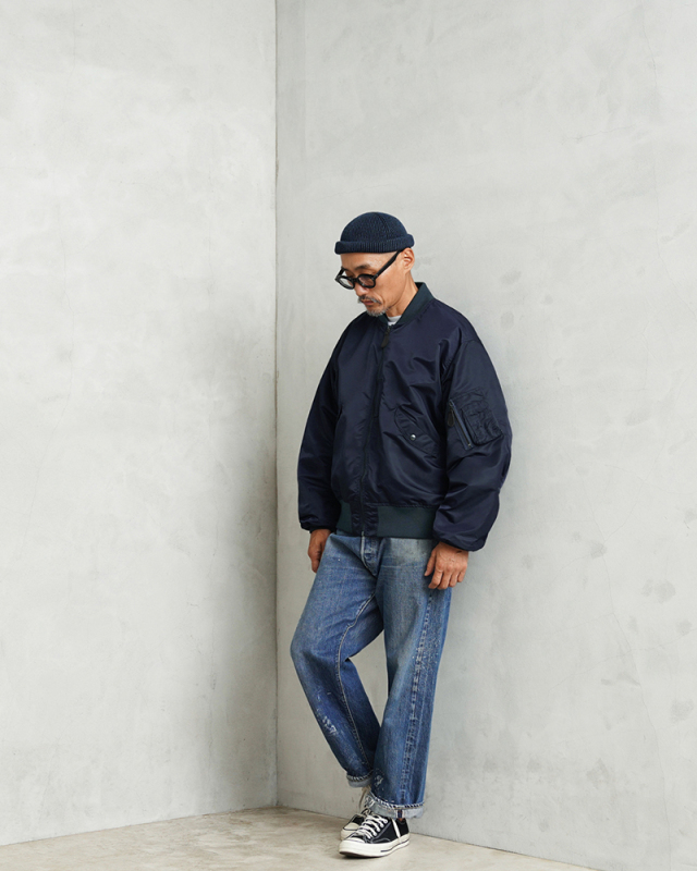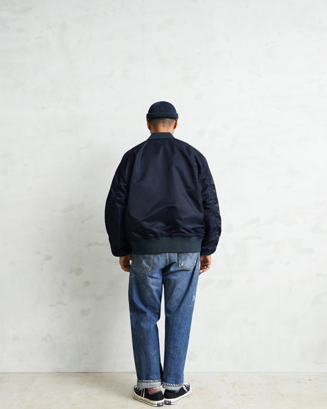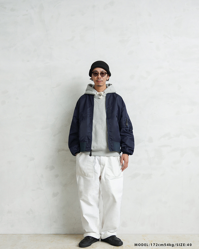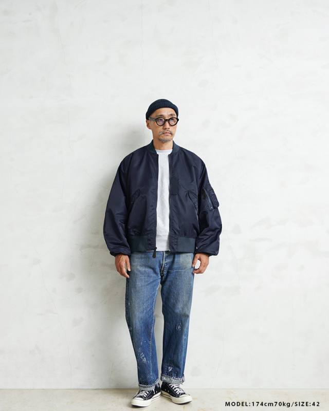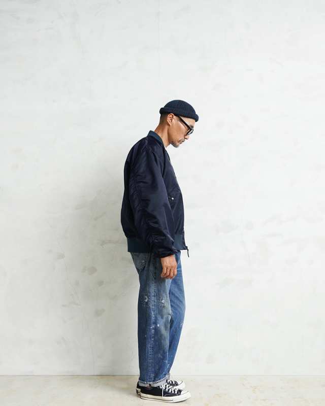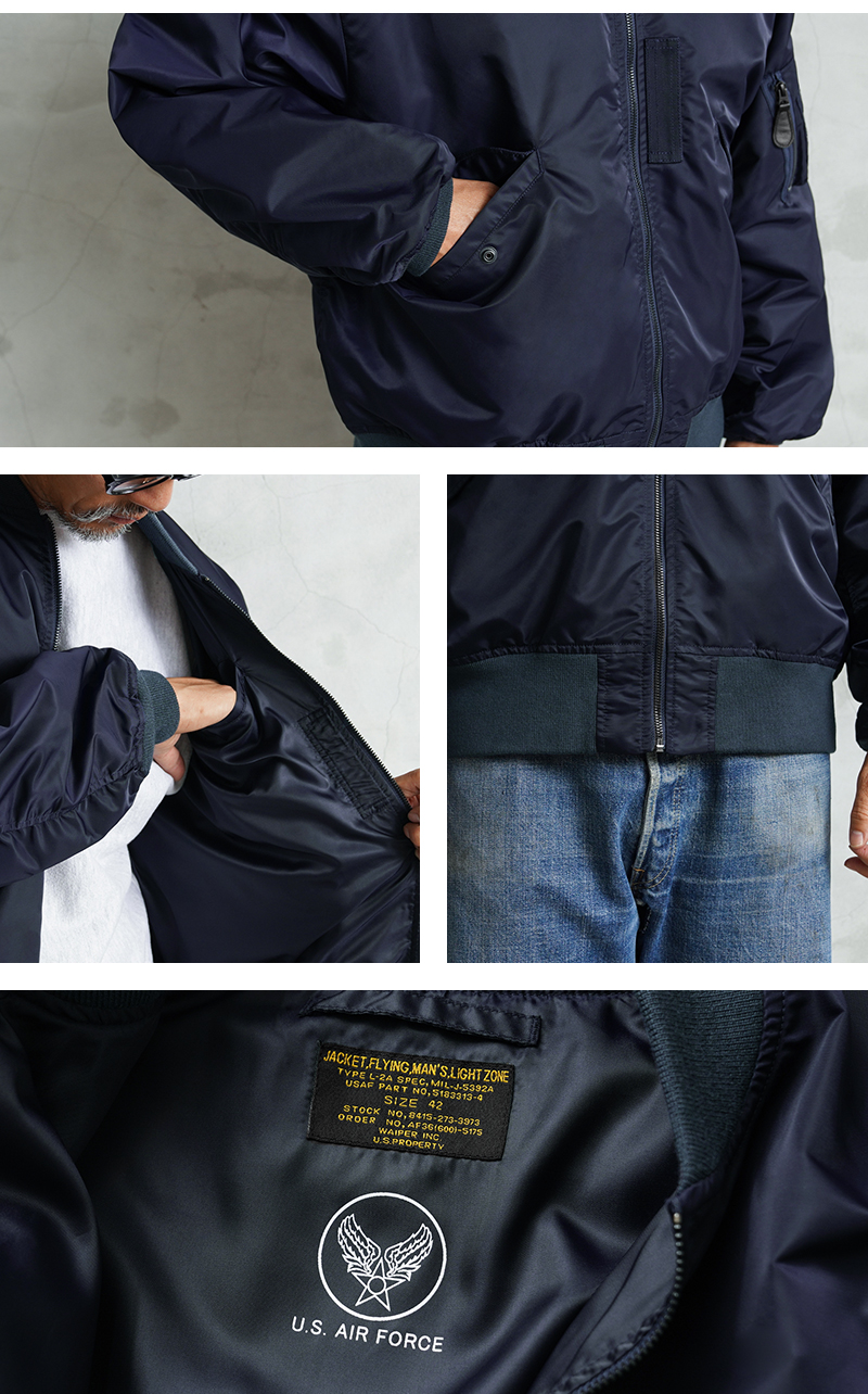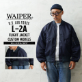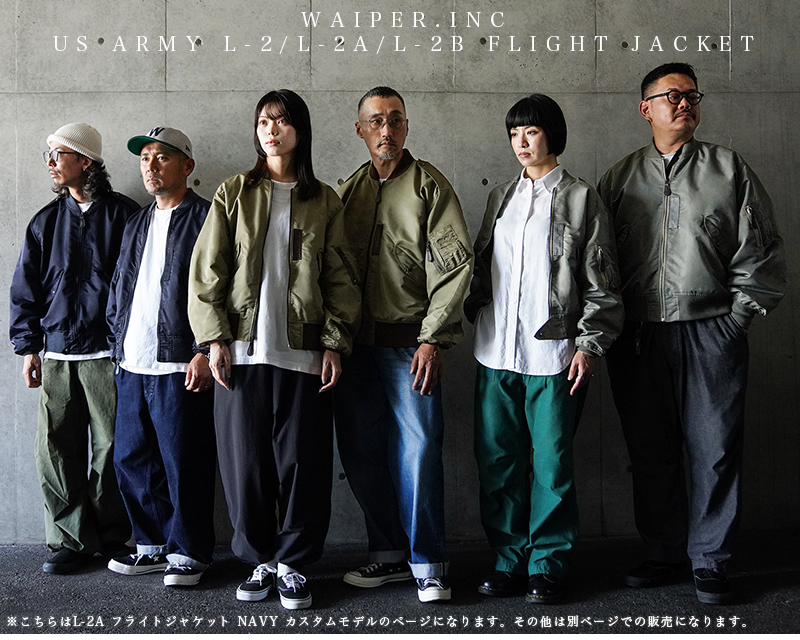 1945年にA-2の後継として登場したL-2は、ライト・ゾーン(10℃~30℃)と呼ばれる温度域での着用が想定された軽量なフライトジャケット。MA-1など一般的なフライトジャケットは防寒用の中綿が詰まっているのに対し、ゴワつきの無いスッキリとしたシルエットが特徴です。 WAIPER.incでは、当時のフライトジャケットにみられるボディに比べて褪色したリブの色差を再現。こちらのモデルはL-2の特徴であるエポレットと裾の三角フラップを廃しシンプルに仕上げたカスタムモデルとなります。