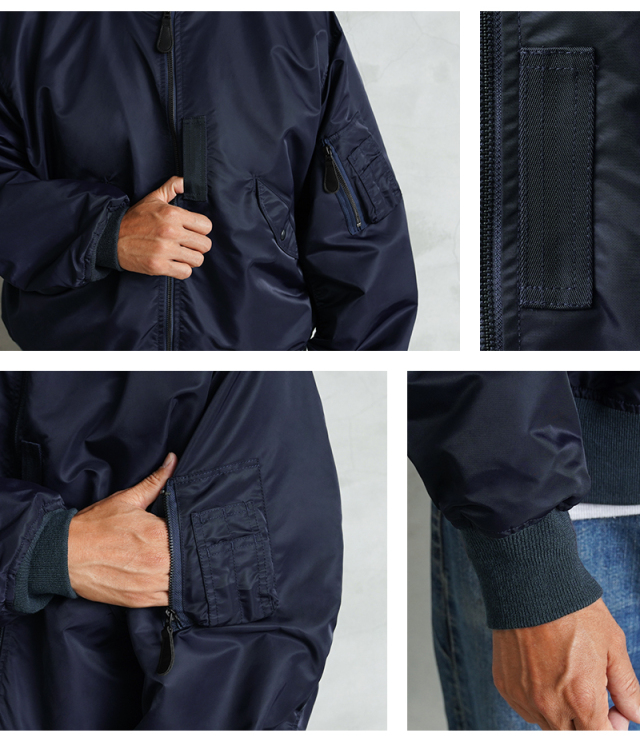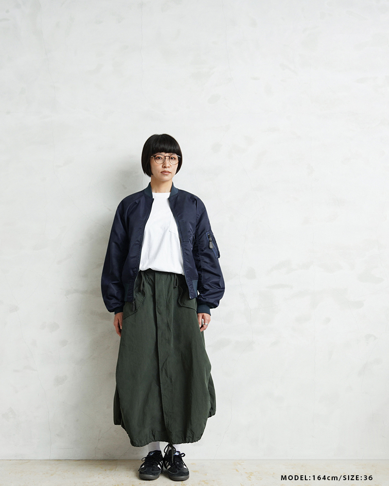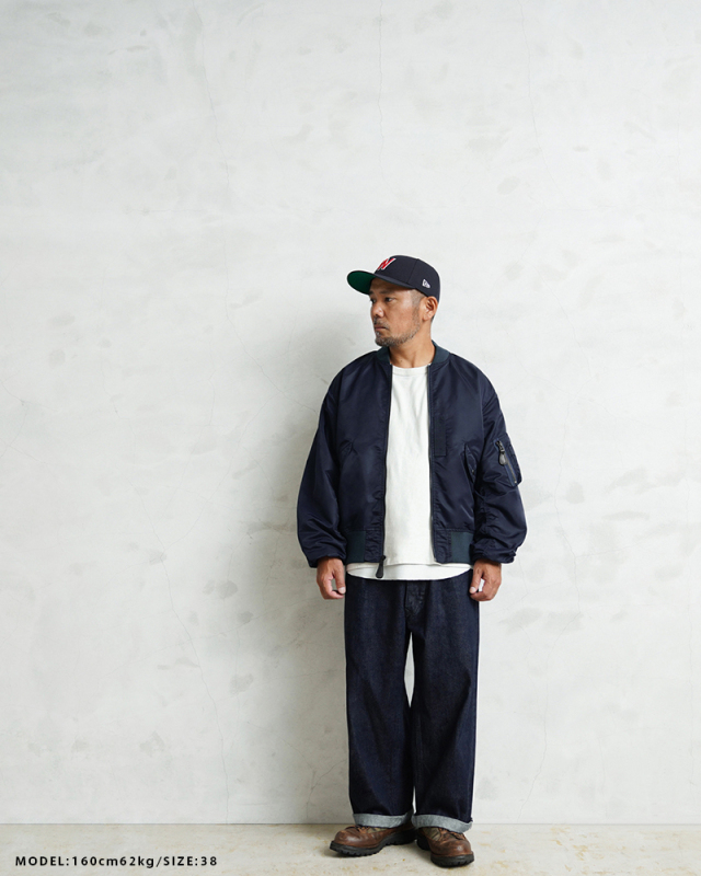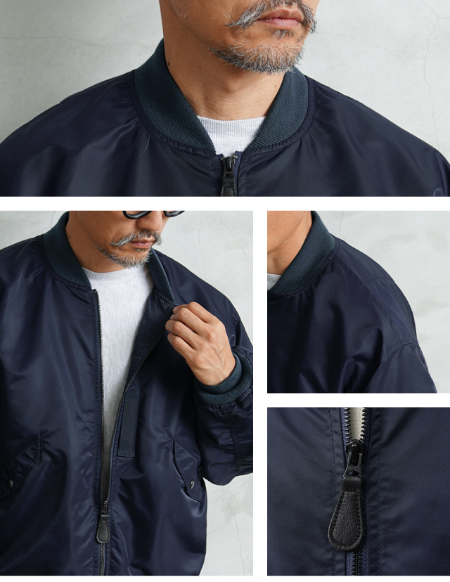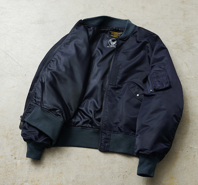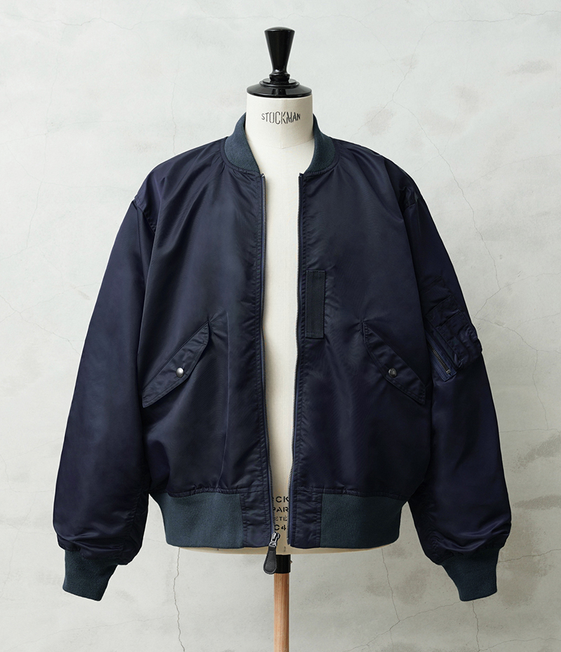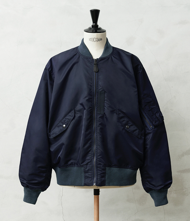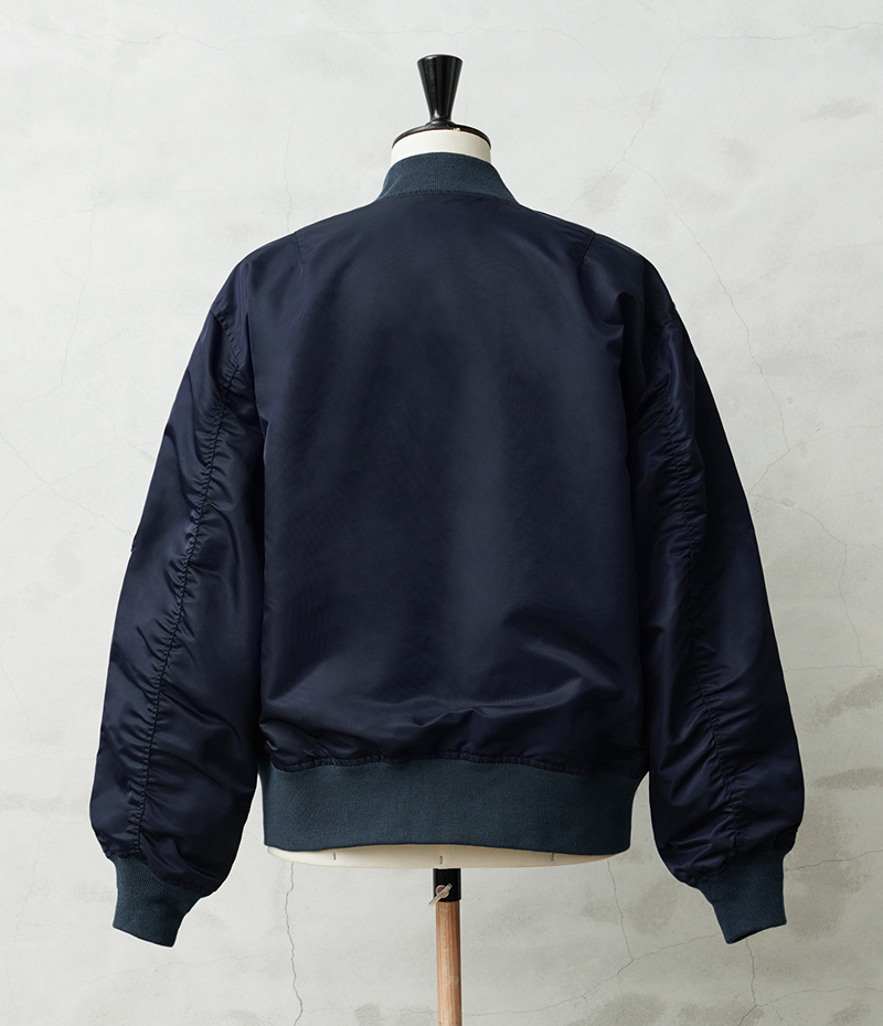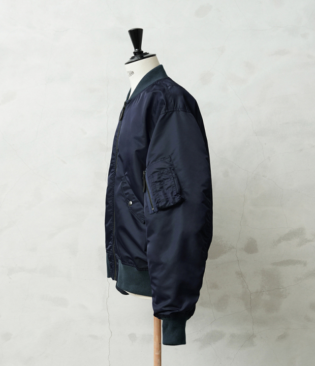 1945年にA-2の後継として登場したL-2は、ライト・ゾーン(10℃~30℃)と呼ばれる温度域での着用が想定された軽量なフライトジャケット。MA-1など一般的なフライトジャケットは防寒用の中綿が詰まっているのに対し、ゴワつきの無いスッキリとしたシルエットが特徴です。 WAIPER.incでは、当時のフライトジャケットにみられるボディに比べて褪色したリブの色差を再現。こちらのモデルはL-2の特徴であるエポレットと裾の三角フラップを廃しシンプルに仕上げたカスタムモデルとなります。