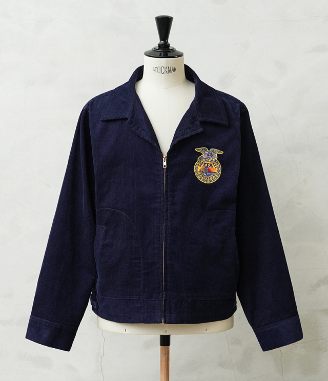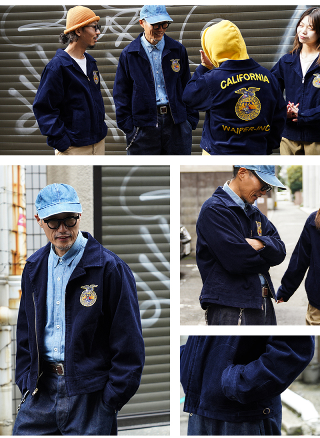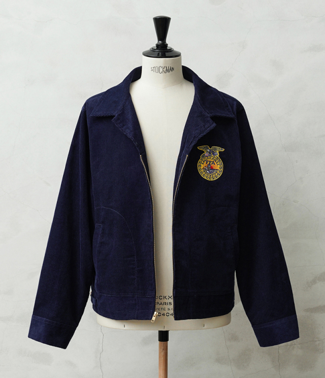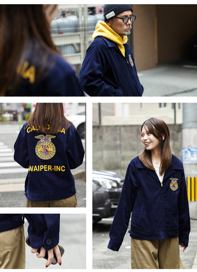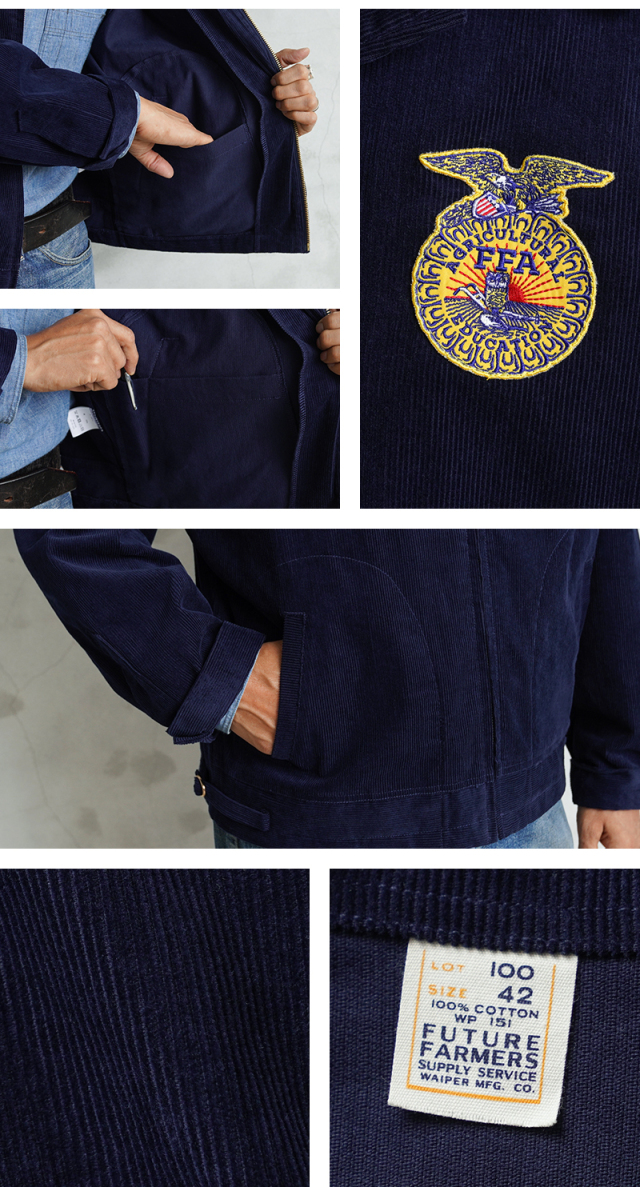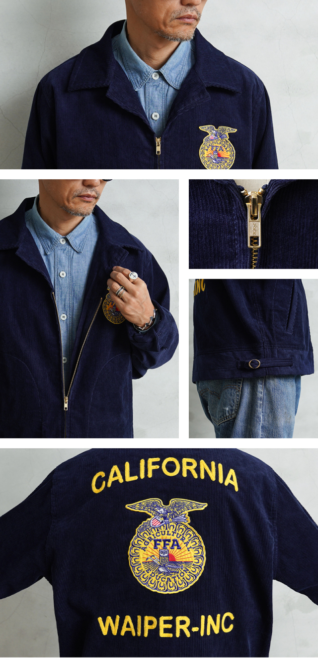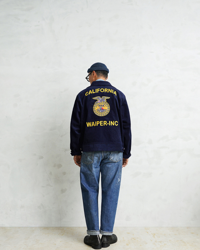 アメリカの農業教育を象徴する学生組織「FFA(Future Farmers of America)」のユニフォームとして知られる、通称“FFAジャケット”。 全米の農業高校生に愛用され、今なお伝統の象徴として受け継がれるアイテムです。 細畝のコーデュロイにアイコニックなワッペンとチェーン刺繍のデザインは、古き良きアメリカのワークウェアを彷彿とさせる古着市場でも人気のアイテムです。 ボディには深みのあるネイビーブルーのコーデュロイを使用。 背面にはチェーンステッチによる州名とスクール名、そして象徴的な“FFAエンブレム”が大胆に配置され、クラシックな存在感を放ちます。 WAIPER.incでは背面にブランドロゴを落とし込むことでオリジナリティーを表現。 実物と遜色ないチェーン刺繍は一見見分けのつかない完成度の高さを誇ります。