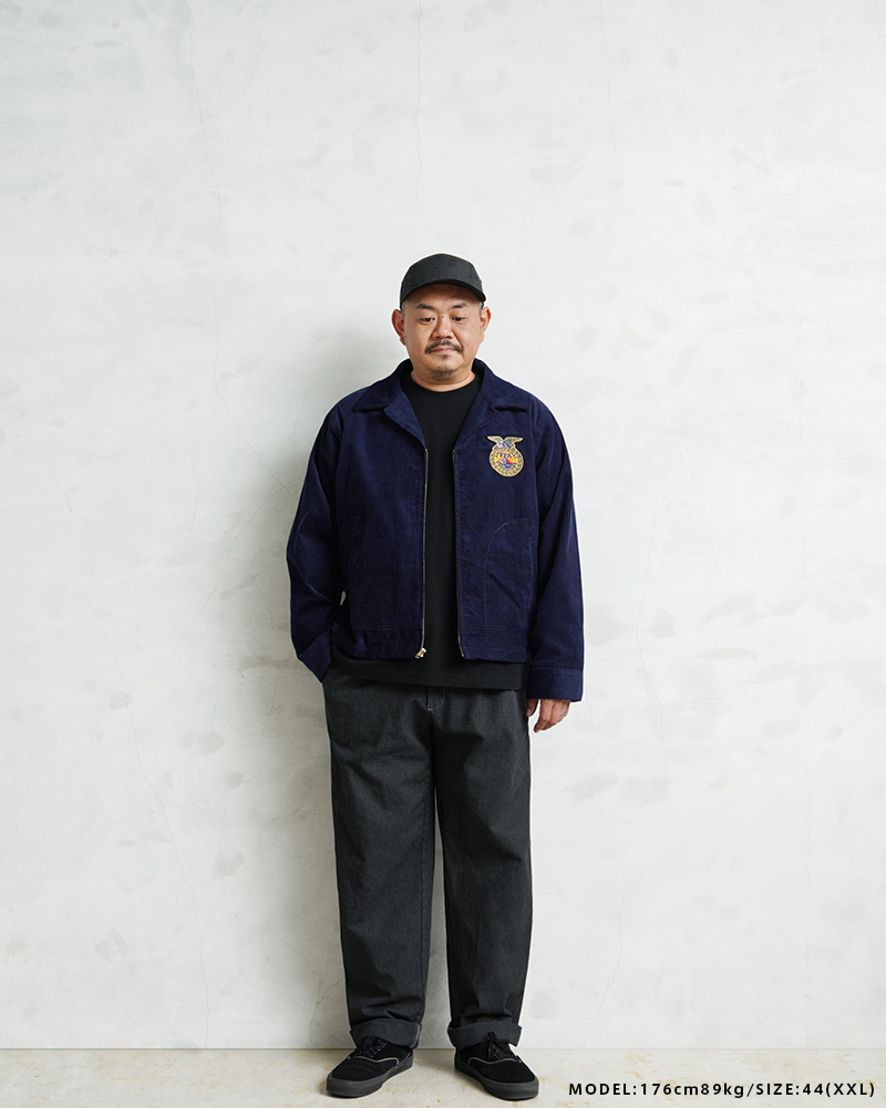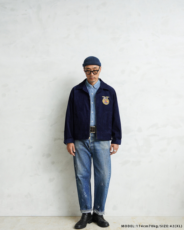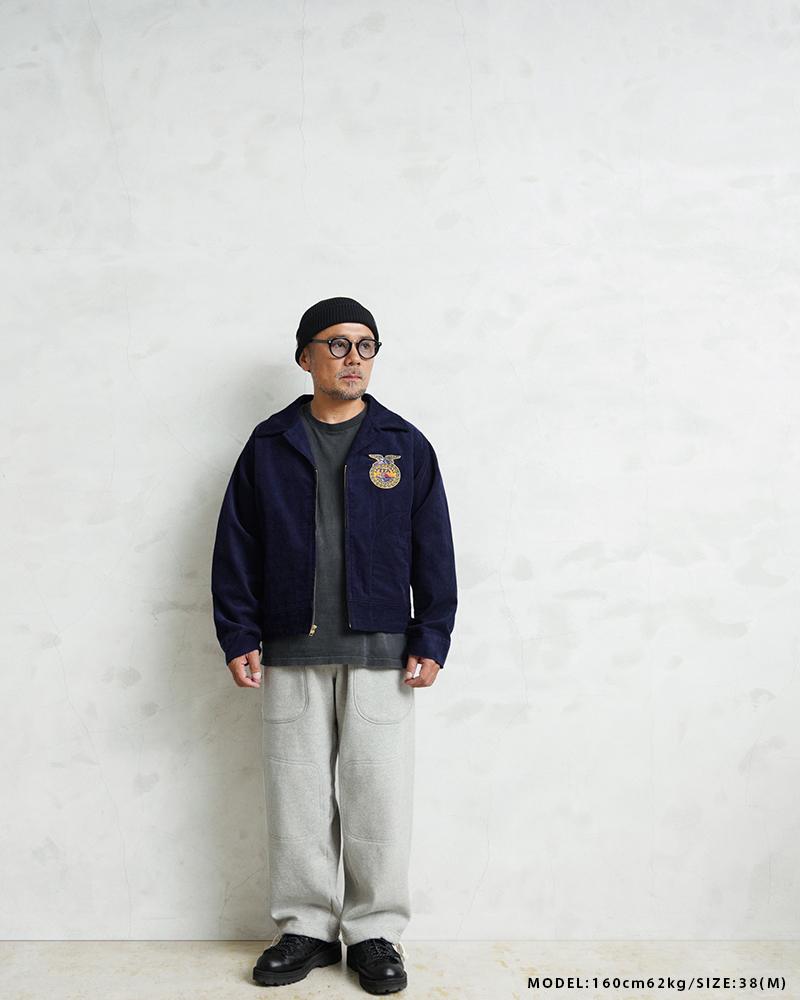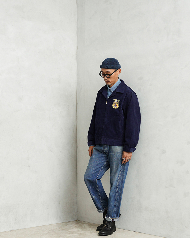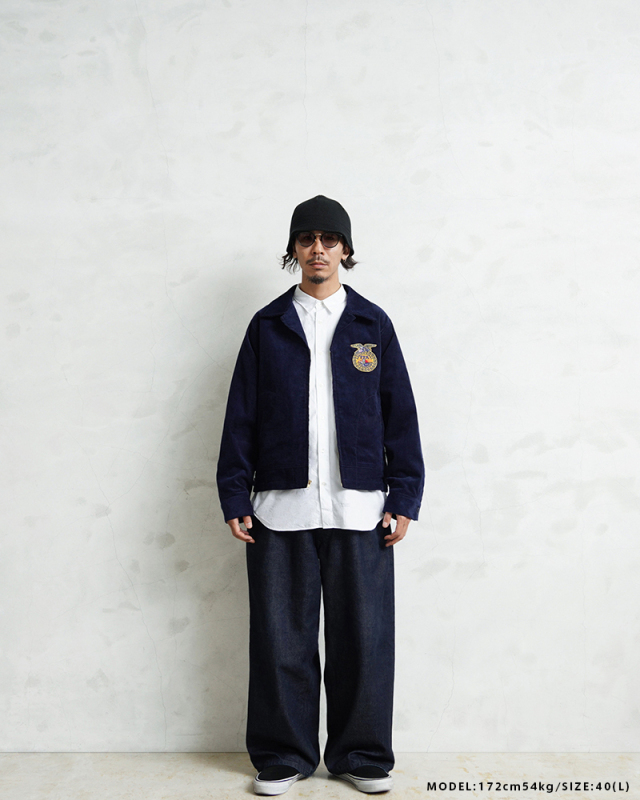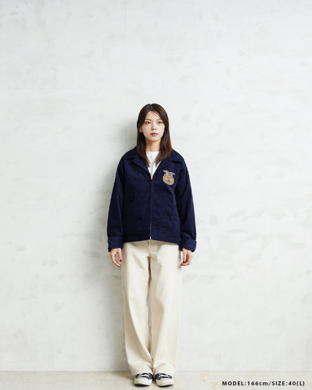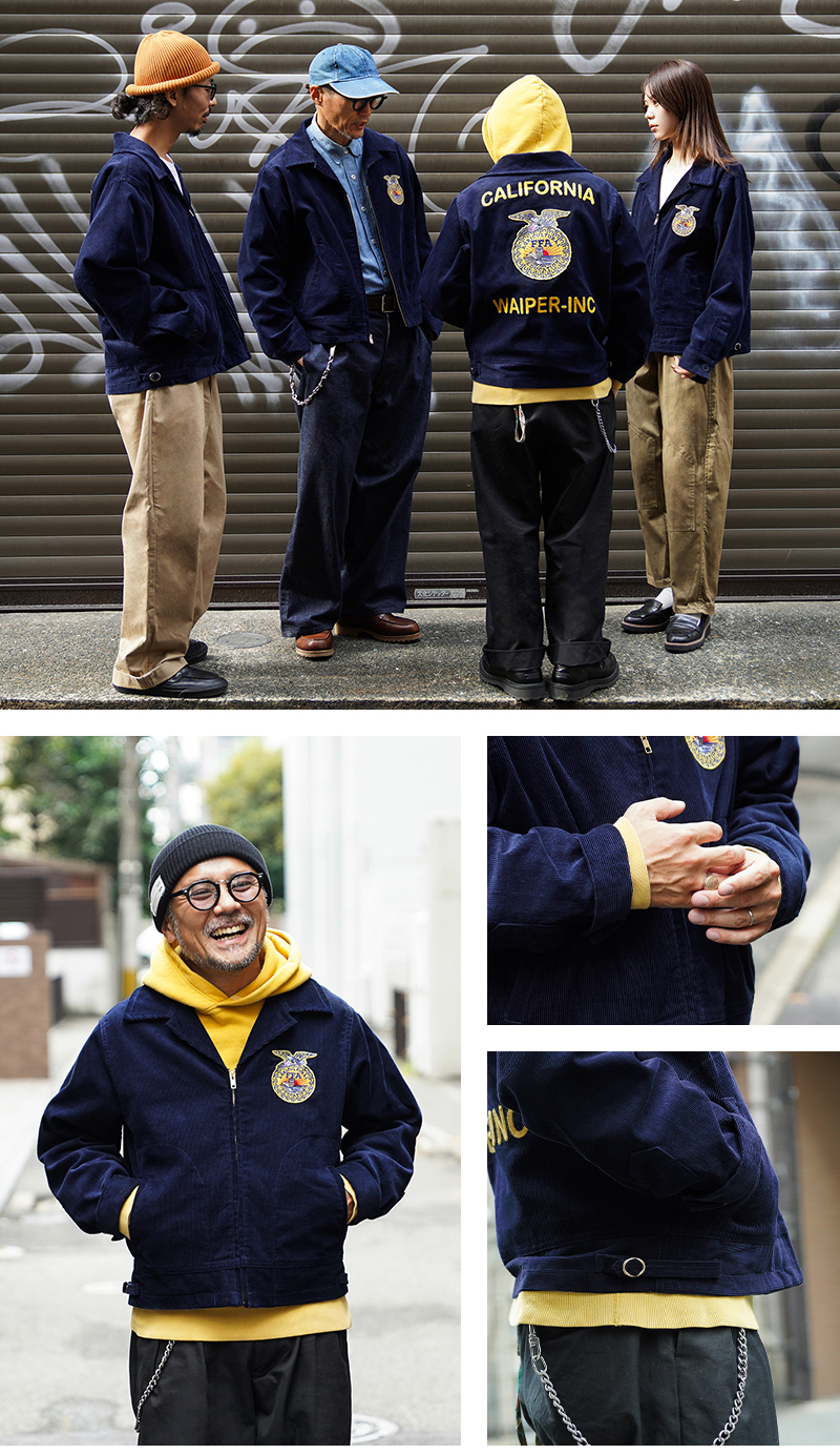 アメリカの農業教育を象徴する学生組織「FFA(Future Farmers of America)」のユニフォームとして知られる、通称“FFAジャケット”。 全米の農業高校生に愛用され、今なお伝統の象徴として受け継がれるアイテムです。 細畝のコーデュロイにアイコニックなワッペンとチェーン刺繍のデザインは、古き良きアメリカのワークウェアを彷彿とさせる古着市場でも人気のアイテムです。 ボディには深みのあるネイビーブルーのコーデュロイを使用。 背面にはチェーンステッチによる州名とスクール名、そして象徴的な“FFAエンブレム”が大胆に配置され、クラシックな存在感を放ちます。 WAIPER.incでは背面にブランドロゴを落とし込むことでオリジナリティーを表現。 実物と遜色ないチェーン刺繍は一見見分けのつかない完成度の高さを誇ります。