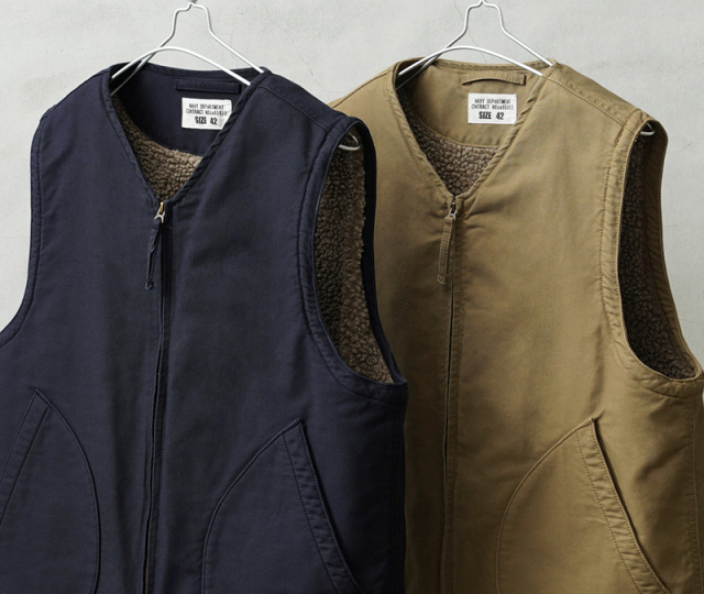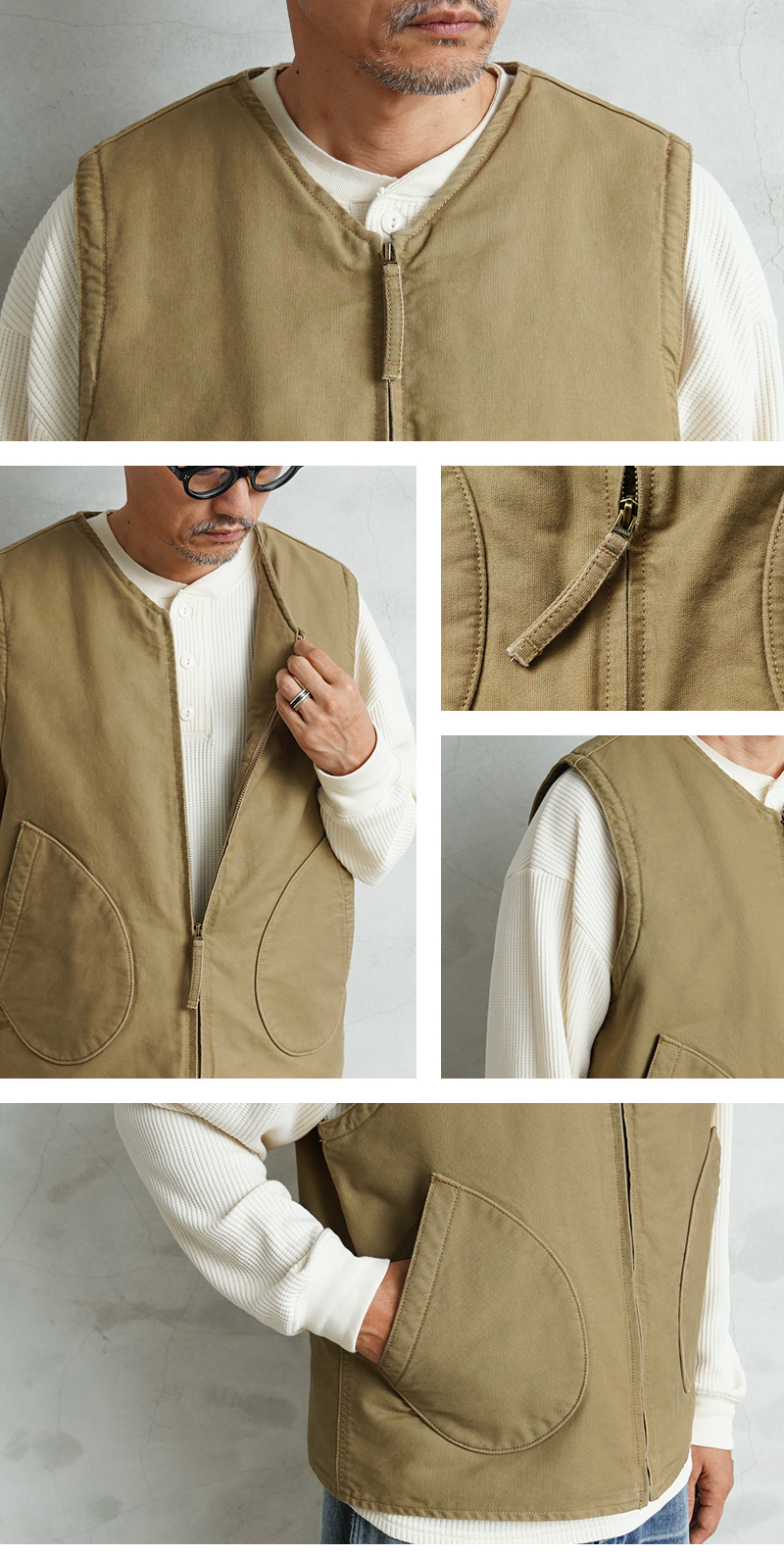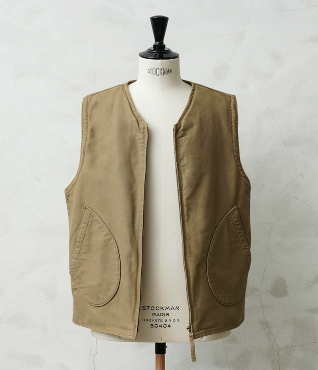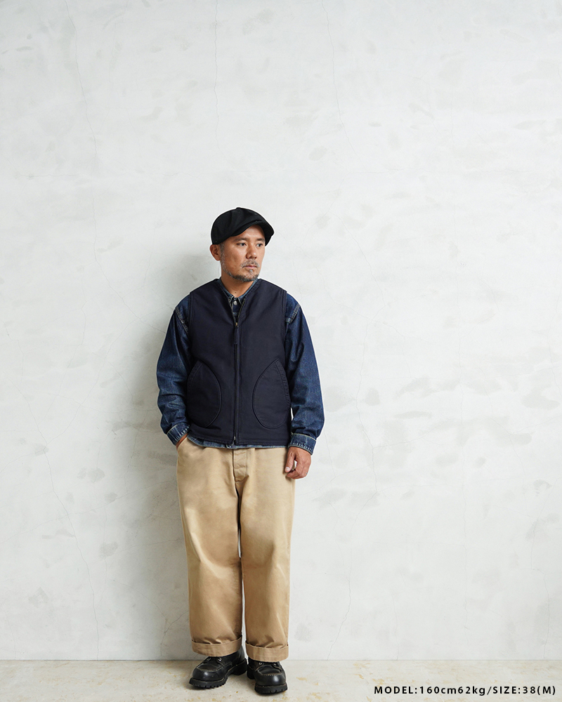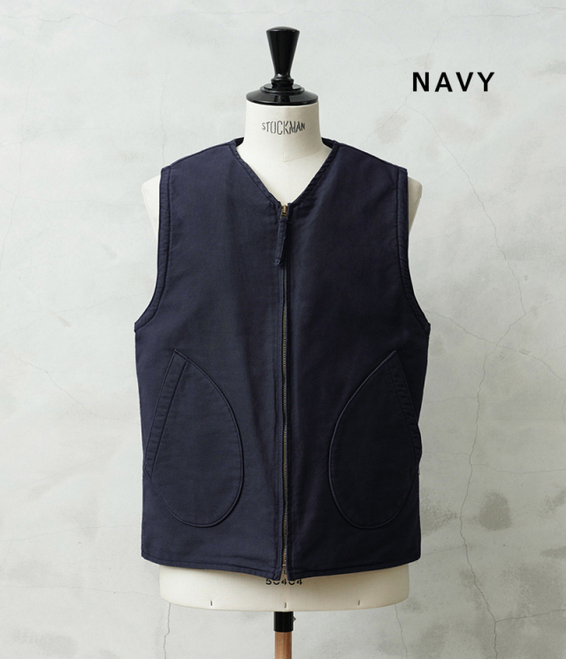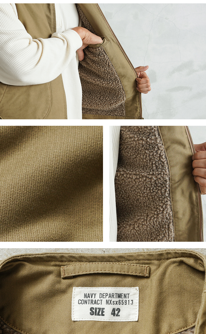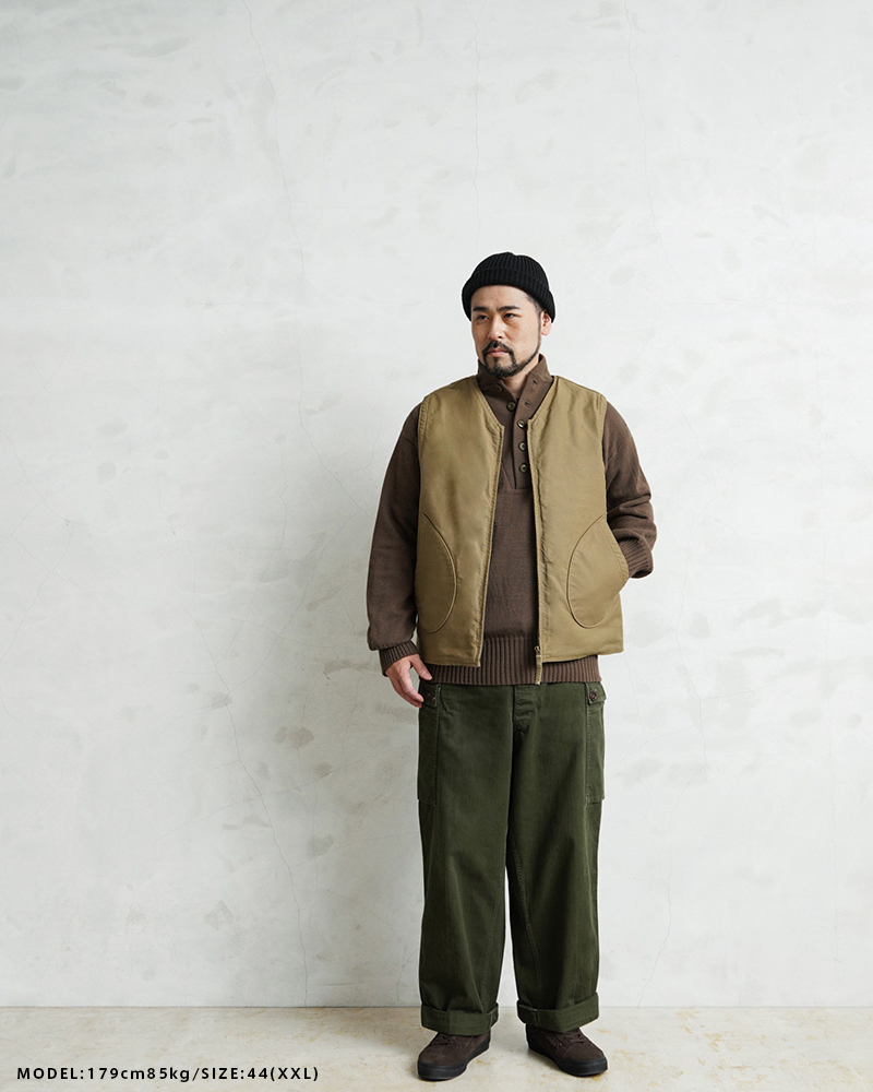 米海軍(U.S.NAVY)が生んだ傑作として名高い「N-1デッキジャケット」。 同じ素材を用いた40年代に存在したベストを製作しました。 デッキベストという名が示すとおり、アメリカ海軍の甲板作業用として採用されたミリタリーウェア。 N-1と同様に冬の海上における猛烈な寒さに耐えられるようにデザインされた堅牢な素材はタフな生地と防寒性を両立します。