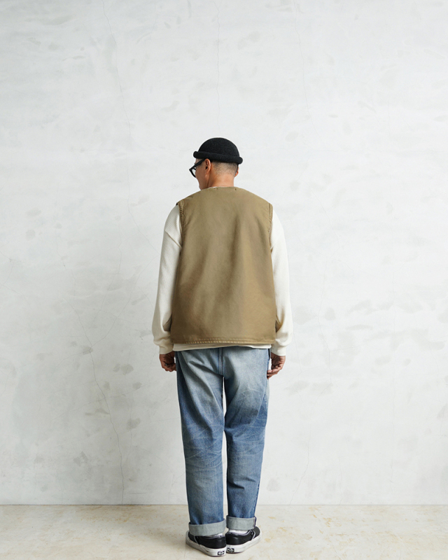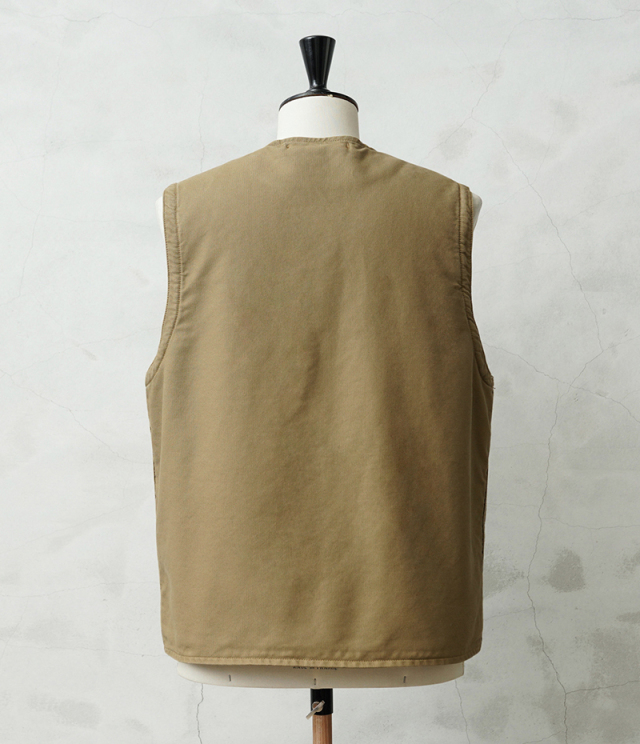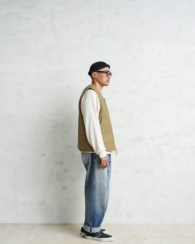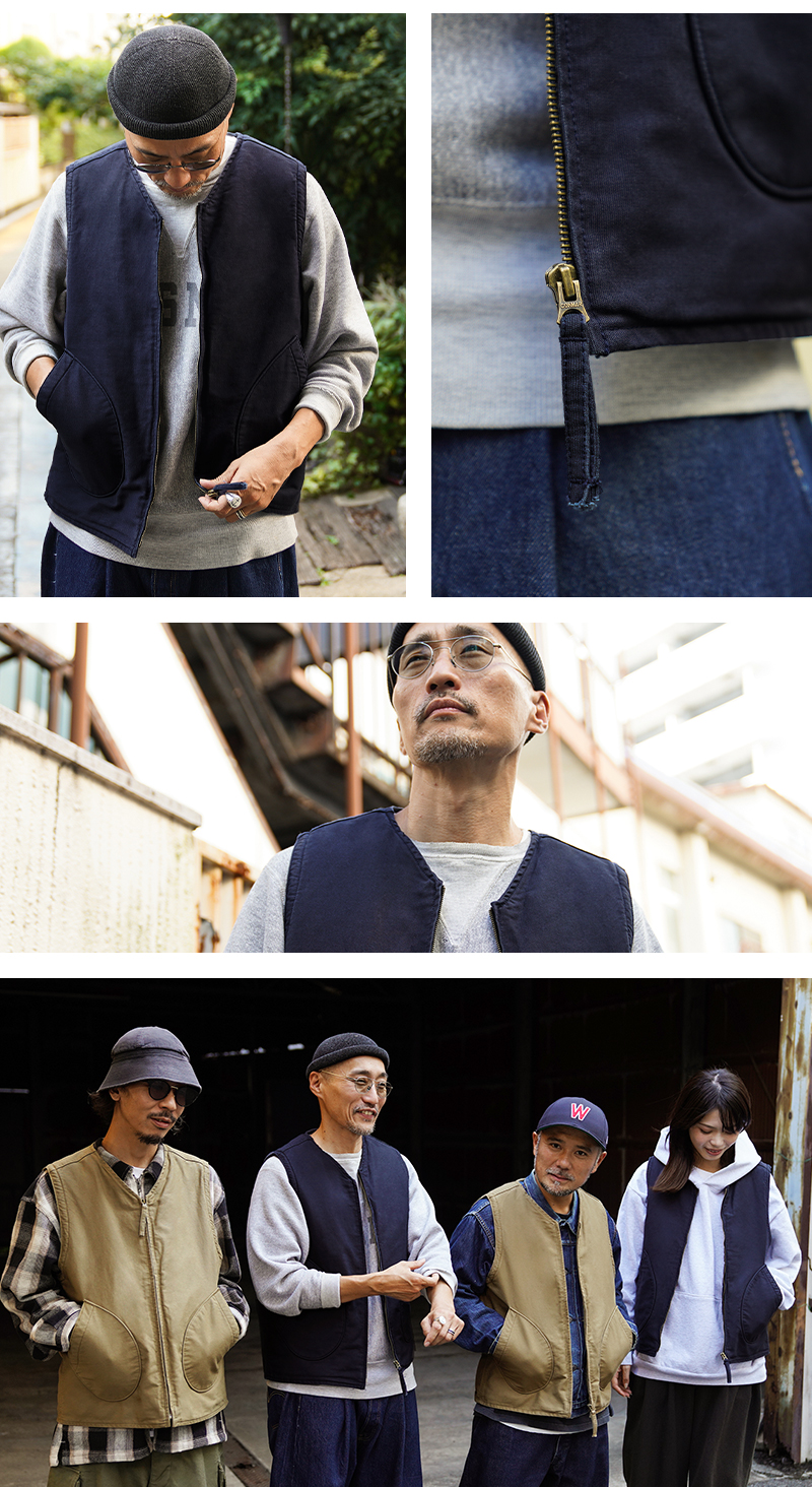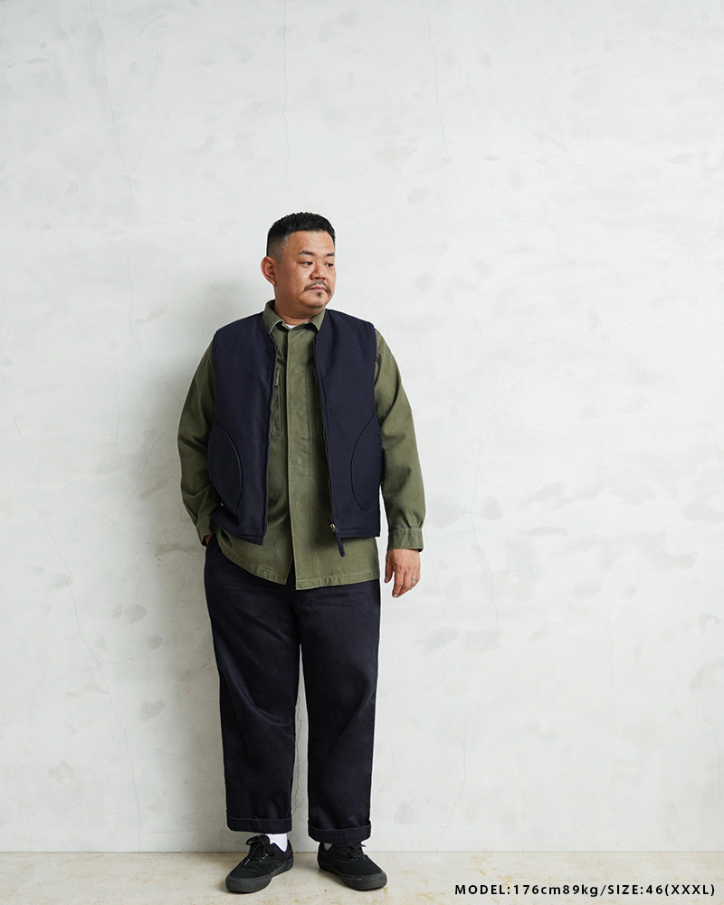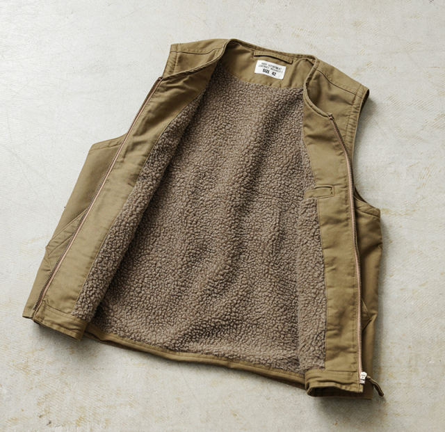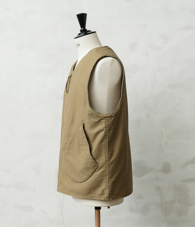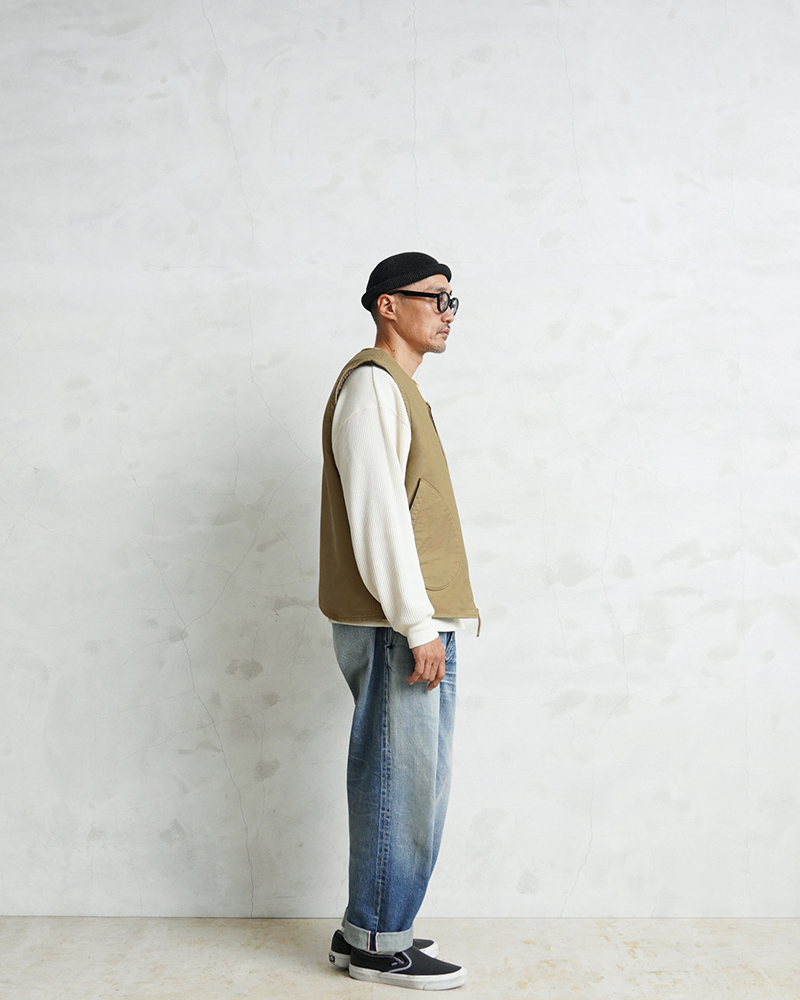 米海軍(U.S.NAVY)が生んだ傑作として名高い「N-1デッキジャケット」。 同じ素材を用いた40年代に存在したベストを製作しました。 デッキベストという名が示すとおり、アメリカ海軍の甲板作業用として採用されたミリタリーウェア。 N-1と同様に冬の海上における猛烈な寒さに耐えられるようにデザインされた堅牢な素材はタフな生地と防寒性を両立します。