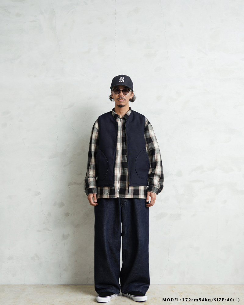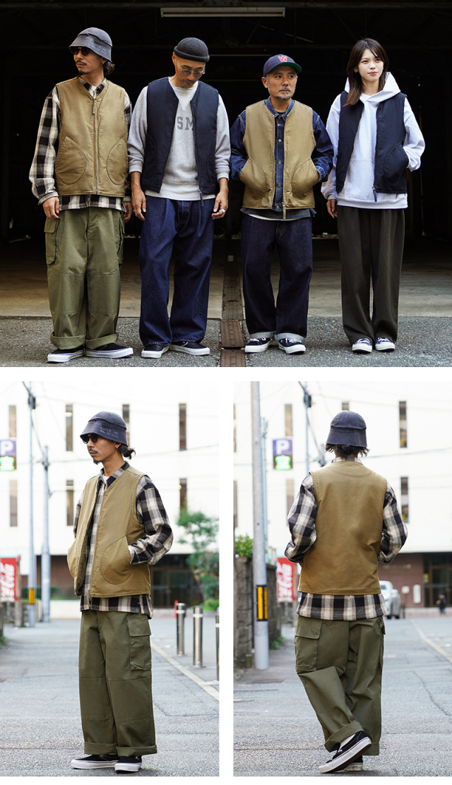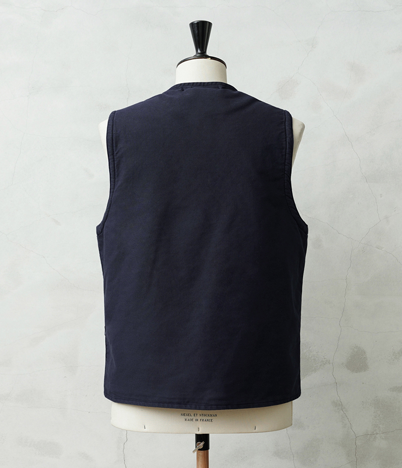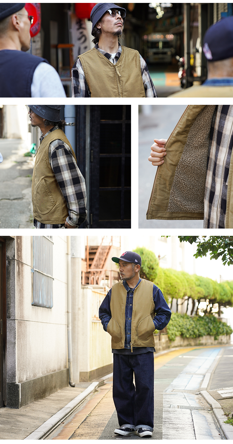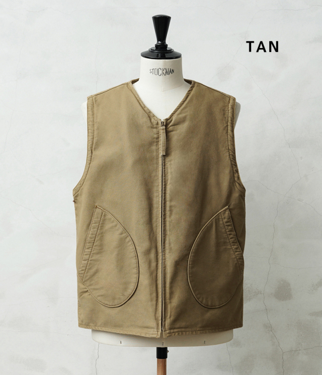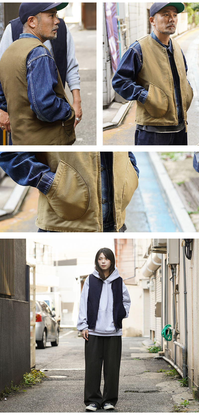 米海軍(U.S.NAVY)が生んだ傑作として名高い「N-1デッキジャケット」。 同じ素材を用いた40年代に存在したベストを製作しました。 デッキベストという名が示すとおり、アメリカ海軍の甲板作業用として採用されたミリタリーウェア。 N-1と同様に冬の海上における猛烈な寒さに耐えられるようにデザインされた堅牢な素材はタフな生地と防寒性を両立します。