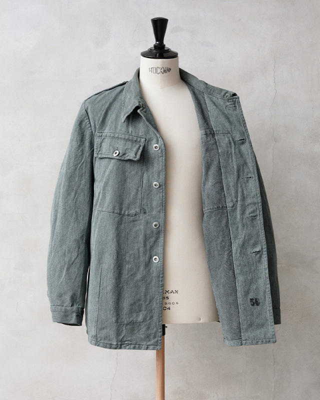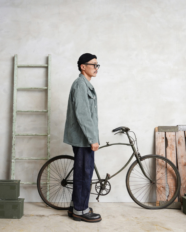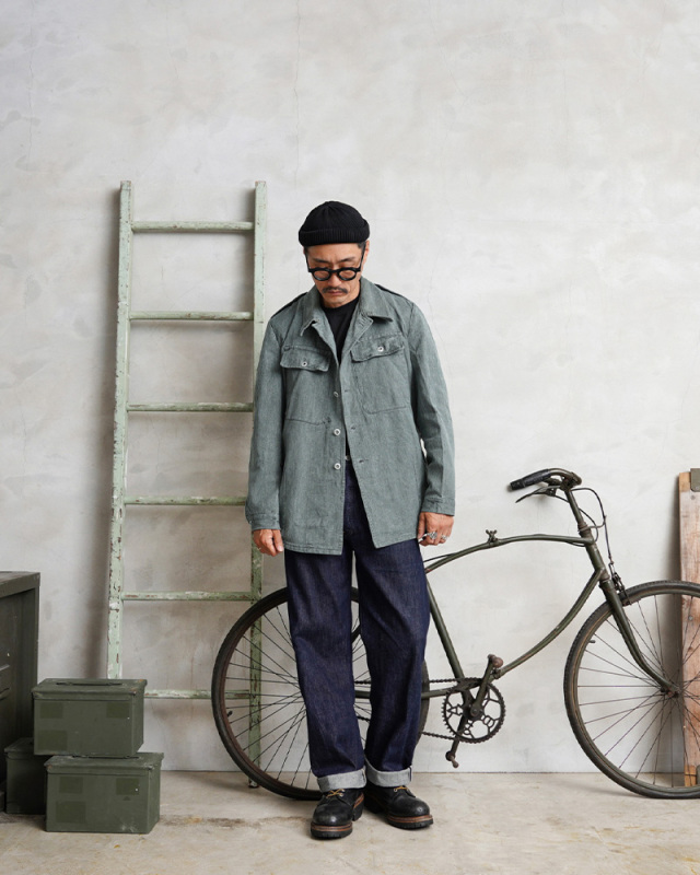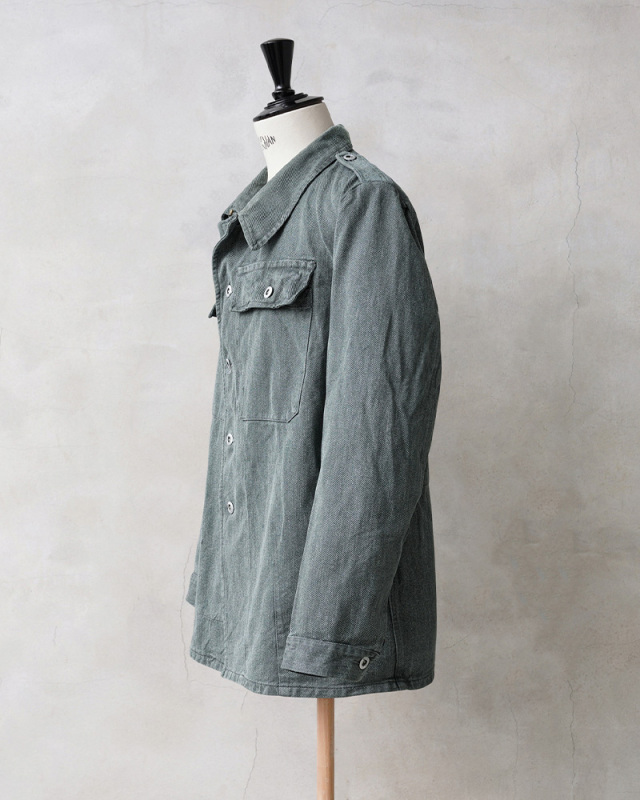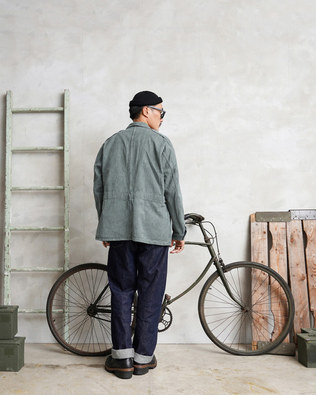 グリーンやブルーがかったグレーの絶妙な色目が特徴のデニム生地が使用されているワークジャケットで、独特な雰囲気を醸し出している一着です。デニムカバーオールのような感覚で着用したくなるデザインで、ワーク、アウトドアなどカジュアルなスタイルにハマるアイテムです。