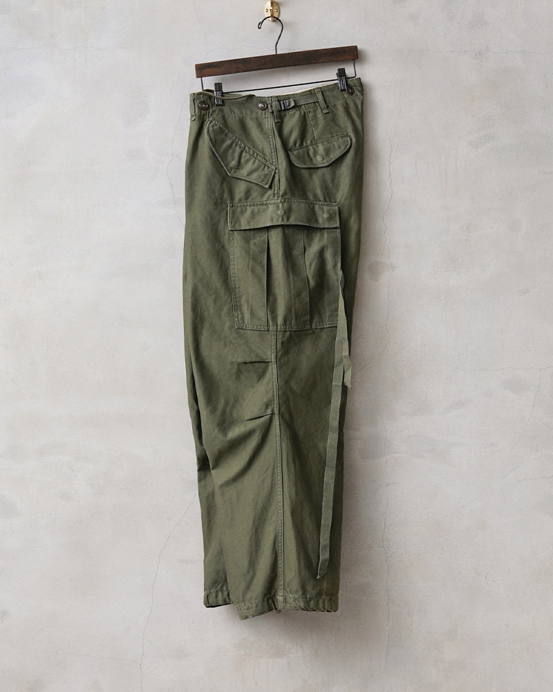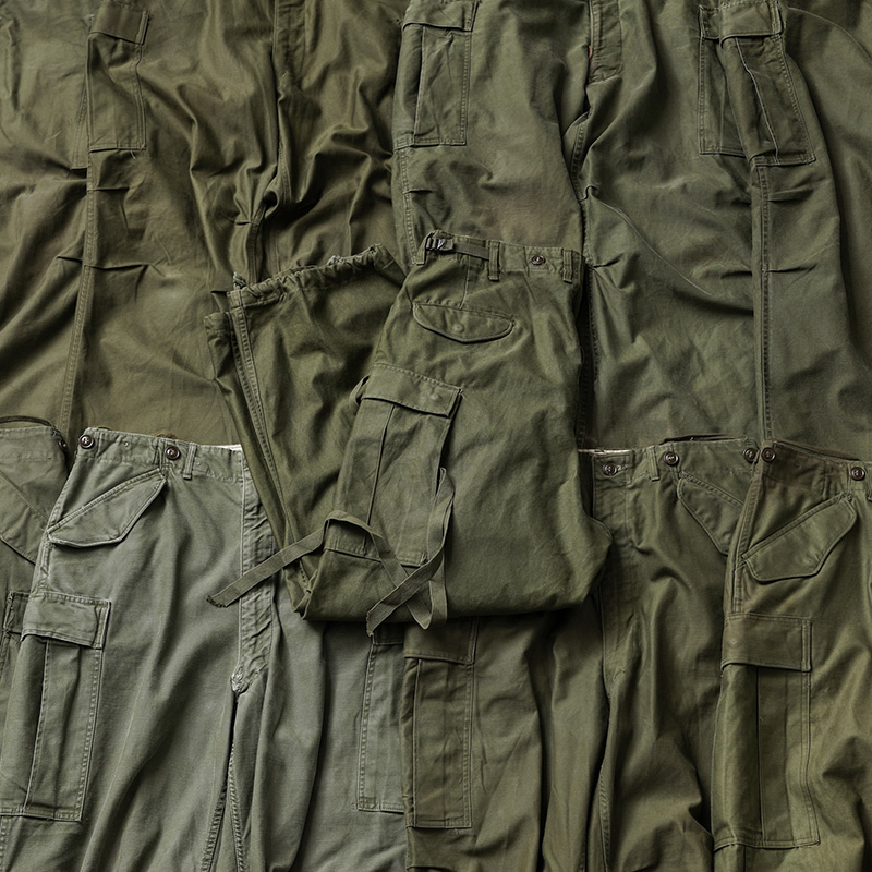 | 商品説明 | 実物 USED 米軍 M-51 フィールドカーゴパンツのご紹介です。 正式名称:TROUSERS SHELL, FIELD, M-1951 放出される機会自体がほとんど無くなった希少な名作トラウザーであるM-51フィールドカーゴパンツ。現在のカーゴパンツの原型とも言われ、M-65カーゴパンツよりも希少性の高いアイテムが極少量のみで入荷しました! U.S.ミリタリーカーゴの代表作といっても良いパンツで、ウエスト&サスペンダー用のボタンには、この年代のUSモノ特有のリブ付きのボタンが使用されており、サイドのシームはもちろん、ダブルの巻き縫い仕様。 ドローコードは平紐のノンパイプ仕様で、生地には雰囲気抜群なコットンサテンを使用しているヴィンテージの魅力が詰まったアイテムです!シルエットは太めで、今、求められているサイズ感で、清潔感のあるトップスと合わせたら非常にかっこよく着用していただけます。半世紀以上も前に作られたのにも関わらず今見ても存在感が他とは一線を画す商品です。 本当に希少で久々に入手しましたし、近年数が減り状態がよい物や日本人に合う物がなく、今後の入荷は無いといっても良いほどです。当店でも復刻版も扱っていますがこちらは正真正銘、本物の実物米軍M-51フィールドカーゴパンツです。この機会にぜひ本物のヴィンテージミリタリーを手にして下さい。 ディテール ・米軍実物放出品 ・フラップ付きサイドポケット×2 ・フラップ付きバックポケット×2 ・モモ部ボタン式フラップ付きラージカーゴポケット×2 ・シーム巻き込みダブルステッチ縫製 ・ベルトループ ・ウエストアジャスター ・ジッパーフライ ・スソ部ドローコード |