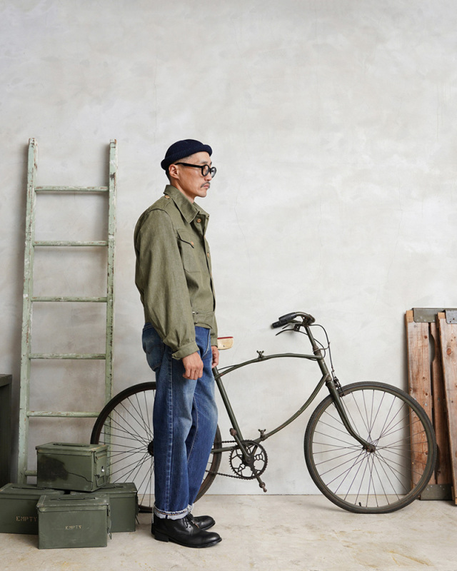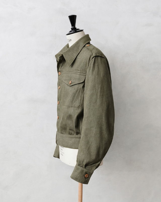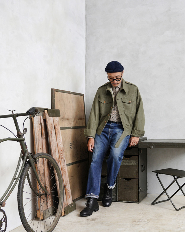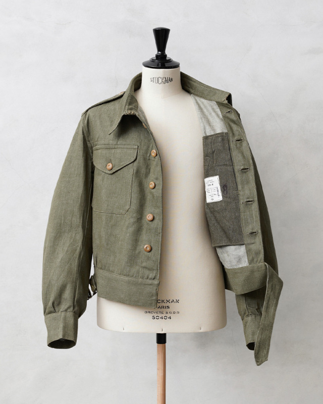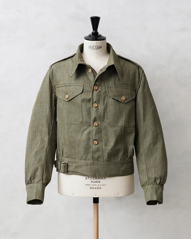 | 商品説明 | 実物 新品 デッドストック イギリス軍 1950年代製 ヴィンテージ グリーンデニム ジャケットのご紹介です。 制式名称:OVERALLS DENIM BLOUSES イギリス軍で1950年代に採用されていたグリーンデニムジャケット。名前の通り特徴的なカラーデニムは、イギリス軍特有のアイテムで近年は放出も少なくなった印象ですが、まとまった数がデッドストックで入荷しました。 今回の入荷分は、バックルとボタンが付属していなかったため、実物のバックルをサンプリングし同等のものを再現、製作いたしました。ボタンに関してはクリップで取り外しが可能なチェンジボタン仕様となっており、入荷時には取り付けられていなかったボタンについてもデッドストックの実物のボタンを探し出すことに成功。それぞれ取り付けを行った状態で販売をさせていただきます。 デザインに関しては年代の近いイギリス軍の 「BLOUSE BATTLE DRESS 1949Pattern」に酷似しており、ショート丈のジャケットはこの時期で広く採用されていたことを感じさせます。BATTLE DRESS(バトルドレス)は第2次世界大戦の開戦直前にイギリス陸軍に導入され、1960年代まで着用されていました。一部では1970年代にも使用されていたようです。他国にも多大な影響を与えたデザインは戦中、戦後にもイギリス軍より得られたデザインから独自のバリエーションのバトルドレスが各国に導入されました。 素材には左綾で織られたカラーデニムを使用。デッドストックを洗濯したところほぼ縮みもなく、生地も柔らかく風合いも増すため洗濯して着用するのもおすすめです。 半世紀以上前のデッドストックのヴィンテージアイテムとして、着用していただくのはもちろん、コレクターアイテムとしても大変おすすめな一着となっています。 ※洗濯機をご使用頂く際は、生地の傷み・ボタンの割れを防ぐためバックル・チェンジボタンを取り外した状態でのお洗濯をお願いいたします。 |