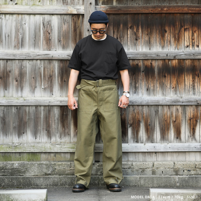 | モデルコメント | (174cm/70kg 着用サイズ:1) 普段デニムは32~33インチを着用しています。タックインで少し大きく感じましたがベルトを締めれば問題なく履けました。 (174cm/65kg 着用サイズ:2) 普段デニムは30インチを着用しています。ウエスト幅はオーバーサイズですが、グルカタイプのベルトなので、かなり締めても違和感なく着用できました。 (176cm/71kg 着用サイズ:1) 普段デニムは32インチを着用しています。ベルト調整が大幅に可能なのでタックインはしてませんが問題なく着用できました。 |