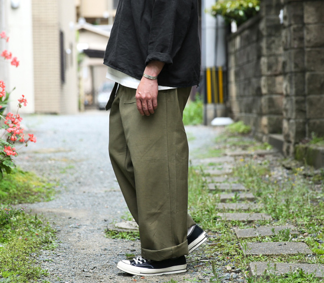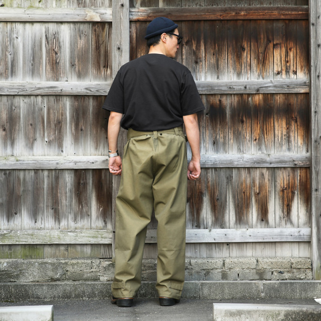 | 商品説明 | 実物 新品 フランス軍 1940-50’s M-38 ヴィンテージ モーターサイクルパンツのご紹介です。 1940年代から50年代にかけてフランス軍のバイク部隊で使用されていたモーターサイクルパンツになります。探されている方も多く、デッドストックでの個体はあまりお目にかかれないレアな逸品です。 数あるミリタリーパンツの中でも、かなり独特な雰囲気を醸し出すアイテム。おそらくリネン混と思われる重厚感のある生地感でかなり存在感があります。オーバーパンツのためサイドポケットは貫通式。こちらは裏から生地を張ったり、スパッツや薄手のショーツと合わせる方も多いようです。フロント両サイドにはパッチポケット付き。ウエストはグルカパンツのようにベルトで締めるデザインになっており、タックインでの着用も大変オススメ。裾部分はストラップで絞れる仕様になっており、ワイドなシルエットはロールアップにも向いています。 ボタンなどディティールの個体差、長期保管による生地の退色や多少の汚れ、金属部品からのサビなどがございますが、前述致しました通りデッドストックでのご紹介はかなり希少です。一本一本表情が異なり、それぞれが希少な1点モノ。ヴィンテージミリタリーの魅力、深みと味わいを存分にお楽しみいただけるスペシャルアイテムです。 |