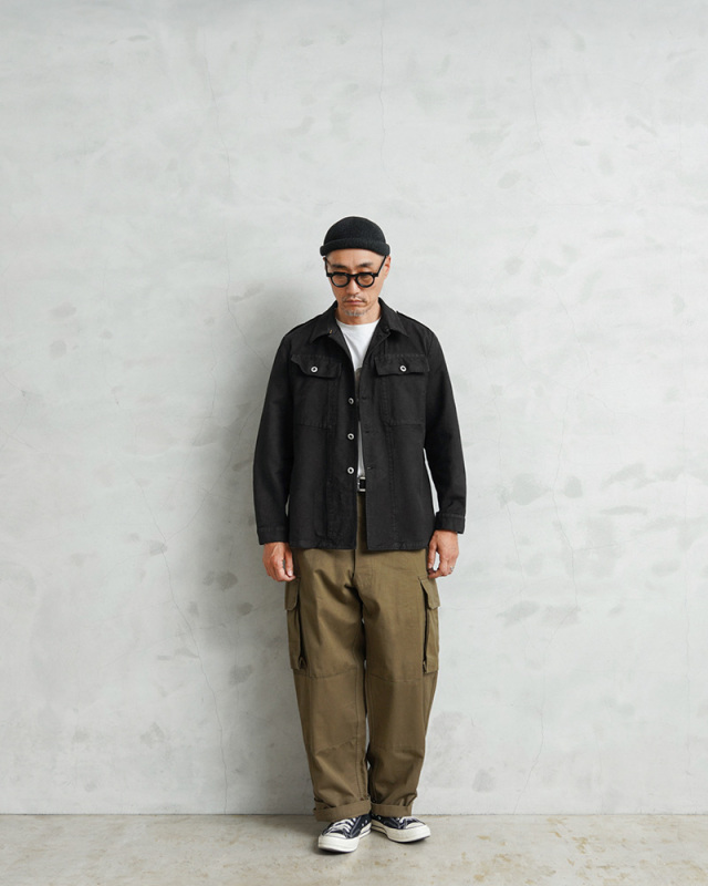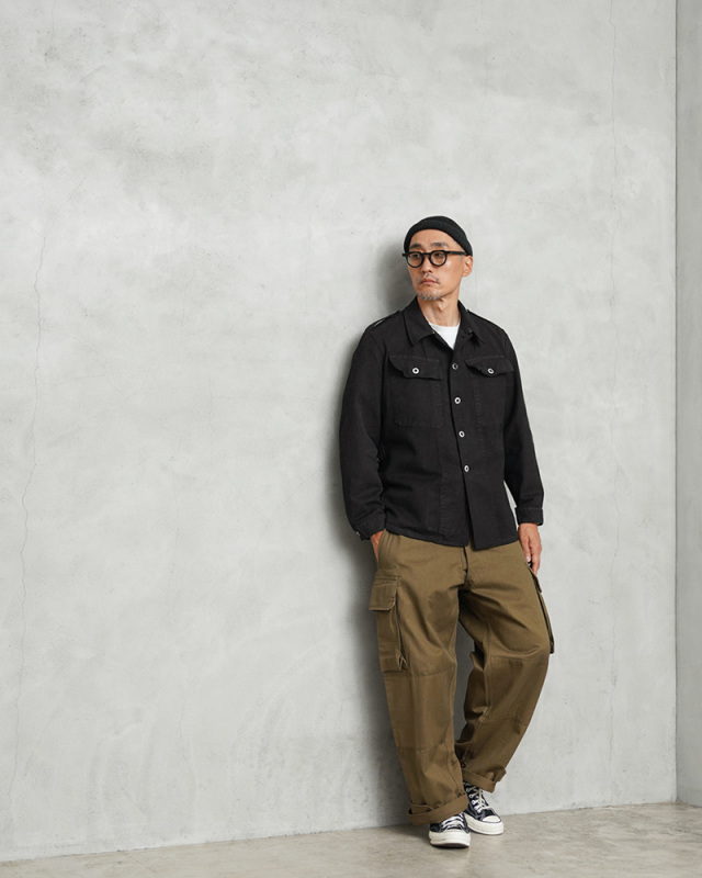 | 商品説明 | スイス軍より放出されたデニム素材のワークジャケットにBLACK染めを施しました! ヴィンテージのワークジャケットにオーバーダイ(後染め)することで現代の既製品には出せない絶妙なブラックデニムに仕上がっています。デニムカバーオールのような感覚で着用したくなるデザインで、ワーク、アウトドアなどカジュアルなスタイルにハマるアイテムです。 パトロールジャケットやプリズンジャケットなどとも呼ばれているアイテムで、年代の古さを感じさせるハリのあるガッシリとした質感のヘビーオンスのデニム生地なので、着込めば着込むほどに味わい深く変化するおすすめのアイテムで、新品には出せない生地のアタリやヤレ感が抜群のジャケットです。 ボタンには主に金属製のアルミボタンが使用された前期型で、フロントには2箇所のフラップポケット、前立て裏には6.1インチの一般的なスマートフォンがすっぽり入る便利なポケットが付属しています。 ウエストの内側には絞り具合を調節できるコットン製のドローコードが内蔵されています。ウエストの左右には装備品のベルトが下がるのを防ぐブラス製のベルトフックが備わっています。程よく色落ちした独特な色目のデニムワークジャケットは、普段の着こなしに羽織るだけで雰囲気の良くなる希少なミリタリージャケットです。 |