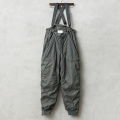 | 商品説明 | 実物 新品 デッドストック 米軍 U.S.A.F. F-1B フライトパンツ サスペンダー付きのご紹介です。 制式名称:TROUSERS,EXTREME COLD WEATHER,TYPE F-1B EXTREME COLD WEATHER(エクストリーム コールド ウェザー)と記載のあるように、極寒地での使用を目的に開発された、 N-3Bの下に合わせるモデルとしても有名な、米空軍で使用された中綿入りの防寒オーバーパンツです。見た目通り重量感たっぷりでとても高い保温力を誇ります。 ウエストはサスペンダーで吊るす方式で、ウエストの部分には調節用のアジャスターが付属しています。裾はリブ仕様になっており、足下からの冷気を防ぐと同時に、サイドのジッパーにより防寒ブーツなどの着脱も容易となっております。2つ備わったバックポケットはフラップ付きでベルクロで開閉します。サイドのポケットはオーバーパンツのため、中のパンツにアクセス出来るよう貫通式になります。 耐久性が非常に優れたミルスペック準拠の金属ジッパーを使用、グローブ着用のままでも開閉を行いやすい大型のジッパータブ、膝やヒップは二重に補強がされた過酷な着用場面を想定した堅牢なつくりになっています。 サスペンダー付きで中綿入りのオーバーパンツということで防寒性は抜群!パンツのシルエット自体も良いため、バイクに乗る時などの防寒性を高めたいときのファッションとしてもおすすめです。 優れた機能性・ディテール・デザイン性はバイカー、アウトドア、フィッシングなど様々な場面で活躍できますので1本持っておくと心強いアイテムです。希少な放出ですのでこの機会に是非どうぞ。 |