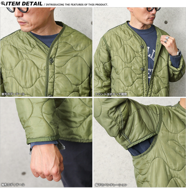 | 商品説明 | 実物 USED 米軍 M-65 フィールドジャケット用ライナー フロントボタン付タイプのご紹介です。 制式名称:LINER,COLD WEATHER COAT 米軍より放出されたM-65フィールドジャケット用のキルティングライナーです。 M-65フィールドジャケットは、このキルティングライナーを装着する事によってその防寒性を100%発揮します。素材には軽量なナイロンが使用されおり、中綿入りのオニオンキルティングが見た目からは想像できないほど軽く保温性に優れています。 多くのファッションブランドでも、ライナーをサンプリングしたライナージャケットを多数リリースしていますし、近年ではそのデザイン性の高さ、機能性、保温性の高さからライナーをキルティングジャケットとして着用したり、ワッペンでカスタマイズしたりとリメイクのボディーとして使用されているものも多く目にします。性別を問わずアイデア次第で様々な着こなしが出来る面白いアイテムです。 |