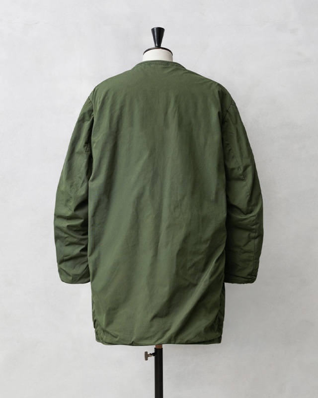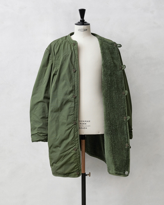 ステンシルの刻印は1967年製でした。 ライナー単体でも成立してしまうほど完成度が高い。 着用感はボアの密度が高く表地もあるので少し固めな印象。 サイズ感は厚手のパーカーの上から羽織ってジャストサイズ。 ライナー単体でユッタリ着たいならC50もありだが、 肩幅が合っていないと重く感じるかもしれない。 |