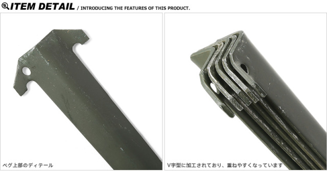 | 商品説明 | 実物 米軍 テントペグ LONG OD USED 5本セットのご紹介です。 米軍で使用されていた、テント用のアルミペグです。 いわゆるV字ペグと呼ばれるタイプで、比較的簡単に地面へ刺すことが可能です。また接地面が広いため、しっかりと地面に食い込みます。V字ペグは重ねて収納する事が出来るため、持ち運びにも便利です。 ミリタリーらしいカラーリングで雰囲気があり、マットな質感です。非常に強度と耐久性のある実際に米軍で使用されていただけあって、使い勝手の良いアウトドアアイテムです。 |